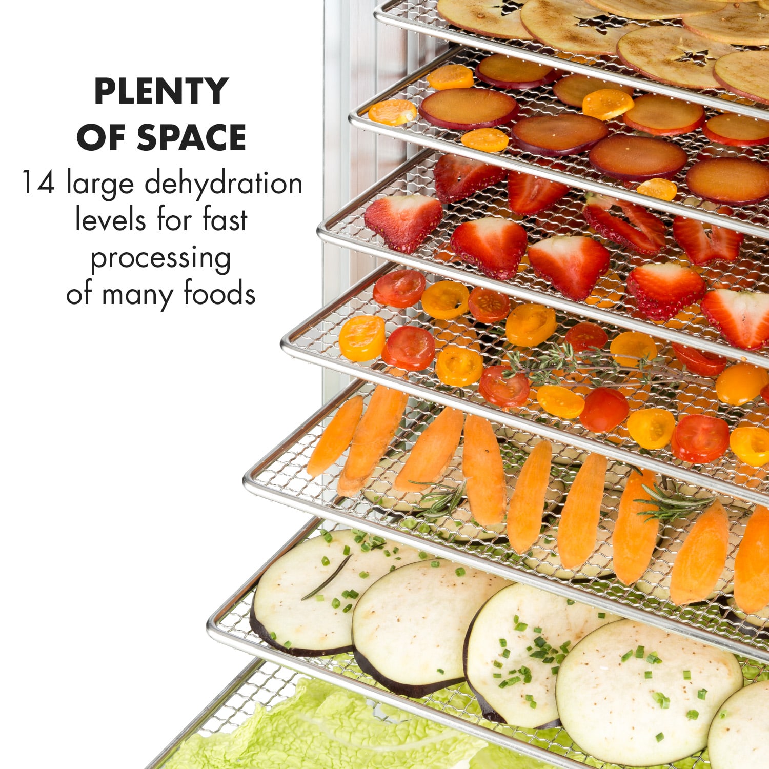 Zdravé a chutné občerstvenie vo veľkých množstvách: So sušičkou Klarstein Fruit Jerky 14 Sušička potravín môžete potraviny sušiť rýchlo a jednoducho na 14 policiach. Či už sušíte ovocie, zeleninu, mäso alebo bylinky – konvekčná sušička s výkonom 1000 W a teplotou od 30 do 70 °C šetrne odstraňuje vodu z potravín a zároveň ich konzervuje – bez akýchkoľvek prísad. Vďaka svojej veľkosti a výkonu sa sušička Fruit Jerky 14 výborne hodí aj na komerčné použitie. Výkonná, veľká a prehľadná: So sušičkou Klarstein Fruit Jerky 14 môžete v krátkom čase pripraviť veľké množstvo dehydrovaných potravín!