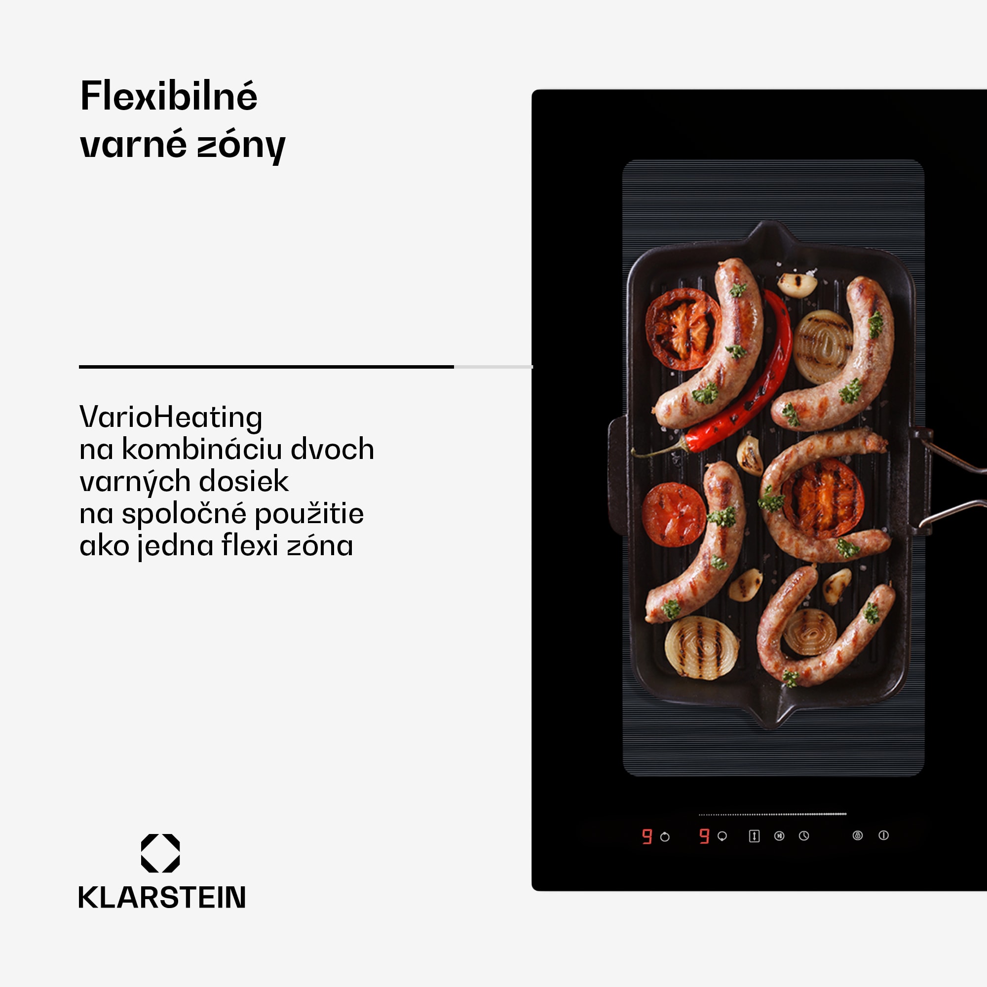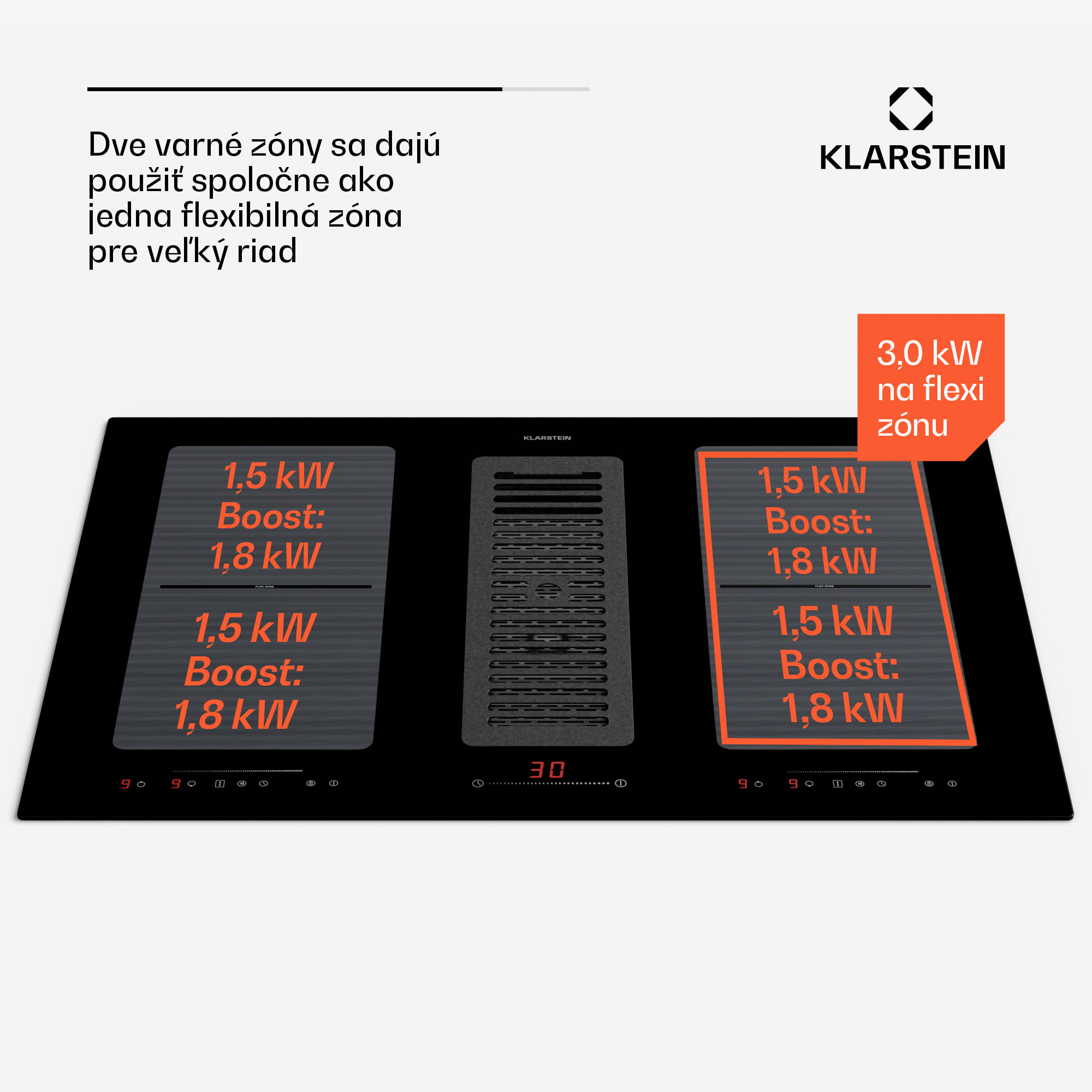Uprostred a nie len pri tom: Klarstein Full House 77 DownAir System spôsobí revolúciu vo vašej kuchyni! Kombinuje indukčnú varnú dosku priamo s DownAir digestorom. Para a zápach v kuchyni tak zmiznú už priamo tam, kde vznikajú.Indukčná varná doska Klarstein Full House 77 sa prezentuje štyrmi varnými zónami, vľavo a vpravo od integrovaného DownAir digestora. Dve varné zóny možno spojiť do jednej flexi zóny, ktorá poskytne potrebný priestor aj pre veľké hrnce a panvice. Každú varnú zónu možno nastaviť na 9 úrovní a disponujú funkciou ThermoBoost na zvýšenie výkonu pre veľmi rýchle varenie. Rozpoznanie hrnca, funkcia Stop and Go s ThermalRecall funkciou, rozpoznanie zvyškového tepla, detská poistka a funkcia udržiavania teploty dokonale dopĺňajú možnosti využitia varnej dosky.Odsávací systém DownAir s prietokom 477 m³/h je priamo súčasťou varnej plochy a odsáva paru a kuchynské výpary priamo smerom nadol. Prístupu k hrncom a panviciam nebráni žiadny samostatný digestor, takže systém je ideálny najmä do kuchynských ostrovčekov. Varná doska ako aj digestor sa obsluhujú pomocou dotykového ovládacieho panela SenseControl s osvetlenými posuvníkmi. Bezchybný sklokeramický povrch kompletného systému Full House 77 od Klarstein nenarúšajú žiadne tlačidlá.Užite si kuchyňu!Upozornenie: Odporúčame, aby montáž systému Klarstein Full House 77 Down Air System vykonával kvalifikovaný personál v súlade s návodom na obsluhu.