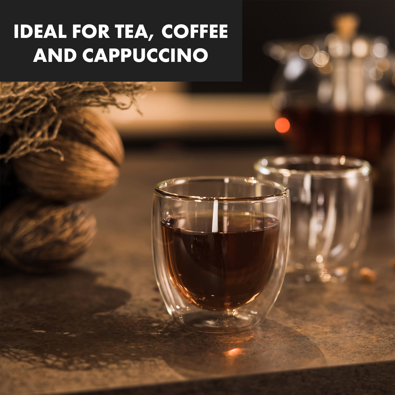 Rozmaznávaj svojich hostí: naservíruj im horúce latte macchiato alebo ľadovo studený kokteil. Vďaka pohárom Altino s dvojitým sklom od spoločnosti Klarstein bude každý nápoj jednoducho špeciálnym pôžitkom.Poháre presvedčia nielen svojou zvláštnou eleganciou, ale tiež všestrannosťou a inováciou. Izolačný účinok dvojitej steny chráni tvoje ruky pred horúcimi aj studenými teplotami a zároveň veľmi dlho udržiava teplotu nápoja. Ideálne na varené víno, kávu alebo kapučíno. Vďaka extrémne odolnému borosilikátovému sklu, ktoré sa pri teplotných výkyvoch rozpína oveľa menej ako bežné sklo, máš vždy po ruke ten správny pohár na podávanie ľadovo studených nealko nápojov aj veľmi horúcich nápojov, napríklad čajov. Termoefekt nádob s dvojitou stenou sa tiež postará o to, že sa na skle nevytvára kondenzovaná voda. Optimálne pre pôžitok zo studených nápojov v lete.Skutočne pútajú pozornosť: vďaka dvojitej stene pohárov Klarstein Altino sa zdá, že tvoj nápoj sa akoby vznáša v pohári. Či ide o horúci, alebo ľadový nápoj: s pohármi s dvojitou stenou Altino od spoločnosti Klarstein máš vždy po ruke ten správny pohár.