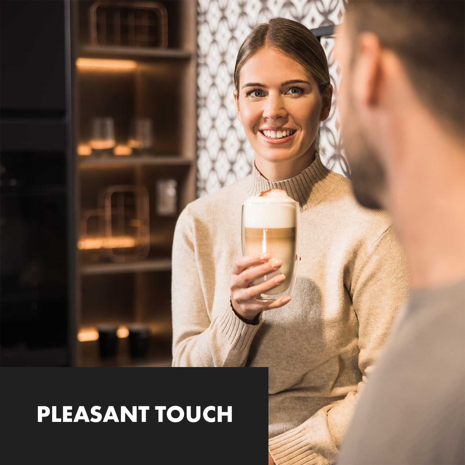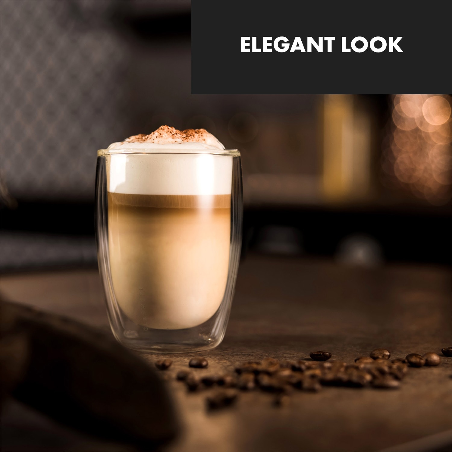 Rozmaznávaj svojich hostí: naservíruj im horúce latte macchiato alebo ľadovo studený kokteil. Vďaka pohárom Jesolo s dvojitým sklom od spoločnosti Klarstein bude každý nápoj jednoducho špeciálnym pôžitkom.Poháre presvedčia nielen svojou zvláštnou eleganciou, ale tiež všestrannosťou a inováciou. Izolačný účinok dvojitej steny chráni tvoje ruky pred horúcimi aj studenými teplotami a zároveň veľmi dlho udržiava teplotu nápoja. Ideálne na varené víno, kávu alebo miešané nápoje. Vďaka extrémne odolnému borosilikátovému sklu, ktoré sa pri teplotných výkyvoch rozpína oveľa menej ako bežné sklo, máš vždy po ruke ten správny pohár na podávanie ľadovo studených kokteilov aj veľmi horúcich nápojov, napríklad čajov. Termoefekt nádob s dvojitou stenou sa tiež postará o to, že sa na skle nevytvára kondenzovaná voda. Optimálne pre pôžitok zo studených nápojov v lete.Skutočne pútajú pozornosť: vďaka dvojitej stene pohárov Klarstein Jesolo sa zdá, že tvoj nápoj sa akoby vznáša v pohári.Či ide o horúci, alebo ľadový nápoj: s pohármi s dvojitou stenou Jesolo od spoločnosti Klarstein máš vždy po ruke ten správny pohár.