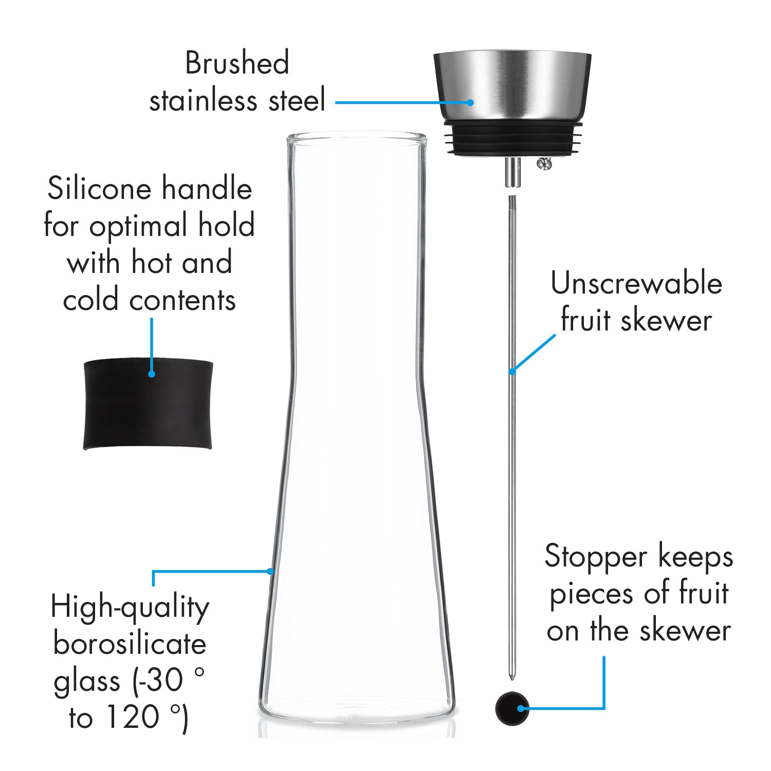 Rozmaznávaj svojich hostí: naservíruj im osvieženie s farebným ovocím z karafy Klarstein Sile. Poháre sa vyprázdnia rýchlejšie, ako ich znovu dokážeš naplniť.Štýlová sklenená karafa zaujme nielen svojím mimoriadne elegantným dizajnom. K dispozícii má aj odnímateľný ovocný špíz. Špíz jednoducho zaskrutkuj do závitu vo vrchnáku z ušľachtilej ocele, ponapichuj na špíz svoje obľúbené ovocie a upevni praktickú koncovku. Kúsky ovocia dodajú vode sviežu a lahodnú chuť bez toho, aby sa pri nalievaní vody do pohárov karafa upchávala. Samozrejme, špíz sa dá aj vybrať, aby bolo možné karafu použiť na horúci čaj alebo studený džús. Ani jedno z toho nebude problémom vďaka vyhotoveniu z borosilikátového skla, ktoré je vďaka vysokému obsahu bóru mimoriadne odolné proti teplu aj chladu. O bezpečnú manipuláciu sa navyše postará protišmyková silikónová rúčka, ktorý chráni tvoje ruky pri servírovaní horúcich a studených nápojov.Či už v kancelárii, alebo doma: zdravá aromatizovaná voda z karafy Sile od spoločnosti Klarstein s rôznymi variáciami ovocia prináša dokonalú rozmanitosť, aby si počas celého dňa dostatočne pil a cítil sa vitálne.