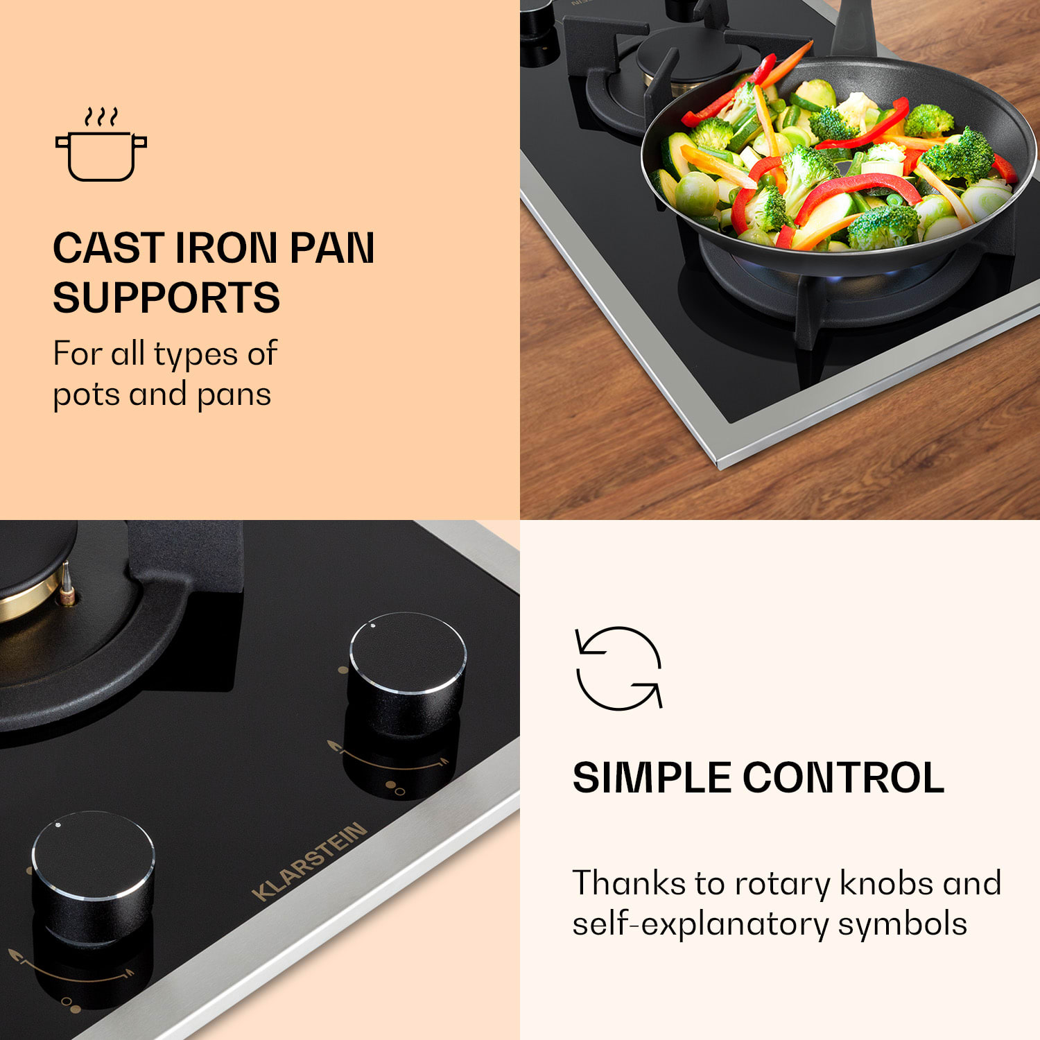 Plynová varná doska Klarstein Goldflame 2 pozostáva z dvoch vysoko kvalitných horákov Messing, ktoré sú umiestnené na 8 mm hrubej sklokeramickej doske. S výkonom 2,4 kW a 1,8 kW poriadne podkúria tvojim hrncom na mriežkach z liatiny. Aby ste Goldflame Domino Prime zapálili, nepotrebujete žiadny dodatočný plameň, pretože plynový sporák je vybavený so zapaľovaním SnapJetIgnition. Prívod tepla regulujete pomocou otočných ovládačov. O jedinečné zakončenie vzhľadu sa stará rám z nerezovej ocele.Efektívny, rýchly a šetriaci energiu: plynový varná doska Klarstein Goldflame 2.