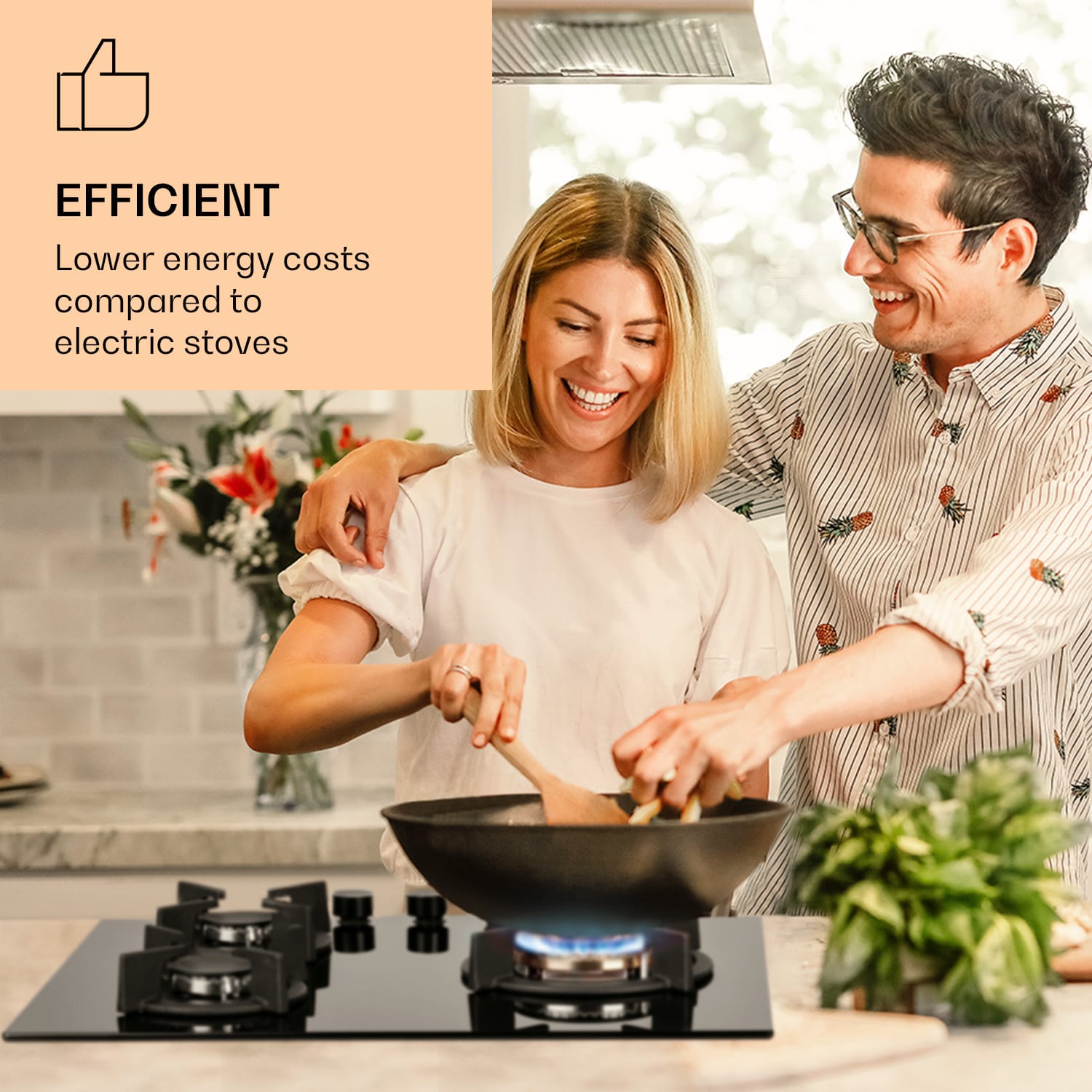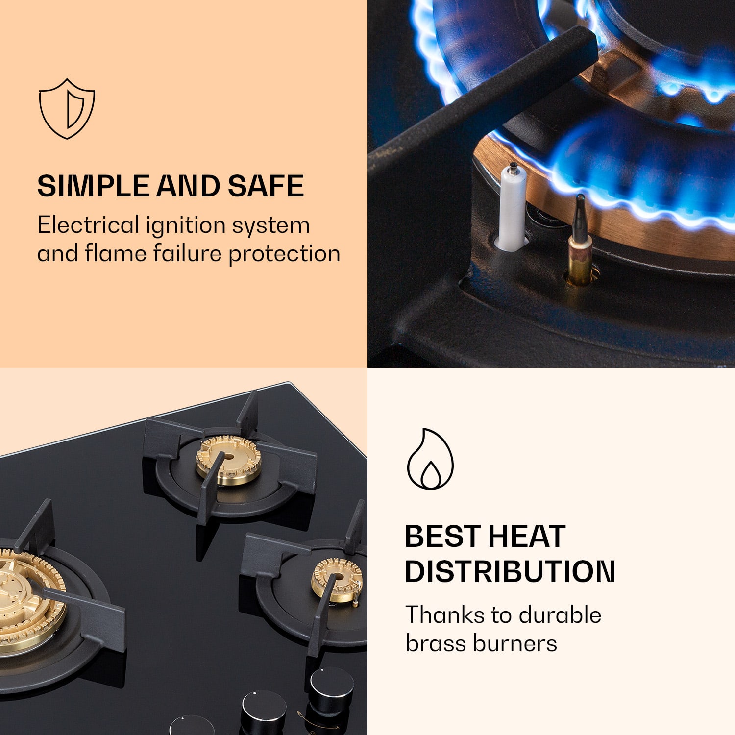 Plynová varná doska Klarstein Goldflame 3 pozostáva z troch vysoko kvalitných horákov Messing, ktoré sú umiestnené na 8 mm hrubej sklokeramickej doske. S celkovým výkonom 6,2 kW poriadne podkúria tvojim hrncom na mriežkach z liatiny. Aby ste Goldflame 3 zapálili, nepotrebujete žiadny dodatočný plameň, pretože plynový sporák je vybavený so zapaľovaním SnapJetIgnition. Prívod tepla regulujete pomocou otočných ovládačov.Efektívny, rýchly a šetriaci energiu: plynový varná doska Klarstein Goldflame 3.