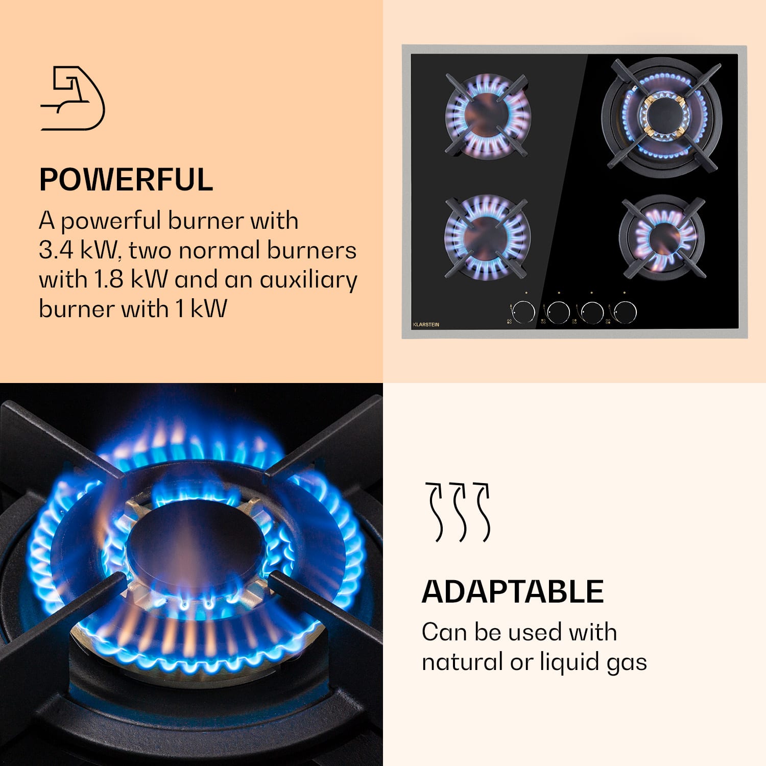 Klarstein Goldflame 4 Prime, plynová varná doska, 4 Messing horáky, sklokeramika