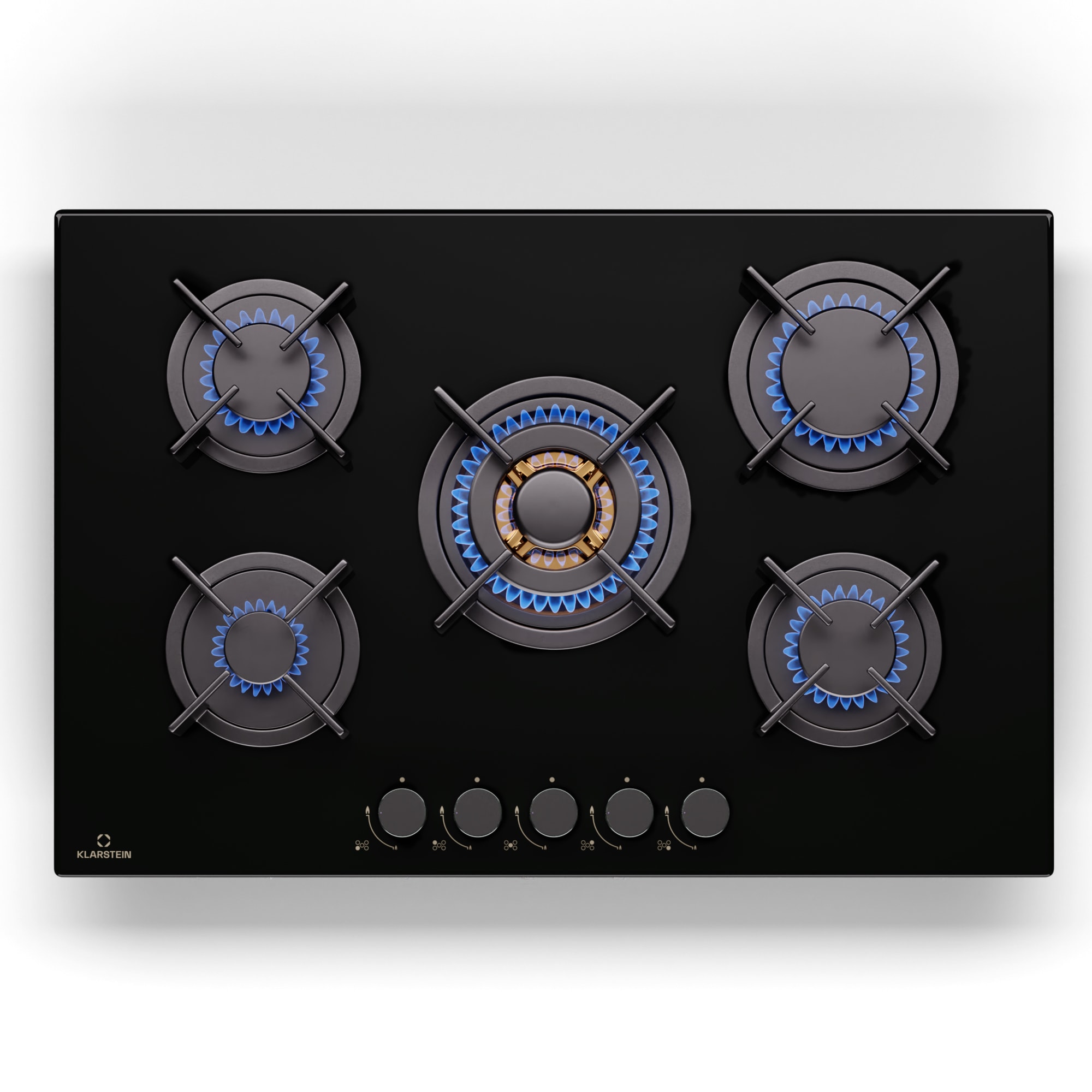 Pre náročných kuchárov Klarstein predstavuje plynovú varnú dosku Goldflame 5, ktorá spája výhody varenia na plyne s účinnosťou, ovládateľnosťou a šetrnosťou k životnému prostrediu. Vďaka piatim vysokokvalitným mosadzným horákom (3,4 kW, 2,4 kW, 2 x 1,8 kW, 1,0 kW) poskytuje priestorovo úsporná varná doska optimálny ohrev. Odolnosť a rovnomerná distribúcia tepla horákov podčiarkujú kvalitné spracovanie. Robustné liatinové rošty zaisťujú stabilné uchytenie rôznych typov kuchynského riadu.Vďaka intuitívnemu ovládaniu pomocou veľkých otočných gombíkov so zrozumiteľnými symbolmi sa obsluhuje bez námahy. Jednou z výhod varenia na plyne je presné nastavenie veľkosti plameňa, ktoré má priamy vplyv na teplotu varenia. Zapaľovanie SnapJet umožňuje elektrické zapaľovanie bez zapaľovača alebo zápaliek. Ochrana proti zlyhaniu plameňa zaisťuje bezpečnosť tým, že automaticky vypne plyn, keď plameň zhasne.Plynová varná doska Klarstein sa po varení ľahko čistí vďaka 8 mm hrubému tvrdenému sklokeramickému povrchu v čiernej farbe – elegantná a ľahko sa čistí.