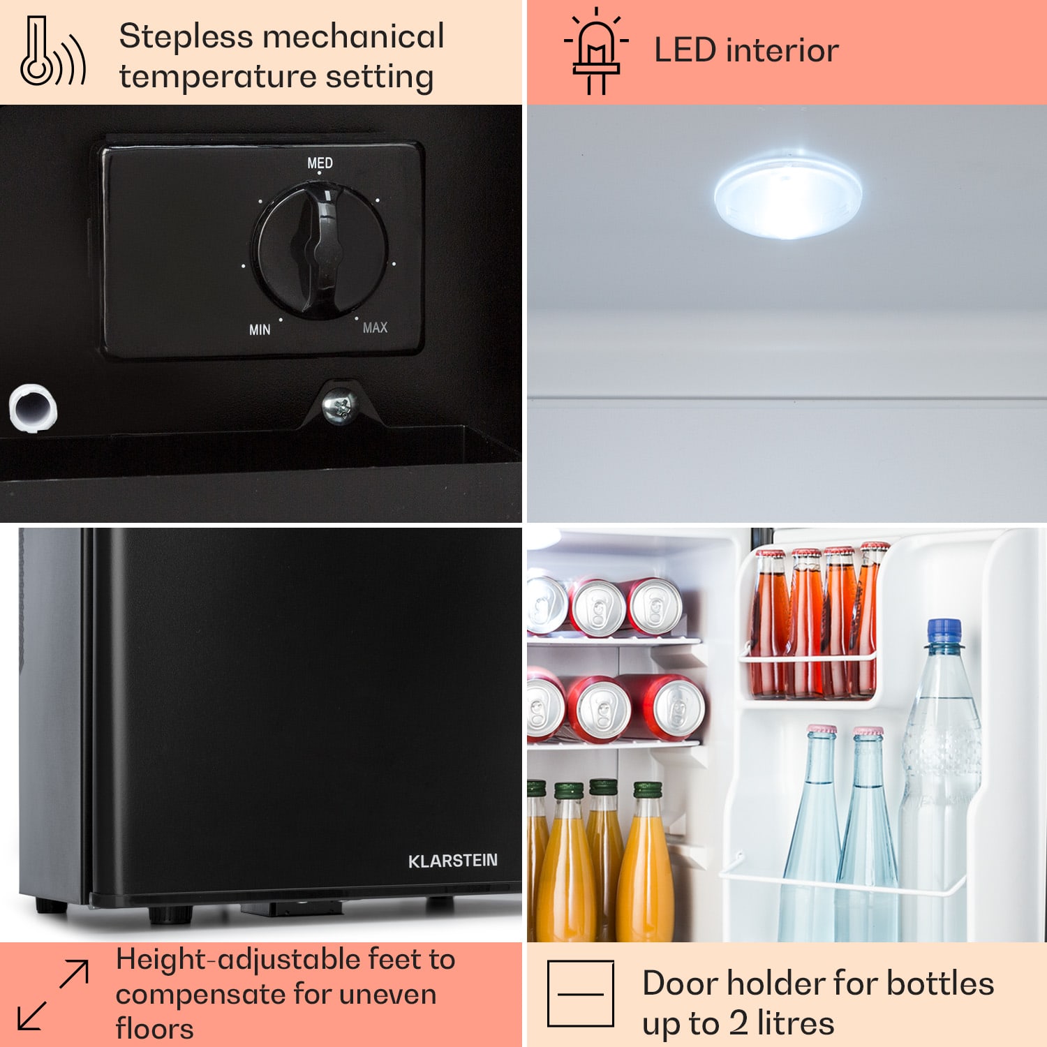 Uchovávajte chladené občerstvenie a nápoje priestorovo úsporným spôsobom: chladnička Happy Hour 38 od Klarstein je ideálna pre malé domácnosti, pre spoločné izby alebo kancelárie ale najmä pre spálne a hosťovské izby vďaka svojej mimoriadne tichej prevádzke s hlučnosťou len 26 dB a kompaktným rozmerom. Táto Mini chladnička s 38-litrovým interiérom má na 3 policiach priestor na všetky druhy jedál, nápojov a potravín. Dve mriežkové police možno použiť na troch zásuvkách podľa potrieb obsahu chladničky, zatiaľ čo vajcia, maslo a tiež veľké fľaše s nápojmi do 2 litrov možno uložiť do dverových priehradiek.Vždy dokonale vychladené: chladnička Happy Hour 38 od Klarstein je priestorovo úsporný dizajnový zázrak, ideálna na skladovanie potravín.