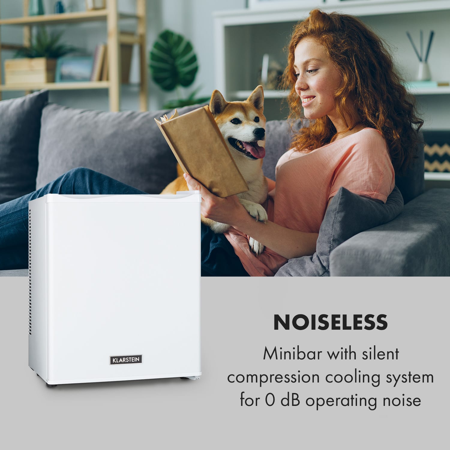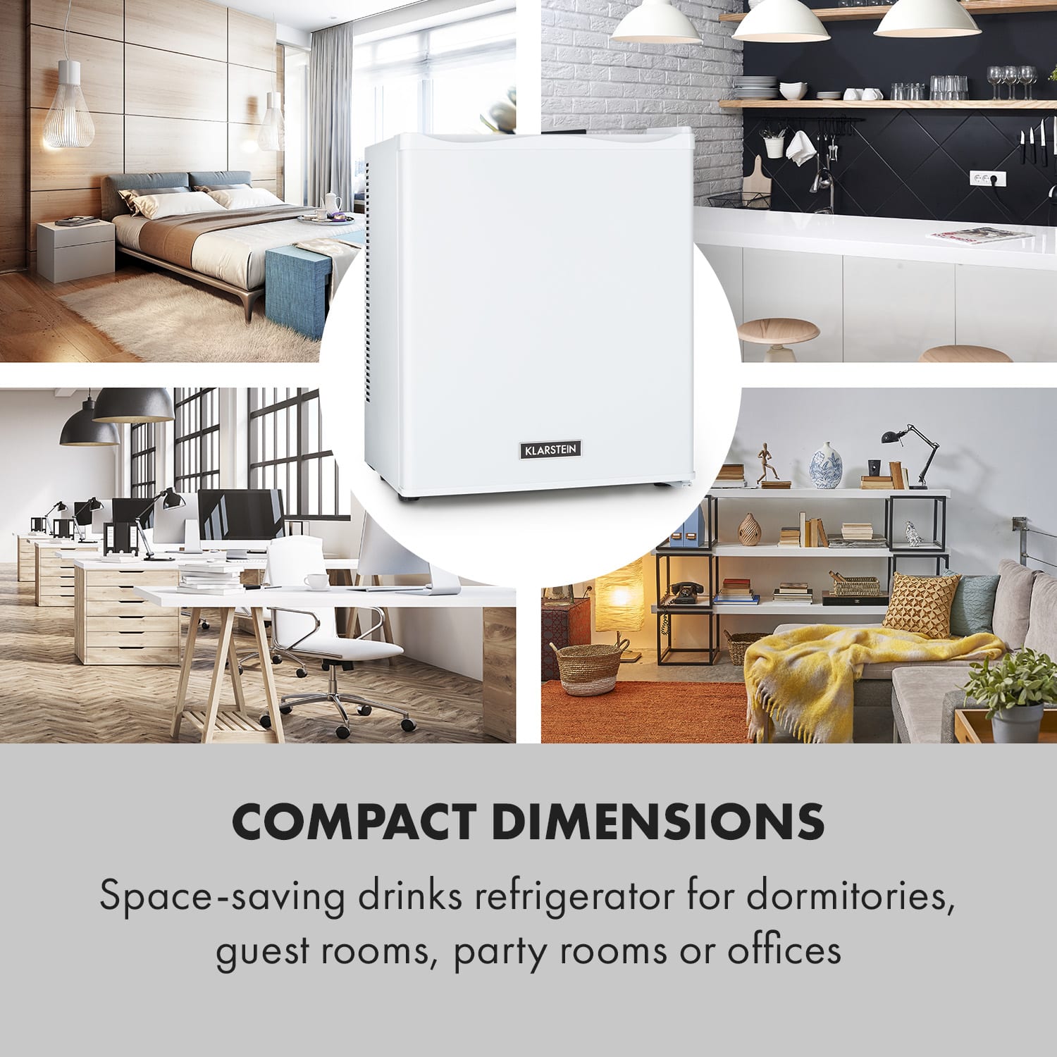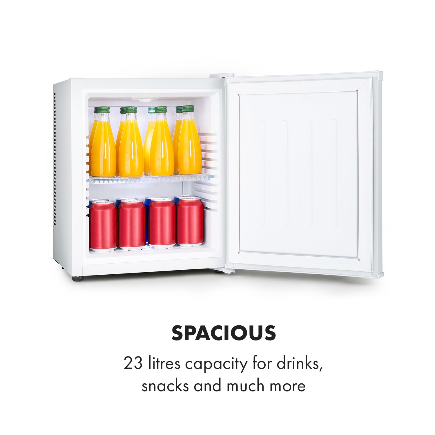 Minichladnička Klarstein Happy Hour je kompaktná a takmer nepočuteľná vďaka svojmu najmodernejšiemu chladiacemu systému. Ľahko sa do nej zmestia nápoje alebo občerstvenie a zároveň sa v nej udržiava príjemná osviežujúca teplota. Jej priestranný interiér pojme všetko. Klarstein Happy Hour Minibar môže ľahko plniť svoje chladiace úlohy na miestach, kde je často málo miesta: v hotelových izbách, altánkoch, detských a mládežníckych izbách alebo priamo v domácej párty pivnici. Požadovanú teplotu chladenia v rozmedzí od 5 do 15 °C možno zvoliť pomocou otočného ovládača na zadnej strane.Expert na tiché chladenie: chladnička na nápoje Klarstein Happy Hour poskytuje nápoje a občerstvenie pri osviežujúcich teplotách s nízkou prevádzkovou hlučnosťou.