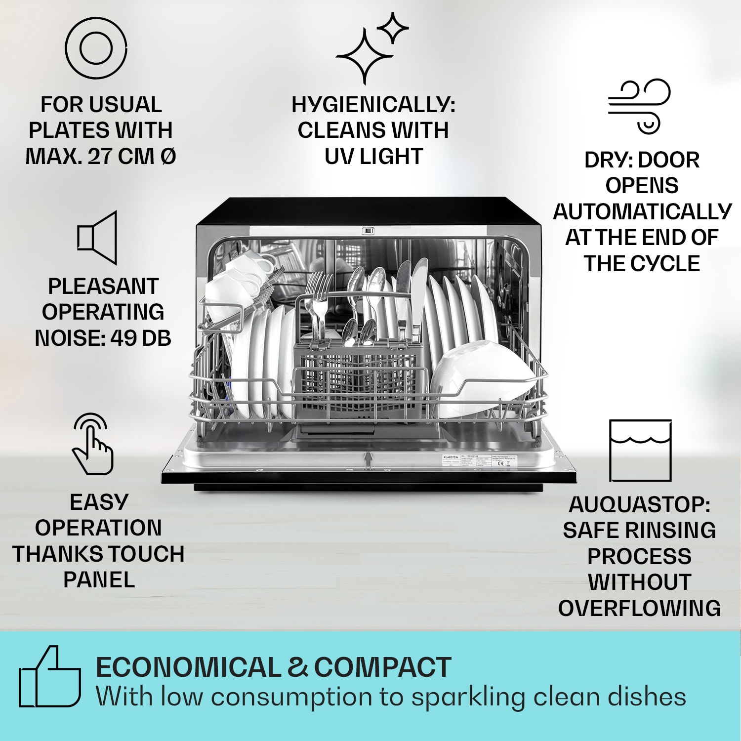 Umývačka riadu Havasia UV 6 od Klarstein je presvedčivý pomocník pri umývaní riadu s mnohými užitočnými funkciami! Vo vnútri je miesto až na 6 súprav riadu. S výkonom 1380 W a šiestimi rôznymi programami sa umývačka Havasia UV 6 postará o to, aby špinavý riad opäť žiaril. Všetky programy sa dajú rýchlo a jednoducho nastaviť pomocou prehľadného dotykového ovládacieho panela. S automatickým otváraním dverí a integrovaným UV svetlom na mimoriadne účinné umývanie vám spoľahlivo uľahčí každodenný život. Zabudovaný držiak uľahčuje aj čistenie pohárov na víno alebo šampanské. Umývačku riadu Havasia UV 6 možno používať ako vstavaný spotrebič alebo ako stolnú umývačku.