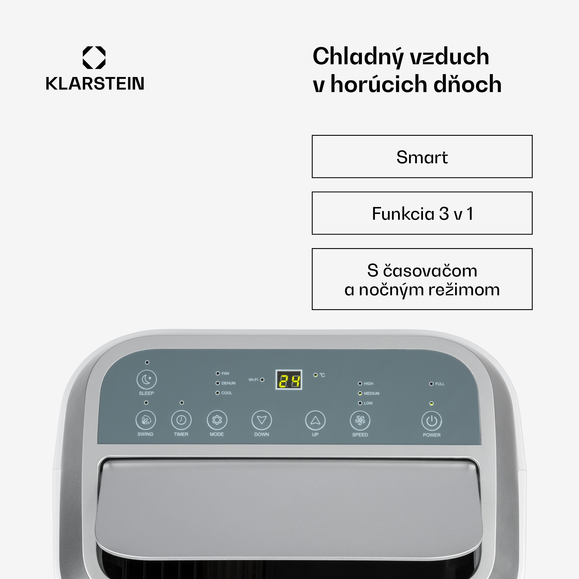 Mobilná Klimatizácia Klarstein Iceblock Smart 12K poskytuje dokonalú letnú pohodu v obytných alebo pracovných miestnostiach. Vyniká svojou účinnosťou 3 v 1 ako klimatizácia, ventilátor a odvlhčovač vzduchu. Ako klimatizácia, ochladzuje miestnosti s rozlohou 13 – 18 m² na príjemnú teplotu od 16 do 31 °C. Integrovaný ventilátor s 3 stupňami výkonu voľne rozvádza ochladený vzduch po celej miestnosti. Výkonný chladiaci kompresor pracuje s výkonom 12 000 BTU alebo 3,5 kW v triede energetickej účinnosti A, takže klimatizácia 3 v 1 Klarstein Iceblock Smart 12K zostáva príjemne úsporná a šetrná k životnému prostrediu aj pri nepretržitej prevádzke. Táto mobilná klimatizácia s hadicou je ideálna pre flexibilné použitie.Pre ideálne chladenú inteligentnú domácnosť: S aplikáciou Klarstein môžete klimatizáciu Iceblock Smart 12K ovládať odkiaľkoľvek: Klarstein.