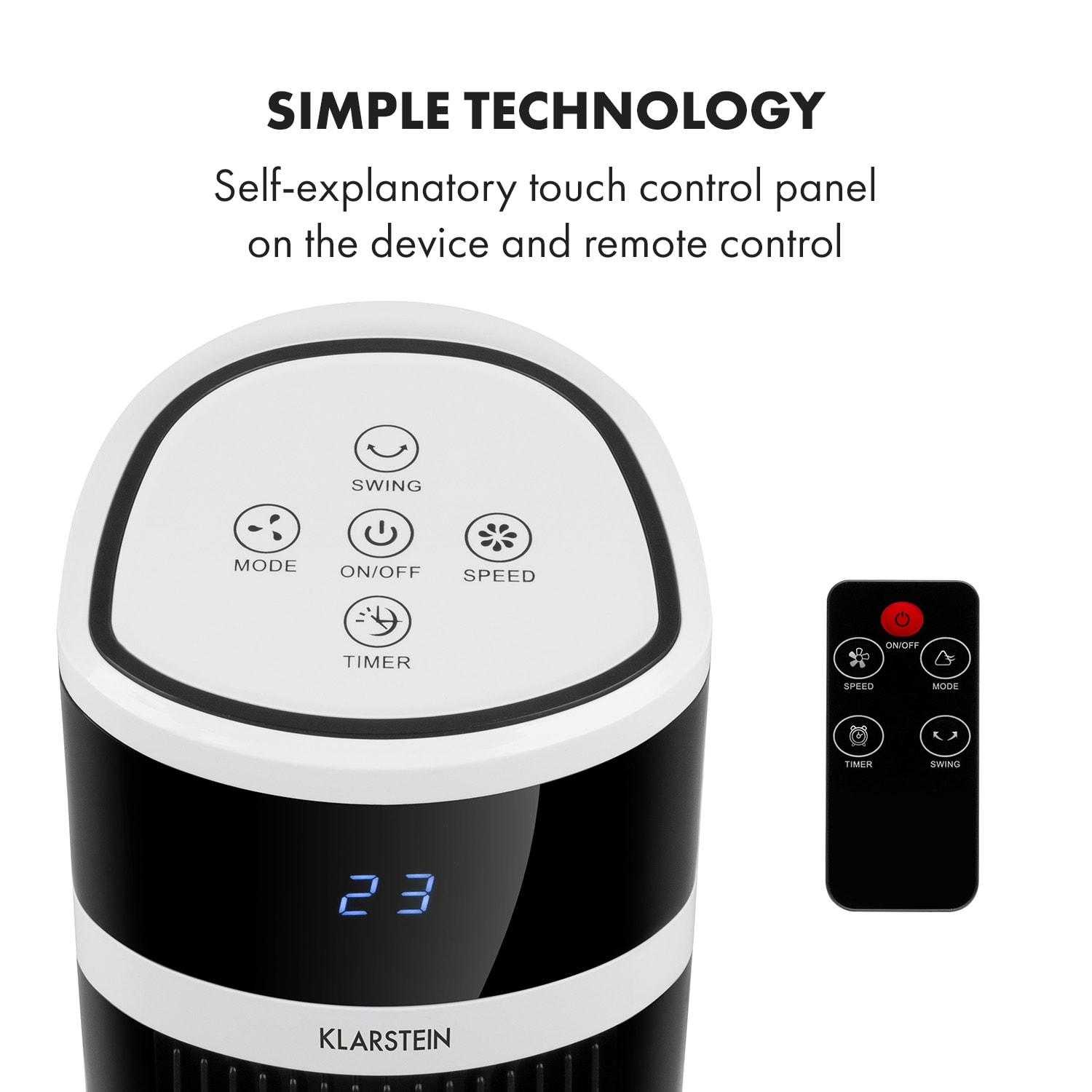 Príjemné osvieženie počas horúcich dní: ventilátor Klarstein Icetower Smart sa postará o príjemnú čerstvosť a priestranné ochladenie s veľmi komfortným ovládaním.S ventilátorom Klarstein Icetower Smart si počas horúcich dní môžeš pohodlne užívať čerstvý vánok a zariadenie pritom komfortne ovládať od písacieho stola, z postele alebo gauča. Pretože cez smartfón máš kontrolu nad všetkými nastaveniami tohto efektívneho stĺpového ventilátora. Môžeš ho ovládať aj cez dotykovú ovládaciu plochu alebo pomocou diaľkového ovládača.S úzkym a elegantným dizajnom šetrí miesto a harmonicky sa hodí do každej miestnosti – je dokonca vhodný do rohov a kútov. A dokonca aj pri zapnutej oscilácii stojí stabilne na svojom podstavci. Čerstvý vánok na želanie: môžeš zvoliť tri intenzity, môžeš sa osviežiť jemným, silným alebo normálnym vetrom. Okrem toho je tento stĺpový ventilátor otočný do 60° a môže tak šíriť vzduch aj po stranách miestnosti. Zaži nepretržité vetranie v normálnom režime alebo si užívaj rozmanité, prírodu simulujúce pohyby vetra v prírodnom režime. Na večer disponuje extra tichým, plýživím nočným režimom. Najmä v noci ponúka funkcia časovača príjemný komfort, pretože si viete naprogramovať zapnutie a aj vypnutie.Puristický, šetrný a výkonný: S ventilátorom Klarstein Icetower Smart prejdeš horúcim letom čerstvo zotavený.