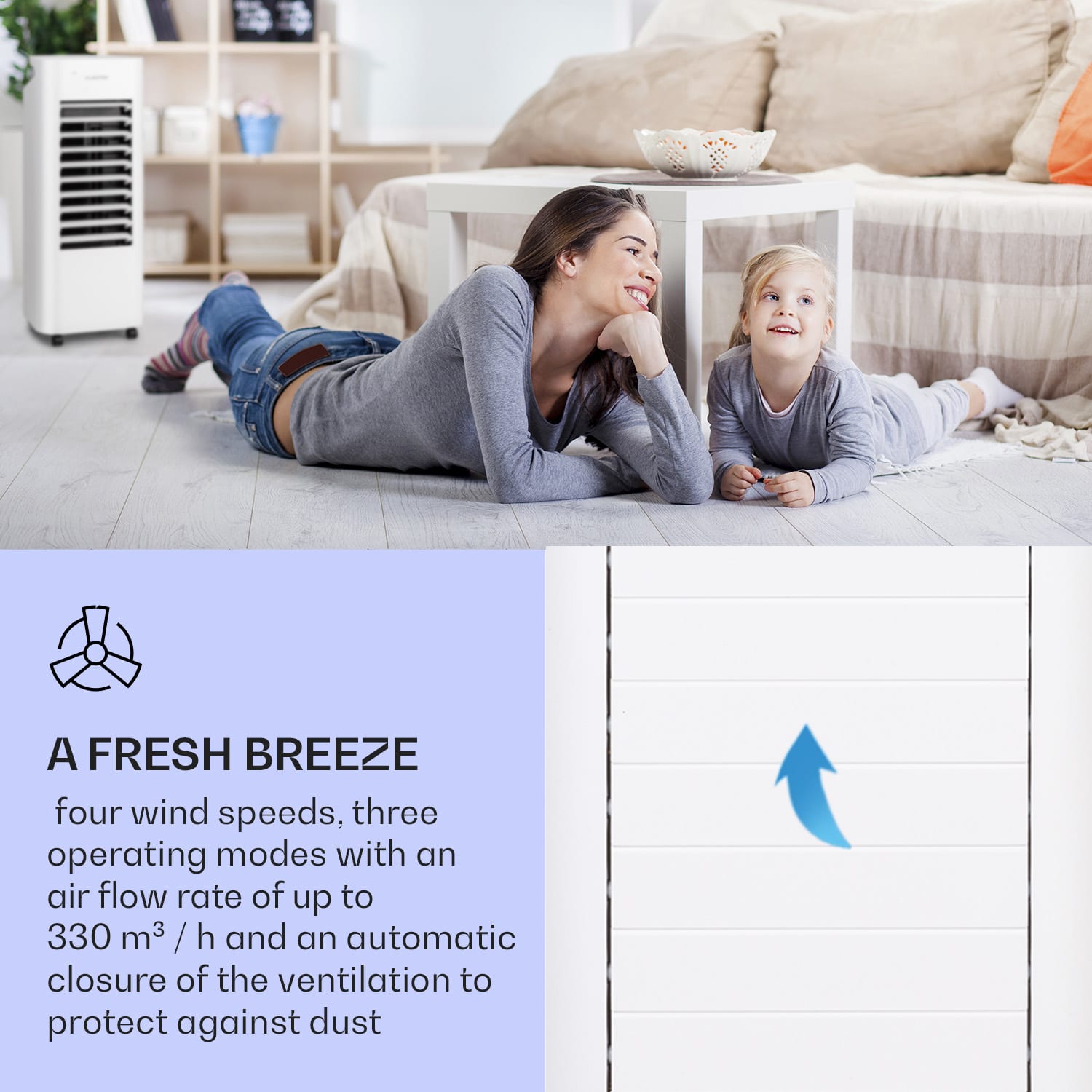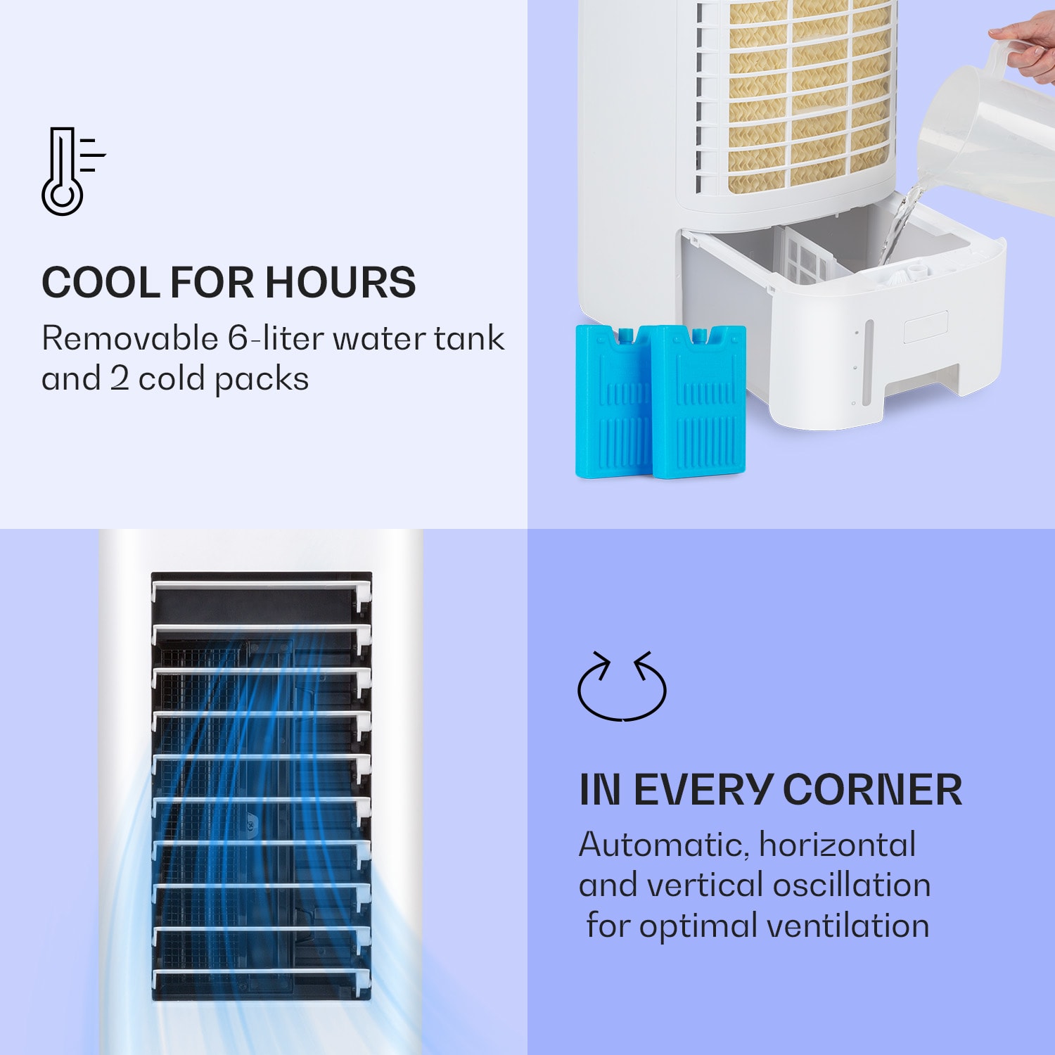 Chladné osvieženie počas horúcich dní: 3-v-1 ochladzovač vzduchu Klarstein IceWind Max ťa spoľahlivo ochladí chladným prúdom vzduchu a aj počas chladných dní presviedča svojou praktickou funkciou zvlhčovača vzduchu. Vďaka automatickej, horizontálnej a vertikálnej oscilácii, 4 rýchlostným stupňom a tromi módami fúkania, si vždy zachováš chladnú hlavu. Pomocou vyparovania zo 6 litrovej nádrže na vodu sa prúd vzduchu príjemne ochladí. To Ti pomôže presne sa osviežiť počas horúcich dní – či už za písacím stolom, na gauči alebo pri hraní s deťmi. A v zime tak priamo zvlhčíš vzduch, aby si sa mohol zhlboka nadýchnuť.