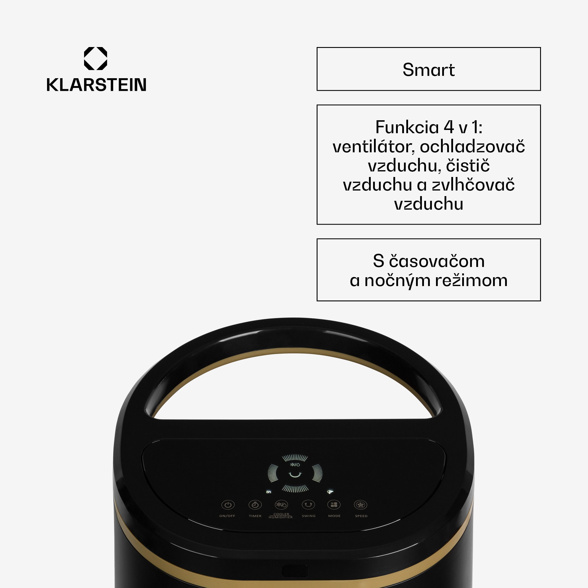 Chladivé osvieženie v horúcich dňoch:Ochladzovač vzduchu Klarstein IceWind Plus Smart 4 v 1 vám spoľahlivo poskytne chladivý prúd vzduchu a naopak v chladných dňoch zaujme aj praktickými funkciami zvlhčovača a čističky vzduchu.Obzvlášť inteligentné: zariadenie Ice Wind Plus Smart môžete ovládať odkiaľkoľvek cez domáce WiFi pomocou aplikácie Klarstein na smartfóne alebo tablete. Štyri rôzne úrovne vetra a tri prevádzkové režimy poskytujú cielené osvieženie pri použití funkcie ventilátora . Prepínateľná oscilácia ventilátora dodáva čerstvý vzduch viacerým osobám prostredníctvom ľavo-pravého kmitania lamiel. Ak sa používa aj ochladzovač vzduchu , chladenie je dostupné po celý deň pri každej činnosti. Dva vymeniteľné chladiace balíčky pre nádrž na vodu môžu tento efekt ešte znásobiť. Integrovaný ionizátor čistí vzduch od pachov a nečistôt. Jednotku možno obsluhovať aj prostredníctvom dotykového ovládacieho panela alebo pohodlne diaľkovým ovládaním.Výkonný a všestranný: Ochladzovač vzduchuKlarstein IceWind Plus Smart 4 v 1 je osviežujúcou odpoveďou na všetky horúce dni v roku.