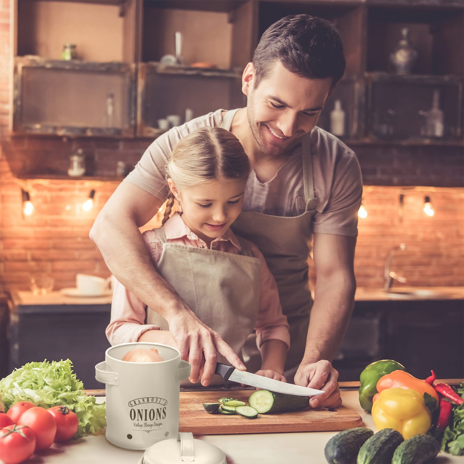 Priestorovo úsporná smaltovaná dóza na cibuľu Iowa od spoločnosti Klarstein Accubuddy vo vintage dizajne 40. rokov s nápisom „ONION“ je nielen veľmi stabilná a dostatočne veľká na skladovanie cibule s hmotnosťou približne 1,6 kg, ale je tiež dokonalým stredobodom pozornosti každej kuchyne. Na čo sa často zabúda: cibuľa má dlhú trvanlivosť najmä vtedy, ak je skladovaná v tme a pri miernej cirkulácii vzduchu. Malé vetracie otvory v nádobe na cibuľu zabraňujú klíčeniu a cibuľa zostane dlhšie čerstvá. Úložnú nádobu je, samozrejme, možné použiť aj na skladovanie inej zeleniny a dá sa rýchlo a jednoducho vyčistiť vlhkou utierkou. Táto úložná dóza na cibuľu vo vidieckom štýle s rozmermi približne 17 × 22,5 × 14 (Š × V × H) sa pohodlne zmestí na tvoj kredenc, na kuchynskú linku alebo do kuchynskej skrinky. Pevný, nehrdzavejúci smaltovaný oceľový plech je veľmi robustný a na rozdiel od kameninových alebo porcelánových nádob vydrží aj nejaký ten neúmyselný pád. Nádoba na cibuľu Iowa od spoločnosti Klarstein Accubuddy dodá tvojej kuchyni špeciálne čaro a je obohatením každej domácnosti.