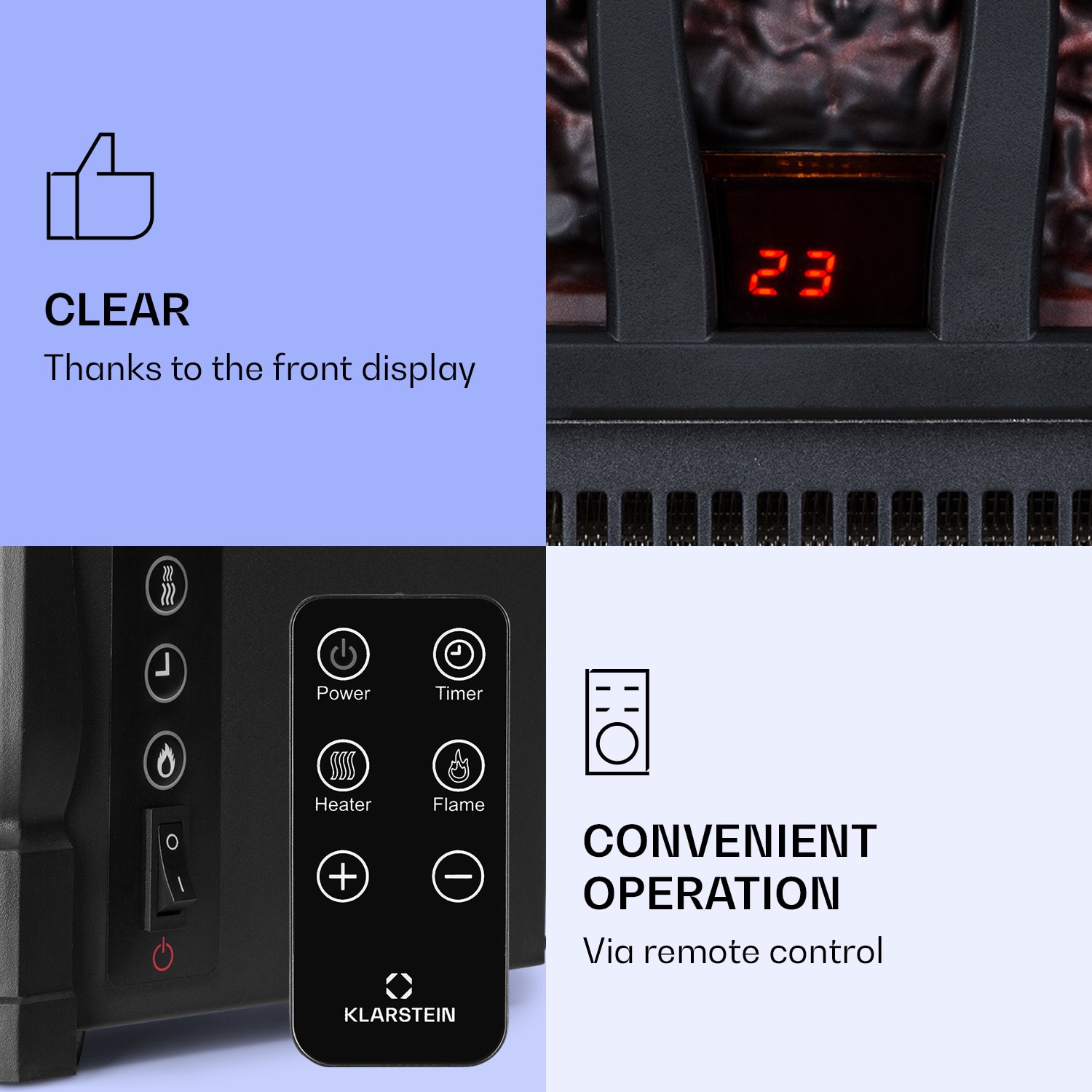 S elektrickým krbom Klarstein Kamini FXL 2G si môžete po celý rok vychutnávať útulnú atmosféru krbu so žiariacimi polenami a realistickou 3D LED ilúziou plameňa. Vďaka prepínateľnej funkcii dvojstupňového ohrevu je ilúzia dokonalá. Kamini FXL 2G sa obsluhuje pomocou dotykového ovládacieho panela alebo pohodlne z pohovky pomocou praktického diaľkového ovládania. Päť stupňov nastavenia jasu a funkcia časovača robia z krbovej vložky Klarstein Kamini FXL ideálny celoročný krb.