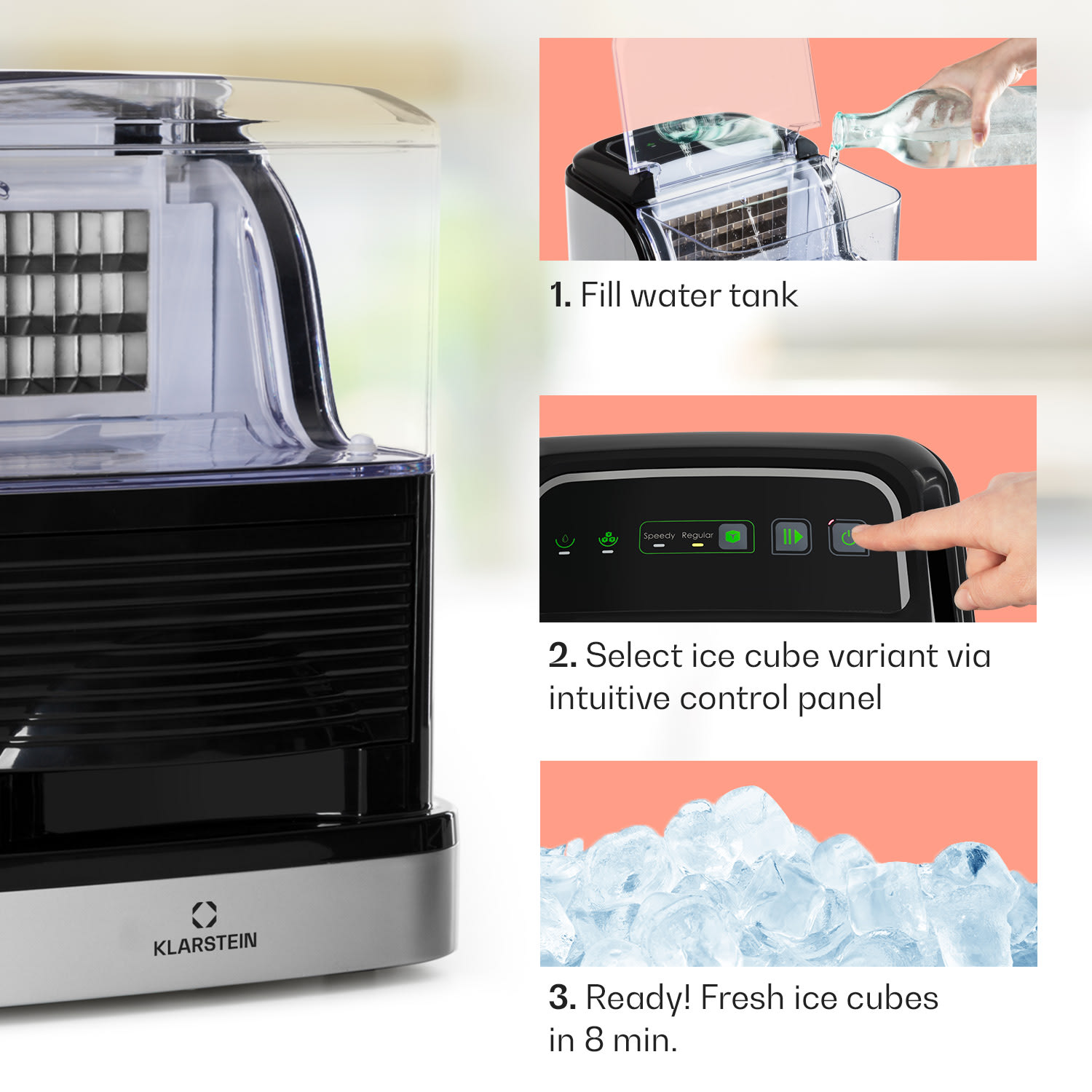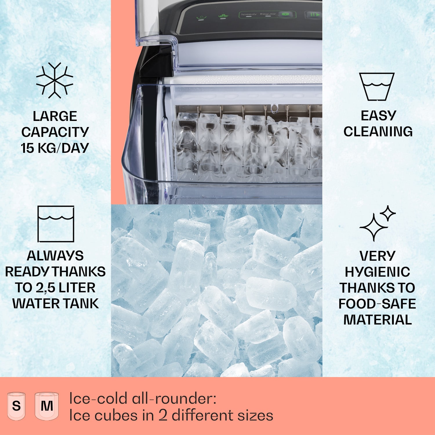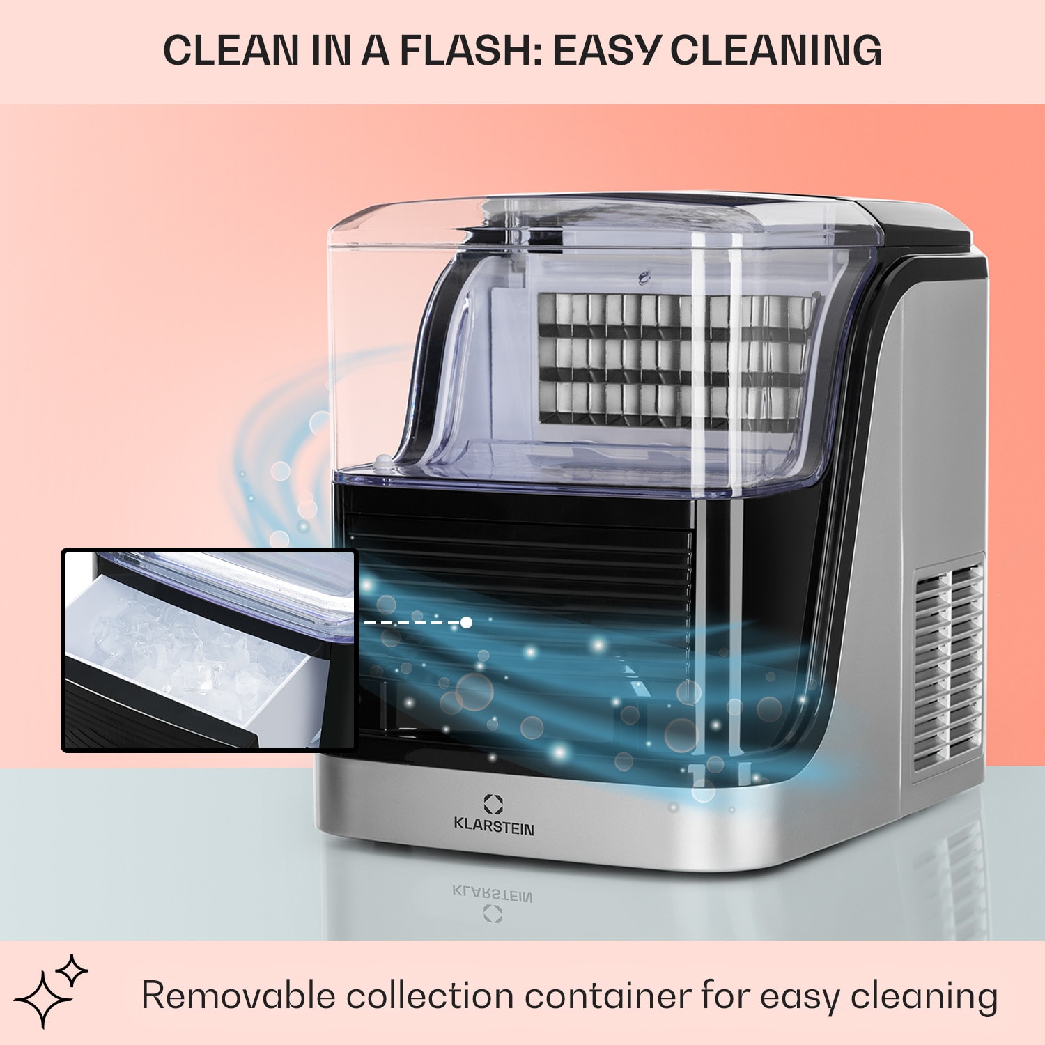 Krásne tvarované, krištáľovo čisté kocky ľadu na dosah ruky: s výrobníkom ľadu Klarstein Kristall sa dajú vykúzliť za okamih chladené drinky na horúcu párty.Kokteily, drinky alebo iné nápoje na schladenie budú dokonalé, až keď budú správne vychladené. S výrobníkom ľadu Klarstein Kristall vždy dostanú nápoje tú správnu kocku ľadu. V prípade tohto zariadenia sú to navyše krásne tvarované kocky z takmer krištáľovo priehľadného ľadu.Výrobník ľadu pripraví až do 15 kg kociek ľadu za 24 hodín, a tak Vás nepretržite zásobuje ľadom. Stačí len jednoducho naliať 2,5 litra vody do nádrže, nastaviť požadovanú veľkosť kociek a príprava sa môže začať. Po 27 minútach sú hotové prvé malé kocky ľadu, väčšie potrebujú 30. Každých 20, resp. 23 minút pribudne nová várka so 600 g kociek ľadu do zásobníka, kde čaká na svoje použitie. Pre jednoduchú manipuláciu sa dá zásobník s ľadom ľahko vybrať.Ovládanie prebieha veľmi jednoducho pomocou niekoľkých tlačidiel. Silný výkon pritom nemusí znamenať aj veľké rozmery zariadenia. Výrobník ľadu Klarstein Kristall je mimoriadne úzky a malý, čiže sa zmestí aj na úzke pulty a do malých párty pivníc.Hurá na kocky ľadu! Výrobník ľadu Klarstein Kristall je malé, no silné zariadenie na prípravu ľadovo osviežujúcich drinkov.