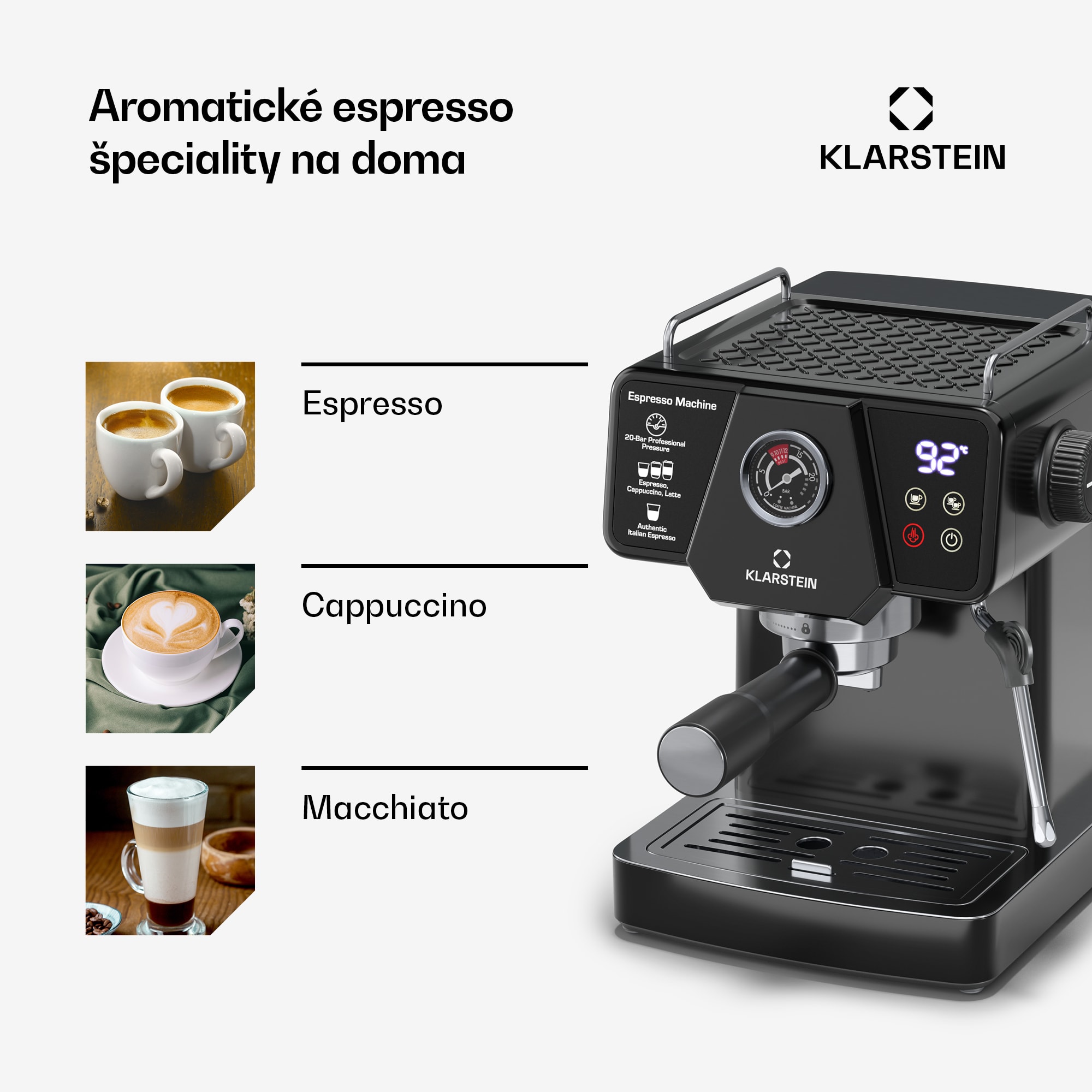Pre kvalitný pôžitok z kávy: Klarstein Libeica je elegantný kávovar v atraktívnom dizajne z nehrdzavejúcej ocele s ukazovateľom teploty a tlaku. Vďaka presvedčivému výkonu 1350 W a tlaku 19 barov vyčarí tú najlepšiu arómu kávy zo všetkých kávových zŕn. Vďaka klasickému portafiltru z nehrdzavejúcej ocele môžete použiť buď kávu, alebo espresso v prášku. Pomocou parnej trysky si môžete v okamihu pripraviť krémovú penu na cappuccino alebo latte macchiato. Jedno naplnenie odnímateľnej nádržky na vodu vystačí vďaka jej značnému objemu na približne 10 šálok kávy.Vychutnajte si vysokokvalitnú kávu ako barista! Kúpte si kávovar na espresso Klarstein Libeica a vychutnajte si aromatické espresso a krémové cappuccino jediným stlačením tlačidla.
