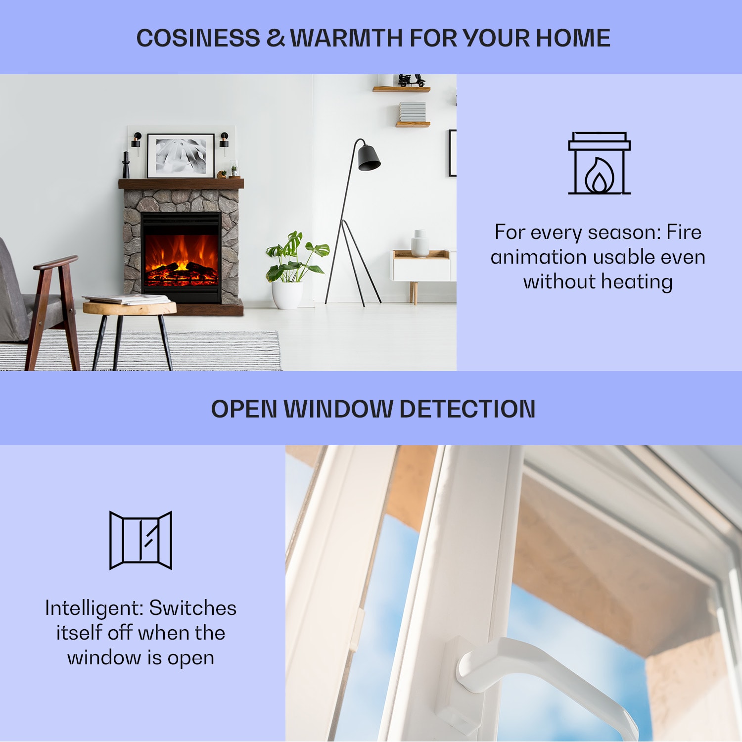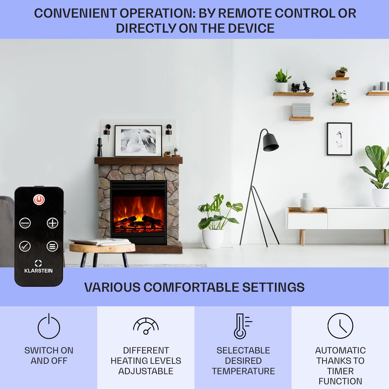 Štýlový pocit z krbu s kompaktnými rozmermi bez dymu a ohňa. Elegantný elektrický krb Klarstein Lienz sa vďaka výrobe z polykameňa klamlivo podobá skutočnému krbu z murovaného kameňa a v každej miestnosti vyčarí realistickú ilúziu plameňa. Jemné svetlo realisticky imituje plamene a tlejúce polená a okamžite šíri útulnú, romantickú atmosféru. Okrem toho je krb Lienz vybavený dvojstupňovou, prepínateľnou funkciou vyhrievania a praktickým týždenným časovačom. Ovládanie je možné prostredníctvom displeja na jednotke alebo pohodlne pomocou diaľkového ovládania. Elektrický krb Klarstein Lienz je ideálny na príjemné chvíle – či už osamote alebo s partnerom Poznámka: Tento výrobok je vhodný len do dobre izolovaných priestorov alebo na príležitostné použitie.