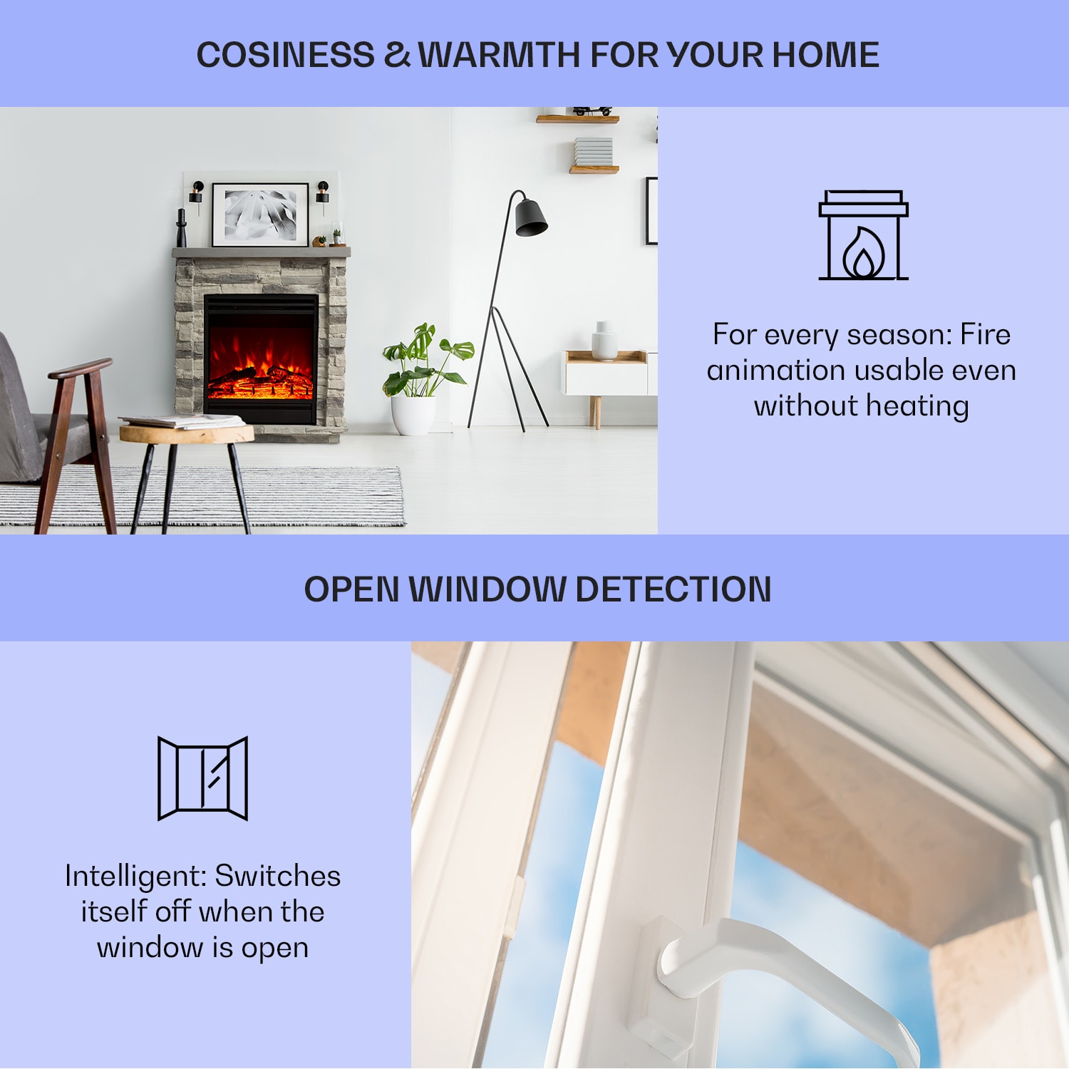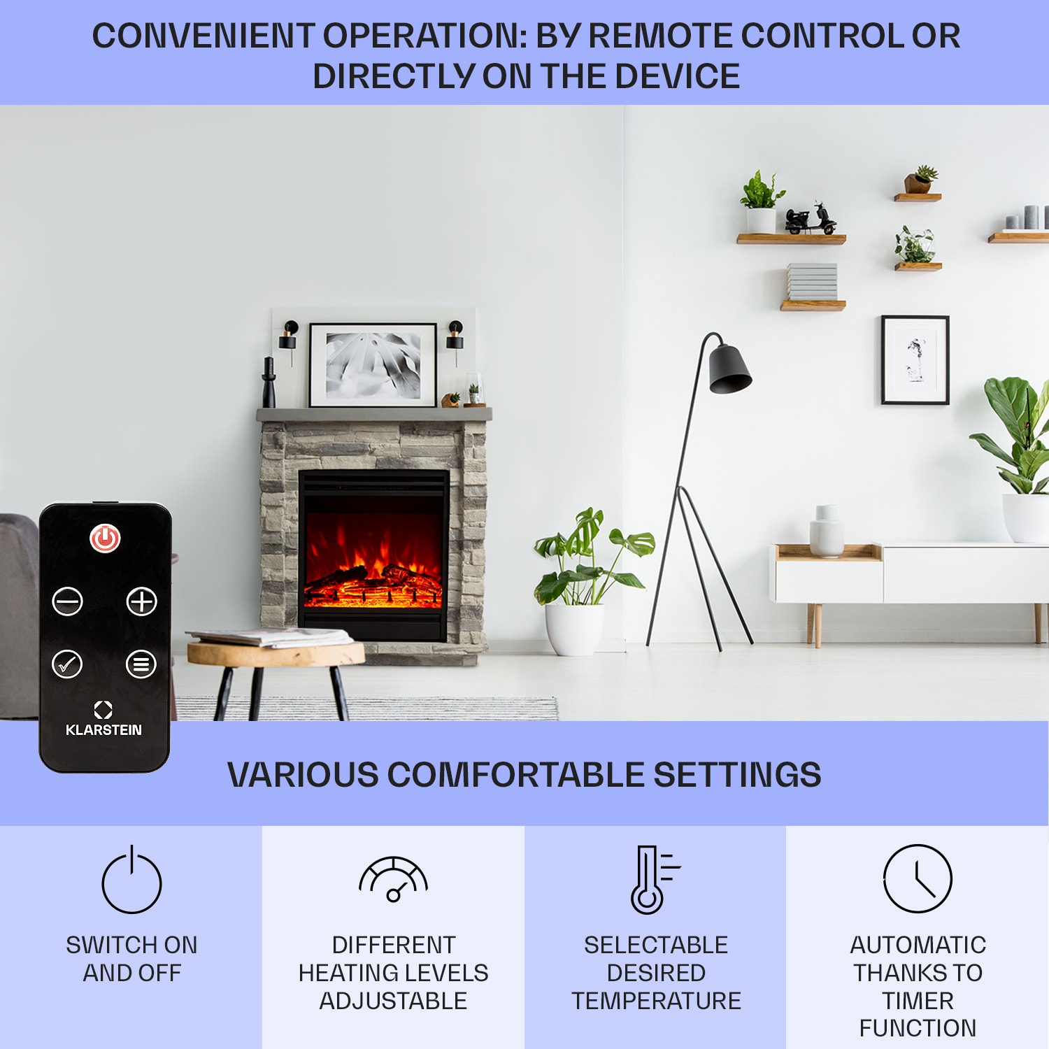 Štýlový pocit z krbu s kompaktnými rozmermi bez dymu a ohňa. Elegantný elektrický krb Klarstein Lienz sa vďaka výrobe z polykameňa klamlivo podobá skutočnému krbu z murovaného kameňa a v každej miestnosti vyčarí realistickú ilúziu plameňa. Jemné svetlo realisticky imituje plamene a tlejúce polená a okamžite šíri útulnú, romantickú atmosféru. Okrem toho je krb Lienz vybavený dvojstupňovou, prepínateľnou funkciou vyhrievania a praktickým týždenným časovačom. Ovládanie je možné prostredníctvom displeja na jednotke alebo pohodlne pomocou diaľkového ovládania. Elektrický krb Klarstein Lienz je ideálny na príjemné chvíle – či už osamote alebo s partnerom Poznámka: Tento výrobok je vhodný len do dobre izolovaných priestorov alebo na príležitostné použitie.