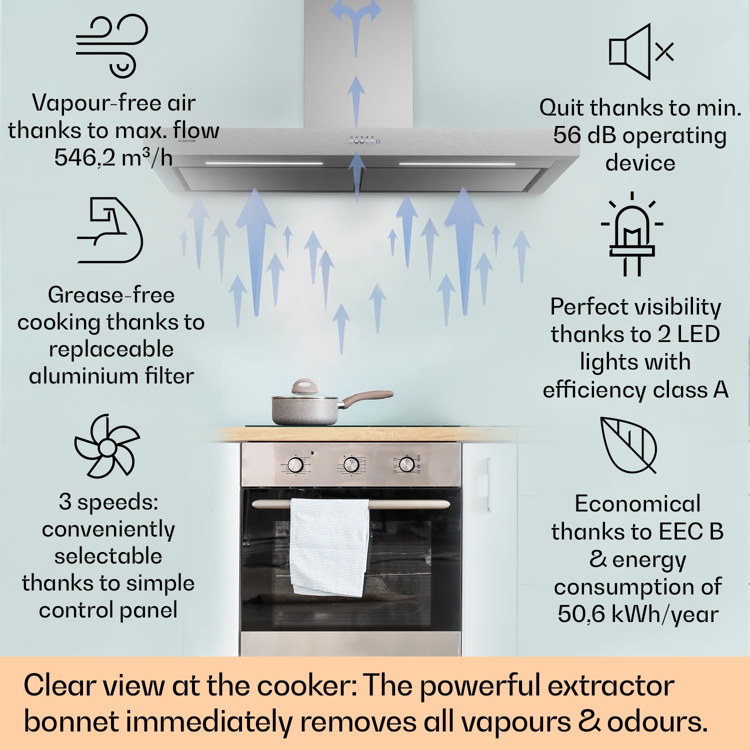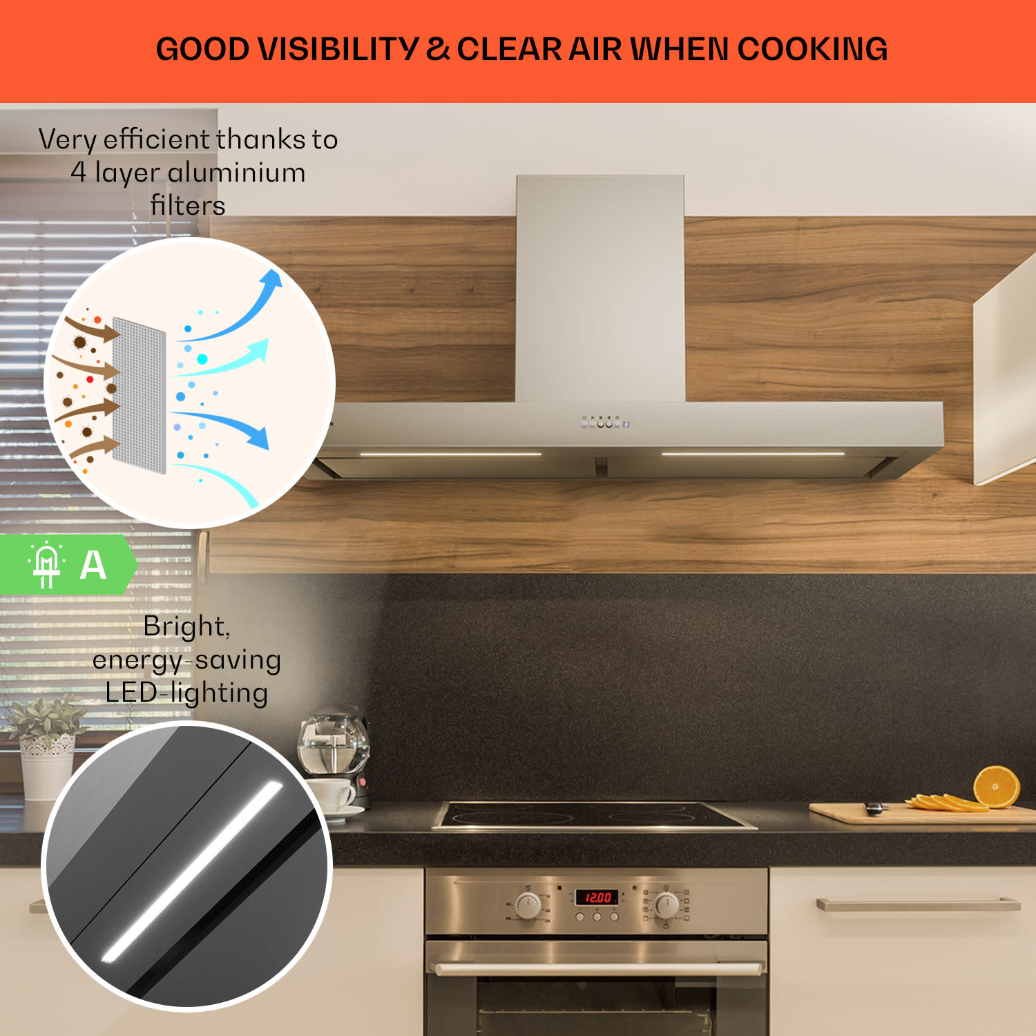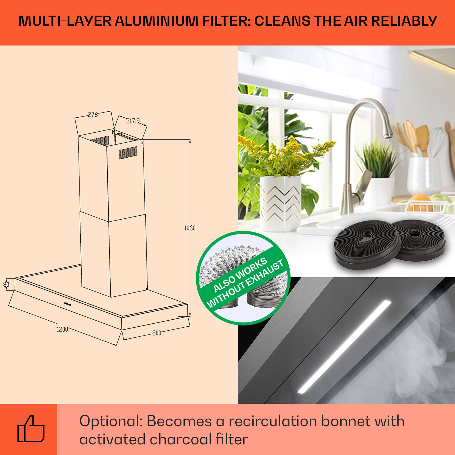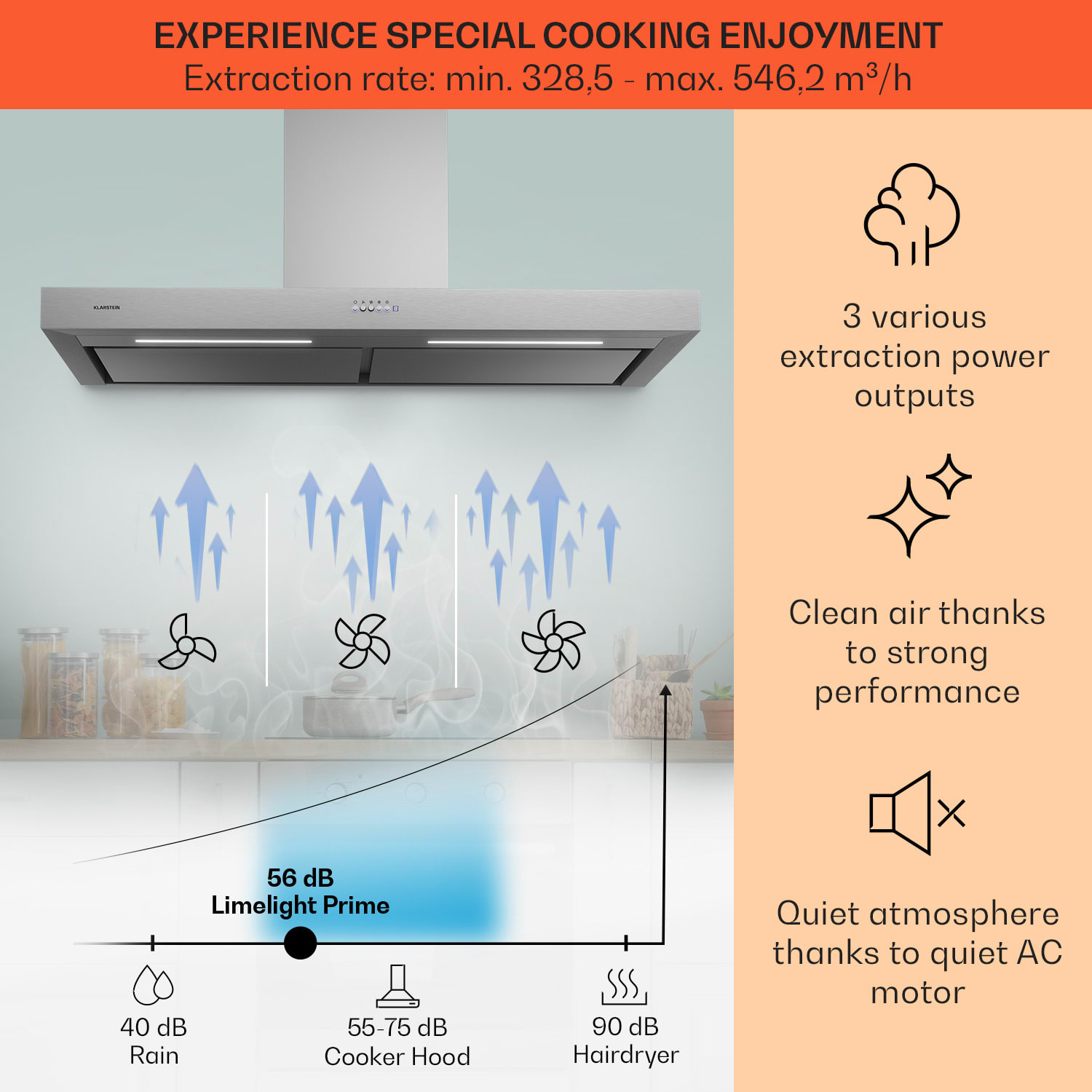 Elegantný a praktický zároveň, taký je digestor Limelight od Klarstein. Obohatí každú kuchyňu o ochotného pomocníka pri odstraňovaní pary, dymu a pachov počas varenia.So šírkou 120 cm sa digestor Limelight od Klarstein ideálne hodí pre malé až stredne veľké varné plochy a kuchynské linky. Najvyšší stupeň výkonu odvedie z kuchyne až 546,2 m³/h, a tak zvládne prípravu niekoľkých chodov. Jednoduchá ovládacia plocha na prednej strane umožňuje výber troch úrovní vetrania. Dve integrované LED svetlá poskytujú dostatok svetla nad varnou plochou, aby vášniví kuchári presne videli, čo robia.Digestor Limelight je určený na nástennú montáž; potrebný montážny materiál a lišty pre hadicu odsávaného vzduchu sú súčasťou balenia. Digestor môžete jednoducho prestavať na prevádzku s recirkuláciou vzduchu. Dva filtre s aktívnym uhlím sú priamo súčasťou balenia na filtrovanie zápachu.Jasný výhľad v kuchyni: S nástenným digestorom Limelight od Klarstein rýchlo zmiznú pachy jedla, pary a zvyšky mastnoty.