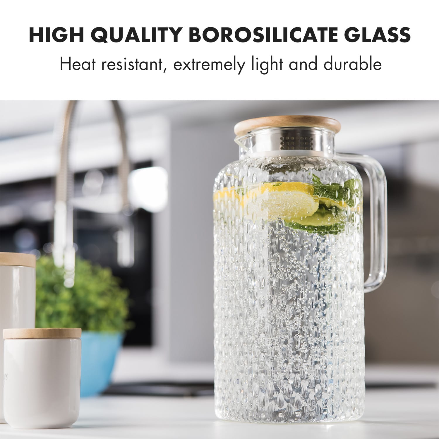 S pekným a praktickým džbánom na vodu Klarstein Livenza budeš vždy ideálne osviežený a primerane zásobený tekutinami.Sklenená karafa s objemom 1,9 litra je vyrobená z mimoriadne nerozbitného a žiaruvzdorného borosilikátového skla. Vďaka vyššiemu obsah bóru je tento materiál výrazne odolnejší proti rozbitiu, stabilnejší a tepelne odolnejší ako bežné sklo. Praktické sitko z ušľachtilej ocele vo vrchnáku z dubového dreva okrem toho pri nalievaní zadrží kúsky ovocia, lístky mäty alebo kocky ľadu. Svoju vodu tak môžeš ochutiť chutným ovocím bez toho, aby pri nalievaní skončilo v pohári! Karafa na vodu sa dá bez problémov vyčistiť ručne, ale tiež v umývačke riadu. Pre dlhodobú ochranu dreva sa odporúča vrchnák opláchnuť ručne.Sklenený džbán Klarstein Livenza sa svojím ryhovaným povrchom, štýlovým vrchnákom z dubového dreva a kvalitným sitkom z ušľachtilej ocele perfektne hodí do každého kuchynského prostredia.