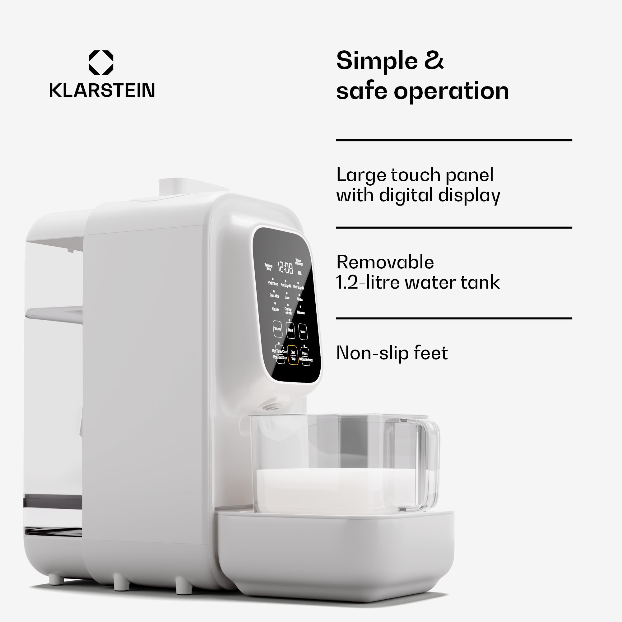 Maximálny výkon pre kvalitné vegánske nápoje a mnoho ďalšieho: výrobník vegánskych nápojov Klarstein Loire 4 v 1 je váš kuchynský pomocník na každý deň. Vďaka funkcii 4 v 1 vám v okamihu pripraví vegánske alternatívy mlieka, detskú výživu a ďalšie produkty. Môžete ho používať ako výkonný mixér a kuchynský robot. Vďaka rýchlemu ohrevu s výkonom 1200 W a motoru s výkonom 800 W je príprava všetkých nápojov, štiav a pyré rýchla a jednoduchá. Jeho vysokokvalitný mlynček so 4 čepeľami vykúzli zo surovín jemný základ pre nápoje. Najmä pre vegánov a ľudí s intoleranciou laktózy je vysokokvalitný mixér Klarstein Loire hitom: s ním si ľahko pripravíte sójové alebo orechové nápoje!Vďaka elegantnému, štíhlemu dizajnu a praktickej samočistiacej funkcii je výrobník vegánskych nápojov Klarstein Loire aj profesionálny mixér s mnohými prednastavenými funkciami. Obsluhuje sa jednoducho pomocou dotykových tlačidiel a displeja. Môžete používať prednastavené programy a individuálne nastaviť 12-hodinový časovač. Ideálny na privítanie rána čerstvo pripraveným nápojom. Súčasťou balenia je aj odmerka a čistiaca kefka.