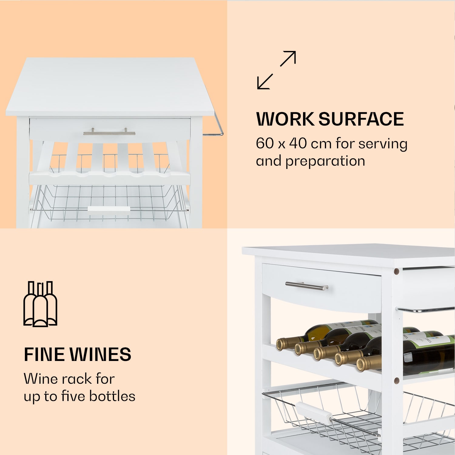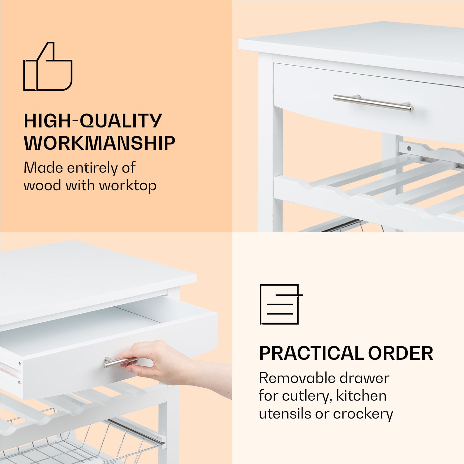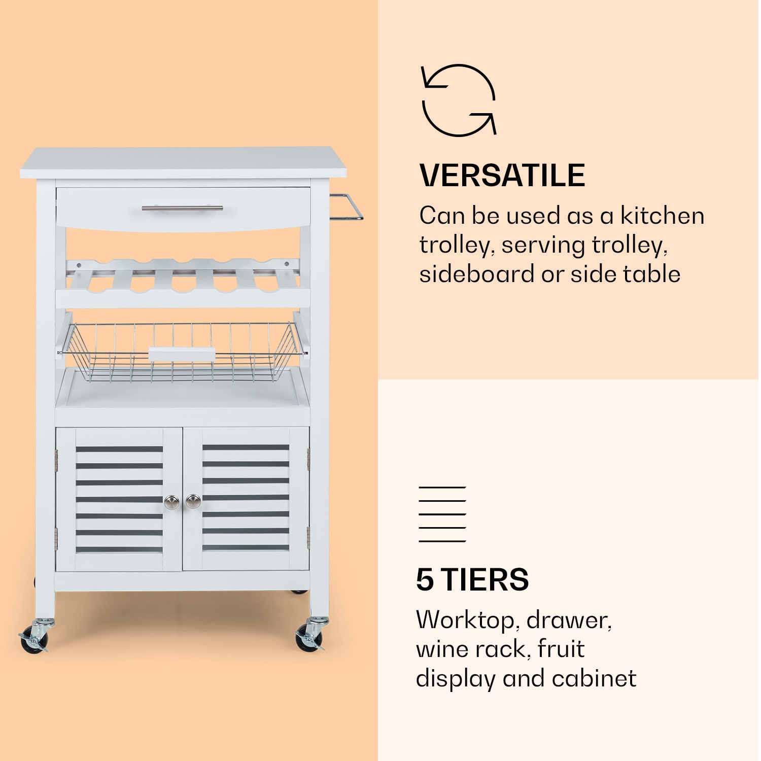 Luxusný úložný priestor do kuchyne, jedálne alebo tam, kde ho potrebujete: Klarstein servírovací vozík Louisiana je šikovné a elegantné doplnenie každej domácnosti. Na štyroch poschodiach ponúka kuchynský vozík rôzne možnosti ukladania pre vytvorenie poriadku a zároveň reprezentatívneho vzhľadu. Pritom je zariadenie Louisiana, ktoré je zhotovené kompletne z bambusového dreva, samo o sebe pastvou pre oči, ktorá je zvýraznená prvkami z nerezovej ocele. Použitím bambusu vsádza Klarstein nielen na vzhľad, ale aj na stálosť: Bambus rastie obzvlášť rýchlo, je odolný, robustný a navyše odpudzuje vodu, takže je viac ako vhodný pre zaťaženie v kuchyni alebo ako servírovací nábytok. V spodnej časti vozíka je priestranná skrinka, v ktorej možno dobre uskladniť riad alebo zásoby potravín a v prípade potreby sú k dispozícii. Nad ňou je vyberateľná miska na ovocie z nerezovej ocele – perfektná pre jednoducho dostupné uskladnenie jabĺk, pomarančov, papriky a iného ovocia a zeleniny. Ešte o poschodie vyššie sa nachádza latový rošt s držiakmi pre päť fliaš, kde možno umiestniť fľaše s vínom, olejom, octom alebo šťavami. Nachádza sa tu tiež jedna zásuvka na príbory alebo kuchynské nástroje, ako sú otvárače konzerv a strúhadlo na syr. Samozrejme možno kuchynský vozík Louisiana od spoločnosti Klarstein naplniť aj celkom inými vecami – nechajte priestor svojej fantázii. Okrem početných možností ako vytvoriť poriadok má vozík cez 2400 cm² veľké pracovné dosky. Hodí sa ideálne pre prípravu jedla v kuchyni, ako príborník alebo stolík v jedálni, alebo jednoducho ako odkladací priestor kdekoľvek ho potrebujete. Vode odolný bambus sa postará o to, aby sa pracovná plocha nepoškodila pri veľkej vlhkosti a ostala dlho pekná. Aby ste mohli rýchlo odstrániť nepríjemnosti alebo ešte riad krátko preleštiť, kuchynský vozík má k dispozícii okrem toho nerezový držiak na utierku. O rýchly prenos sa starajú štyri hladké gumové valčeky, s ktorými sa môže vozík posúvať bez námahy po byte alebo po terase. Dokonca hravo prekoná aj koberce s krátkym vlasom. Bezpečné a pevné postavenie má kuchynský vozík Louisiana od spoločnosti Klarstein vďaka dvom ručným brzdám, ktoré ho neochvejne držia na zvolenom mieste. Vezmite, prosím, na vedomie, že produkt je dodávaný ako montážna sada. Montáž je jednoduchá a môže byť vykonaná v priebehu jednej hodiny.