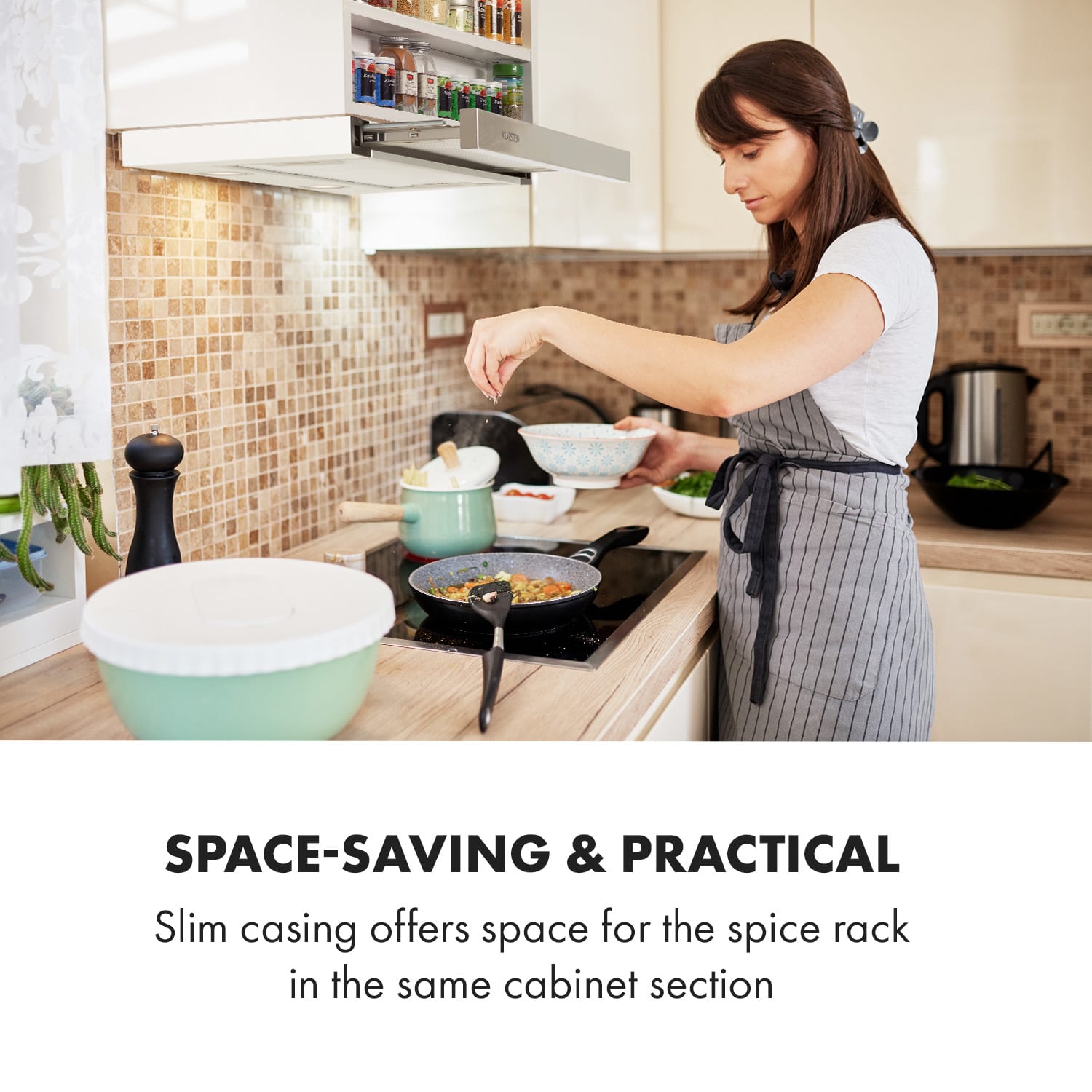 Čistejší vzduch v okamihu. Výsuvný plochý odsávač pár Klarstein Mariana 60 presvedčí silným výkonom, jednoduchou obsluhou a priestorovo úsporným dizajnom.Výsuvný digestor sa dá jednoducho a nekomplikovane namontovať pod kuchynské skrinky a vďaka svojmu kompaktnému dizajnu ponecháva dostatok priestoru na police a úložný priestor na koreniny alebo kuchynské náradie. Spodná koľajnica odsávača pár sa vytiahne len jedným pohybom a plocha tukových filtrov sa zdvojnásobí, aby sa rýchlo a efektívne stratil zápach z jedla, dym aj výpary s maximálnym odsávacím výkonom 500 m3/h. Intenzita odsávania vzduchu odsávača pár sa dá regulovať priamo na zariadení pomocou tlačidiel. Dve LED svetlá okrem toho zaručujú neobmedzený výhľad na celý proces varenia. Na ochranu vnútra odsávača a odsávacieho kanála pred znečistením má zariadenie Mariana dva vymeniteľné hliníkové tukové filtre, ktoré je možné umývať v umývačke riadu. Všestranný, výkonný a neuveriteľne kompaktný: výsuvný odsávač pár Klarstein Mariana 60 s inteligentným výsuvným mechanizmom sa postará v každej chvíli o kuchyňu bez výparov.