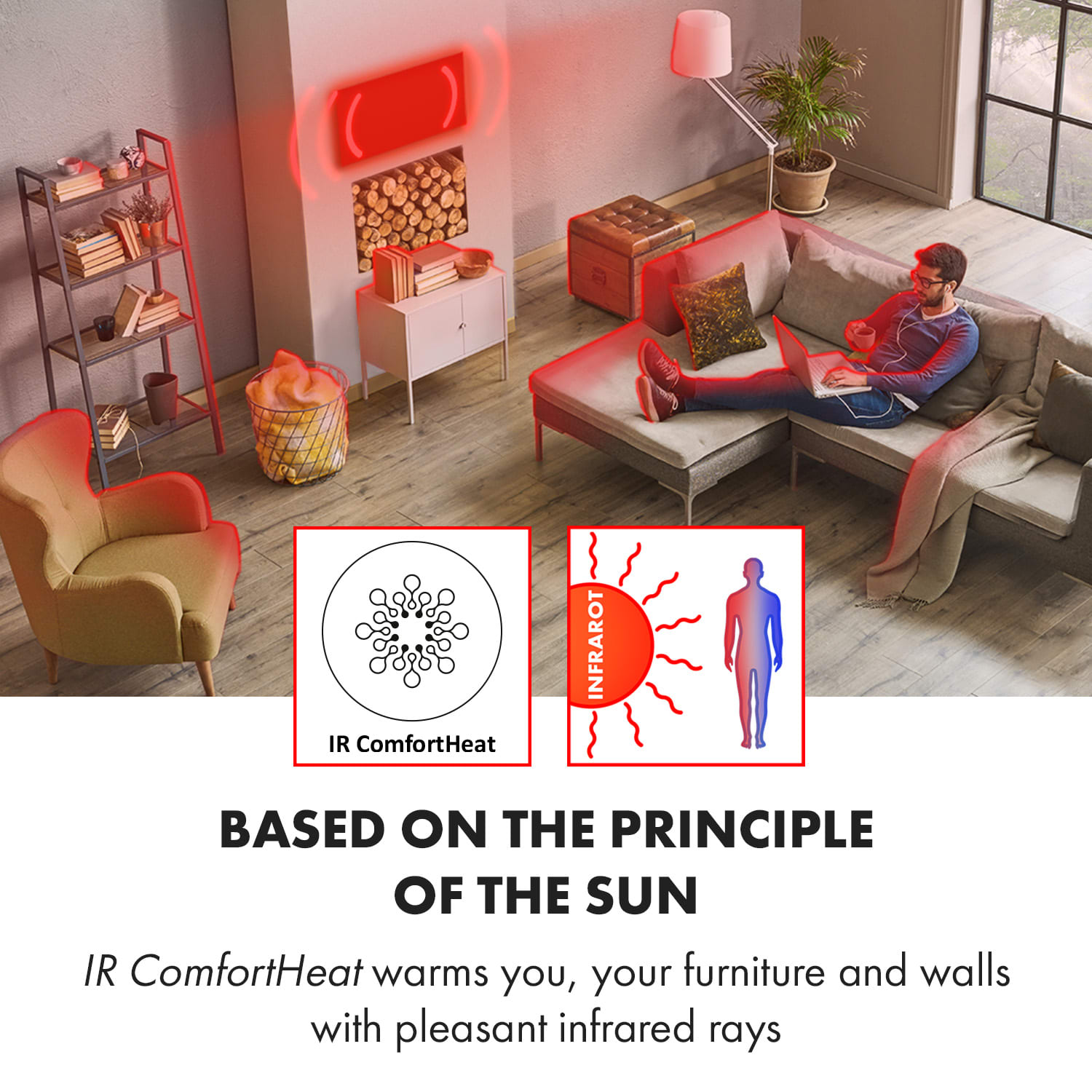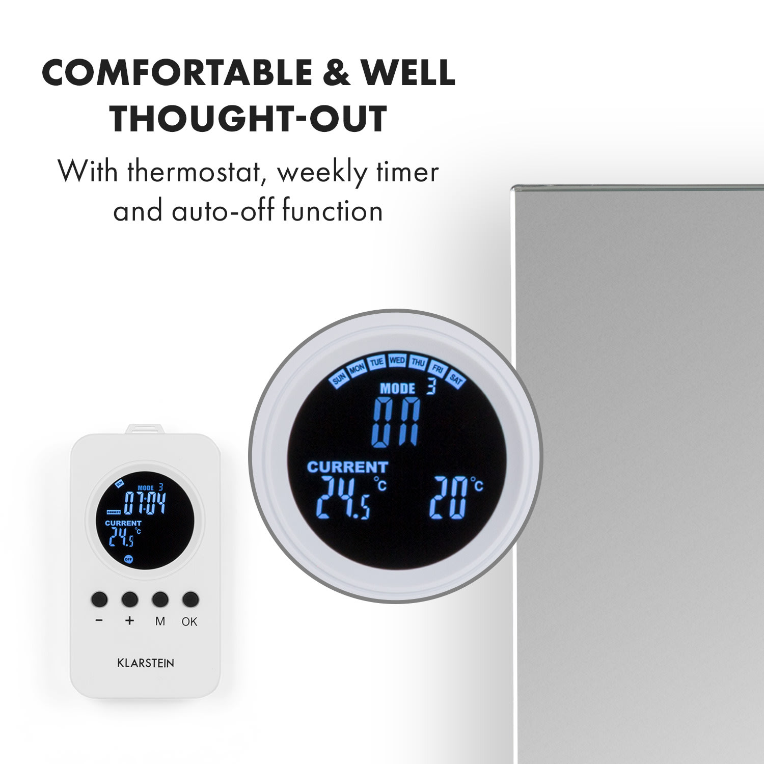 Zrkadlo s vyhrievaním na stene: inovatívny infračervený ohrievač Klarstein Marvel Mirror je účinný, rýchly zdroj tepla a praktické nástenné zrkadlo v jednom. Sofistikovaný vyhrievací panel vás okamžite zahreje zdravým, príjemným infračerveným žiarením, ktoré zbytočne neohrieva okolitý vzduch. Vďaka tomu je váš nový elektrický ohrievač mimoriadne energeticky účinný: celých 98 % absorbovanej energie sa premieňa na tepelné žiarenie. Sofistikované funkcie, ako je automatické vypnutie, OpenWindow Detection, termostat a programovateľný týždenný časovač, robia zo zrkadla s funkciou vyhrievania exkluzívny zdroj tepla, ktorý vám vďaka stupňu ochrany IP20 sľubuje dlhodobú prevádzku v kúpeľni. Inovatívny infračervený ohrievač Klarstein Marvel Mirror : Dizajnovo silné magické zrkadlo, ktoré vás nečakane obklopí príjemným teplom. Tento Infrapanel je ideálnym riešením pre moderné kúpeľne.