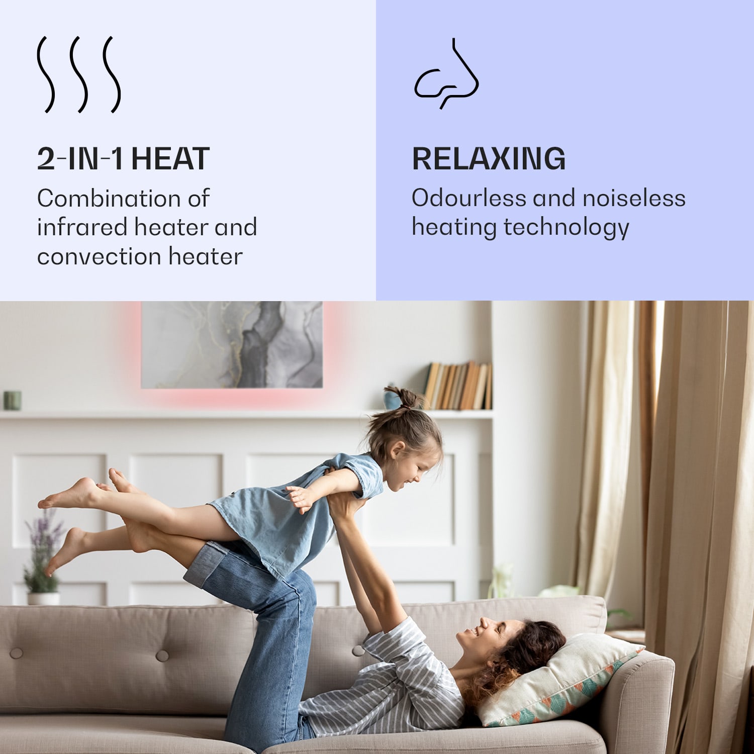 Dvojitý výkon pri rovnakej veľkosti, Klarstein Mojave ohrievače 2 v 1 šikovne kombinujú infračervený sálavý ohrievač s konvektorom a tým nielen rýchlo vytvárajú citeľné infračervené teplo v priestorovo úspornom dizajne, ale vytvárajú aj príjemne teplý vzduch v miestnosti prostredníctvom tepla stúpajúceho zo zadnej strany. V závislosti od veľkosti miestnosti si môžete vybrať ohrievač s výkonom 500, 750, alebo 1000 W. Termostat, ktorý možno nastaviť v stupňoch, a týždenný časovač sa ovládajú veľmi inteligentne prostredníctvom aplikácie Klarstein alebo diaľkovým ovládaním. Vďaka ochrannej triede IP44 sú konvektory ideálne aj do kúpeľne. Nezáleží na tom, kam zavesíte svoj nový vykurovací panel Klarstein Mojave Smart, so svojím farebným ambientným svetlom RGB vytvorí tú správnu atmosféru, nech ste kdekoľvek.