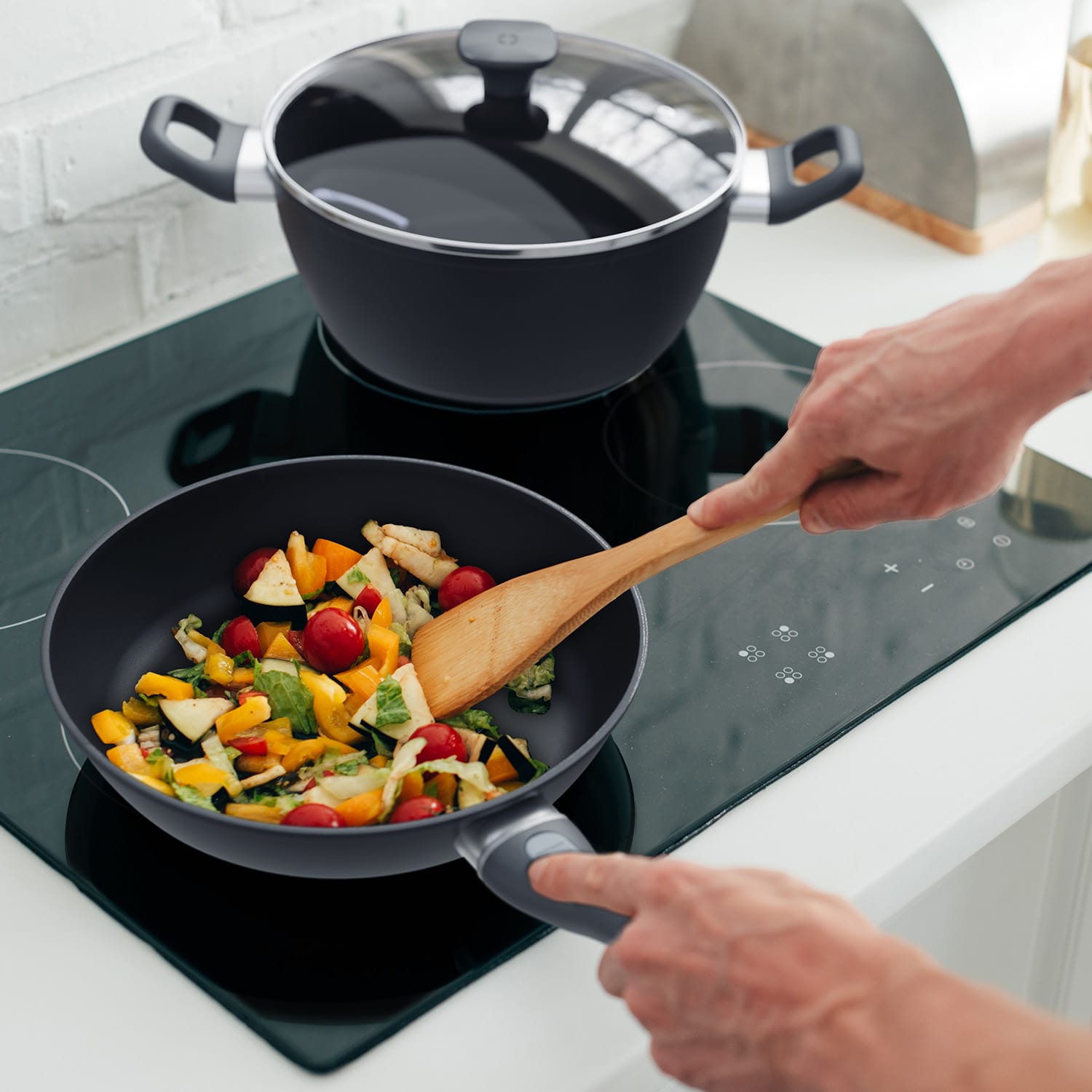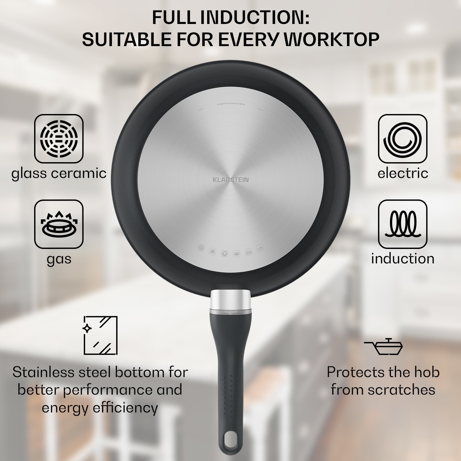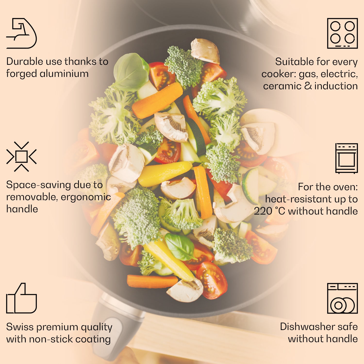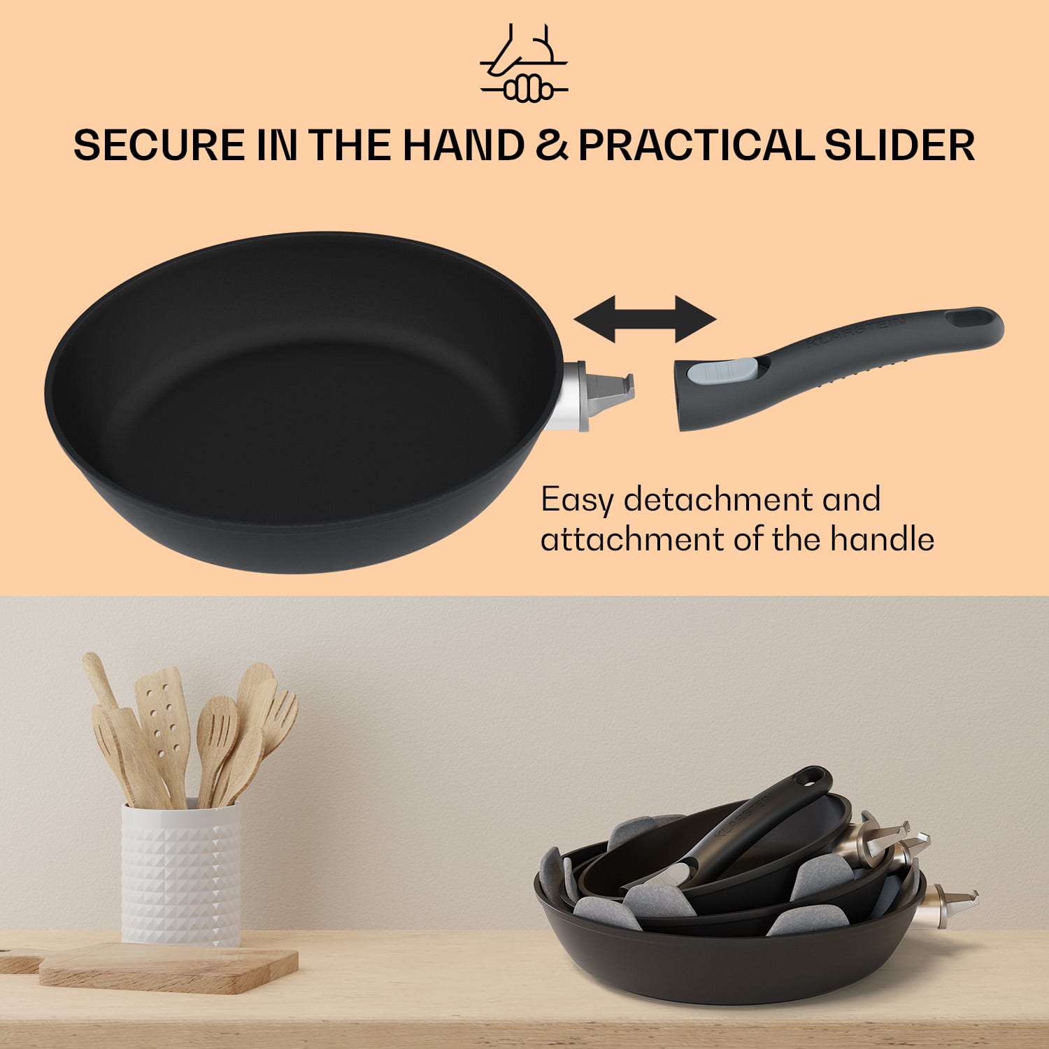 Či už ide o vyprážané vajíčko na raňajky, chrumkavé výdatné vyprážané zemiaky alebo šťavnatý steak: So súpravou panvíc Klarstein Noto Endurance máte vždy po ruke tú správnu panvicu a môžete si vyberať z odolnej súpravy panvíc s povrchovou úpravou vo švajčiarskej prémiovej kvalite. Vďaka trojvrstvovému nepriľnavému povrchu ILAG Ultimate s keramickou výstužou je každá jedna panvica mimoriadne odolná. Zažite zdravé pečenie, pri ktorom sa takmer úplne zaobídete bez oleja a tuku. Sada panvícje vhodná na všetky typy sporákov, najmä na indukčné, pričom spodná strana z nehrdzavejúcej ocele chráni váš sporák pred poškriabaním a zaisťuje dokonalé rozloženie tepla. Sofistikovaný štýl jednotlivých panvíc vám ponúka maximálny komfort pri každom varení: Rukoväť zostane vždy chladná, ergonomicky a mäkko sadne do ruky a môžete ju dokonca vybrať pomocou posuvnej funkcie. Svoju novú panvicu tak môžete jednoducho umyť v umývačke riadu alebo ju môžete bez rukoväte vložiť do rúry kde zvládne teploty až do 220 °C. Aby ste mohli svoje vysokokvalitné panvice bez obáv ukladať do skrine, súprava panvíc obsahuje dva plstené chrániče, ktoré môžete jednoducho umiestniť medzi panvice alebo použiť ako podložku. So súpravou panvíc Klarstein Noto Endurance môžete energeticky efektívne sršať v kuchyni a vďaka odnímateľnej rukoväti zažijete prekvapivé pohodlie pri varení!