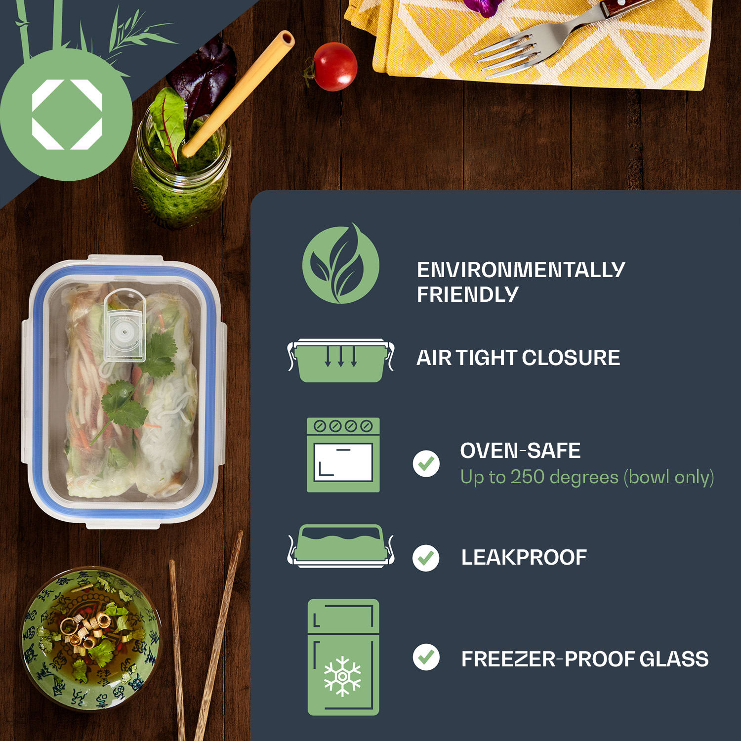 S kvalitnými, obdĺžnikovými sklenenými dózami od Klarstein bambuswaldu zostanú jedlá aj potraviny dlho čerstvé. Vrchnák s otvorom prilieha vzduchotesne, takže skladované potraviny si dlho zachovajú svoju arómu. Nádoby na potraviny sú okrem toho vďaka bezpečným, dobre tesniacim uzáverom nepretekajúce. Sklo misky je mimoriadne odolné proti teplu aj chladu. Sklenená dóza Klarstein bambuswald vo výhodnej súprave 4 kusov je vhodná do rúry alebo mikrovlnky (bez vrchnáka) a aj v mrazničke si zachová svoj krásny tvar.