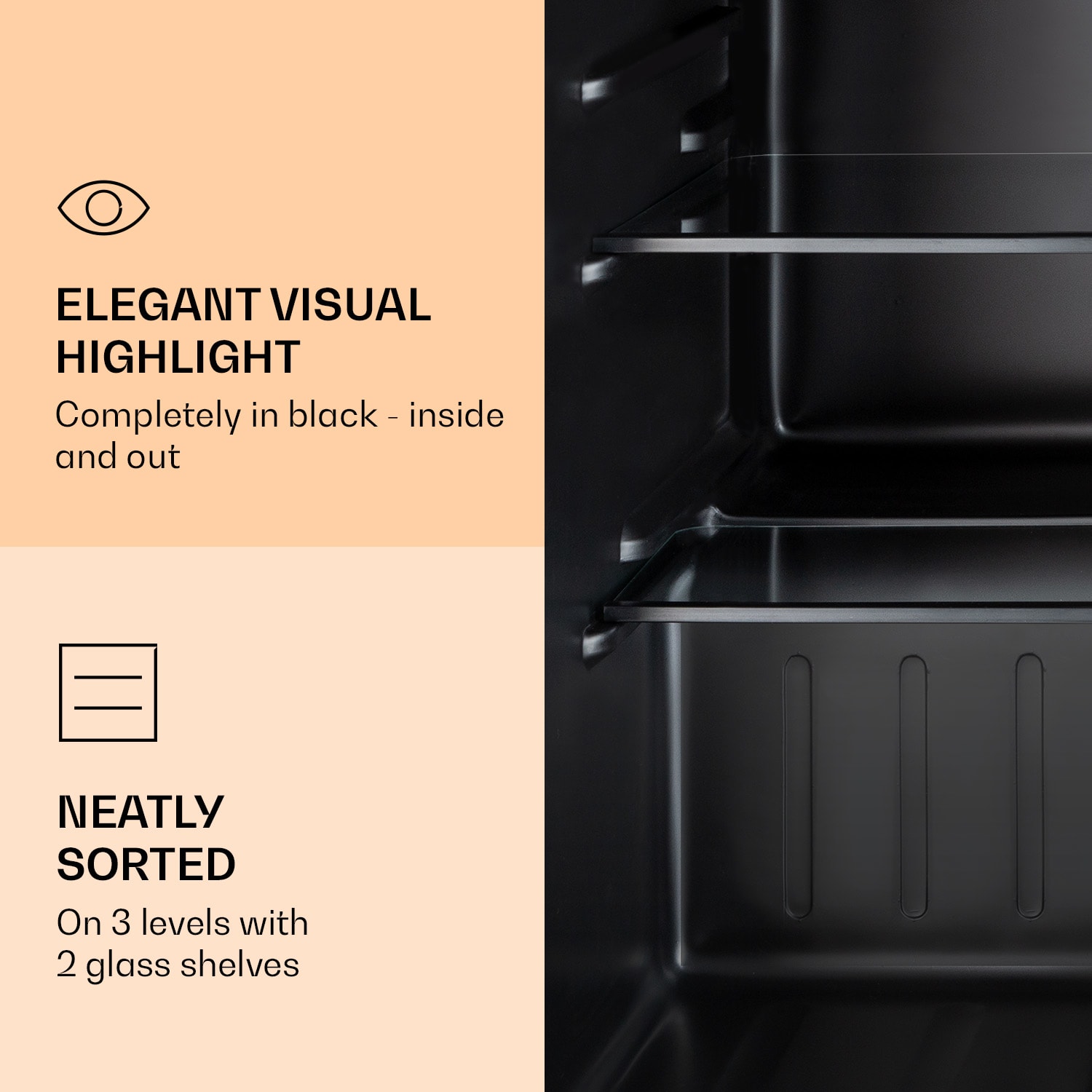 Čierna je krásna! Chladnička Obsidian od Klarstein je nielen kompaktná, ale zaujme aj svojím extravagantným dizajnom: je úplne čierna – zvonku aj zvnútra – a v kuchyni je skutočným pútačom pozornosti.Chladnička Obsidian od Klarstein s úžitkovým objemom 72 litrov ponúka na 3 policiach dostatok priestoru pre všetky druhy potravín. V 2 priehradkách vo dverách nájdete potrebný úložný priestor na fľaše a poháre a dokonca aj mraziacu priehradku. ôžete si vytvoriť individuálny poriadok s 2 sklenenými policami, ktoré môžete použiť v závislosti od vašich potrieb.Čierna, kompaktná a moderná: chladnička Obsidian od spoločnosti Klarstein.