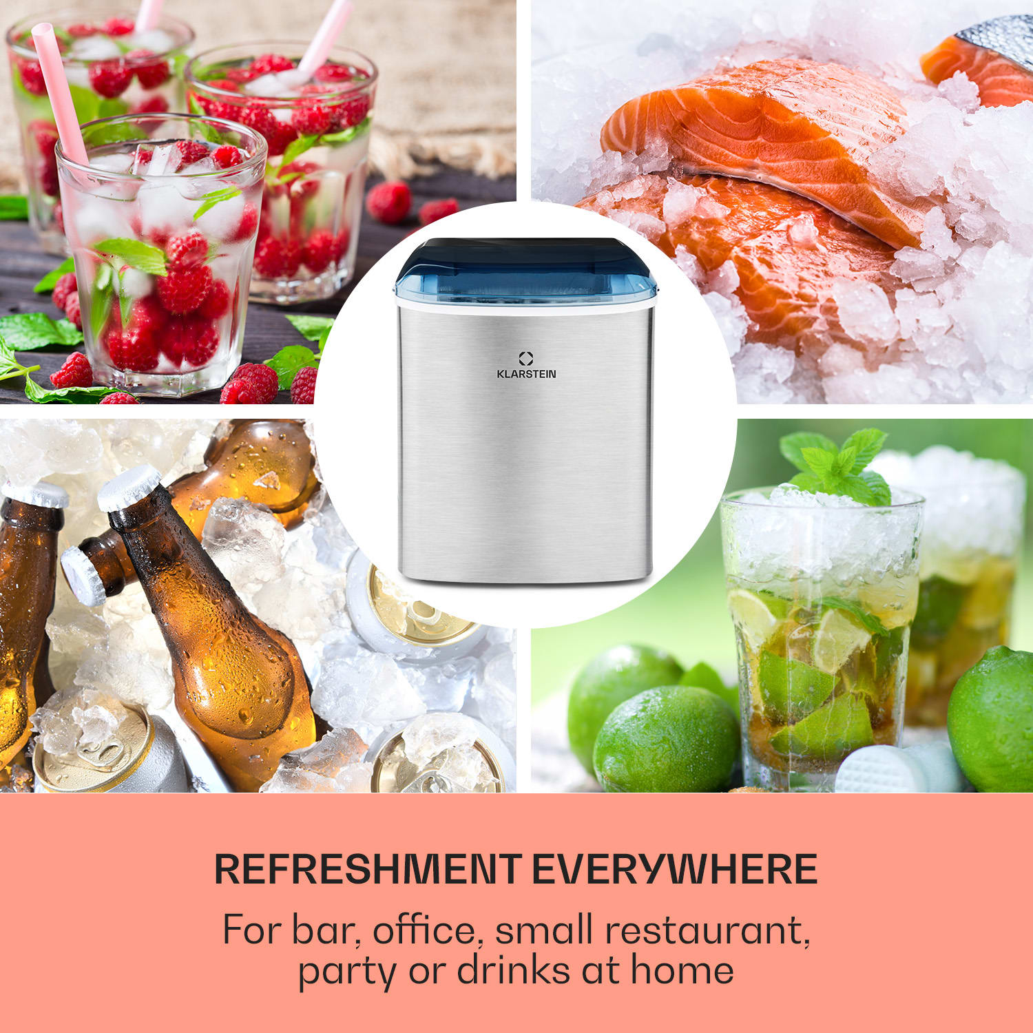 S Klarstein On-The-Rocks ľadomatom obdržia miešané drinky extra ľadové guličky! Malý ale výkonný: So svojimi priestorovo úspornými rozmermi si Klarstein On-The-Rocks výrobník ľadu nájde ľahko priestor aj na tých najmenších barových pultoch a zásobí večierky, párty a podujatia s osviežujúcimi kockami ľadu v tvare guľky. Po šiestich až dvanástich minútach padajú prvé kocky ľadu do 0,6 kg zásobníka. Tento malý silák vyrobí až 12 kg kociek ľadu v priebehu 24 hodín – a vďaka priehľadnému veku sa môžete priamo pozerať ako rastú. Aby ľadové kocky mali vhodnú veľkosť, môžete si pri výrobe stlačením tlačidla vybrať medzi malým a veľkým rozmerom. Ak v nádobe s objemom 2,1 litra hrozí chod na prázdno alebo keď je zásobník plný, upozorní Vás na to varovný signál a ľadomat preruší svoju činnosť. Obsluha Klarstein On-The-Rocks ľadomatu je úplne jednoduchá cez softtouch ovládanie s farebnými signálovými LEDkami pre zvolené nastavenia. Vďaka najmodernejšej chladiacej technike sú zvuky počas prevádzky príjemne tiché, takže nerušia atmosféru podujatia. Neutrálne a antibakteriálne materiály vnútra prístroja garantujú nerušenú radosť z osvieženia. A pretože po párty znamená pred párty, prístroj je vďaka automatickému čistiacemu programu bleskurýchle znova čistý. Klarstein On-The-Rocks výrobník ľadu sa postará o osviežujúce kocky ľadu v každom drinku.