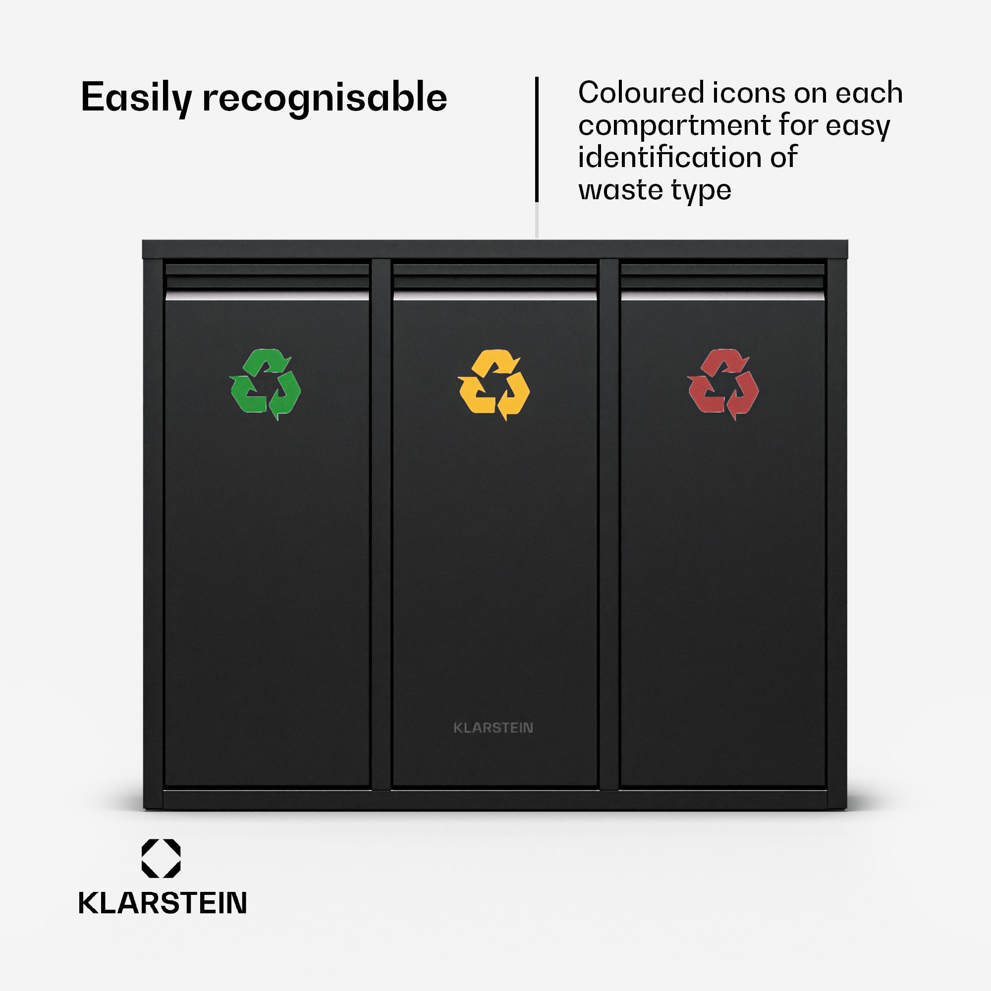 Jednoduché separovanie odpadu v záujme životného prostredia: Odpadkový kôš Klarstein Ordnungshüter 3 pohltí a oddelí všetok odpad vo svojom trojdielnom vnútornom priestore.Odpadkový kôš Klarstein Ordnungshüter 3 neponúka len jeden, ale tri koše – jednoduché triedenie odpadu. Vo vnútri 45-litrového odpadkového koša čakajú na naplnenie odpadom 3 robustné 15-litrové plastové koše z PE: Farebné označenie žltou, zelenou a hnedou farbou umožňuje každému ľahko zistiť, ktorý kôš má obsahovať recyklovateľný materiál, kompostovateľný organický odpad a zmesový odpad. Koše sa pri plnení naklápajú dopredu, čím sa odhalí ich vkladací otvor. Každý kôš je možné vybrať jednotlivo pomocou chrómovanej kovovej rukoväte, keď je naplnený a je potrebné ho vyprázdniť. Vonkajší kryt z práškovo lakovanej nehrdzavejúcej ocele zabezpečuje jednotný vzhľad a dodatočnú stabilitu. Aby bolo možné triediť odpad bez toho, aby ste sa museli zohýbať, Ordnungshüter 3 možno zavesiť na stenu v pohodlnej výške. Vďaka predným klapkám z brúsenej nehrdzavejúcej ocele pôsobí atraktívne aj v tomto umiestnení.Pre životné prostredie: S odpadkovým košom Klarstein Ordnungshüter 3 je triedenie odpadu hračkou.