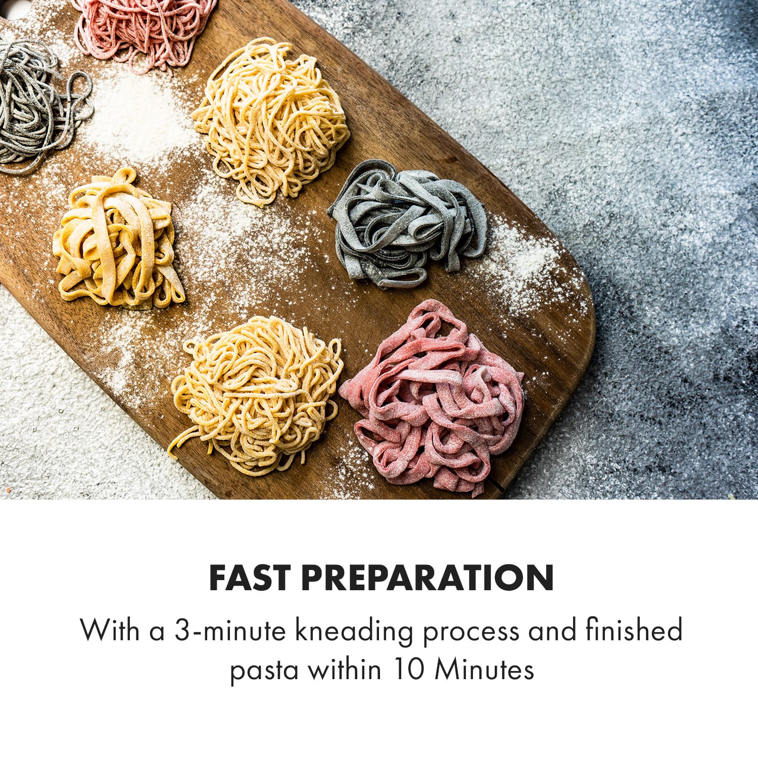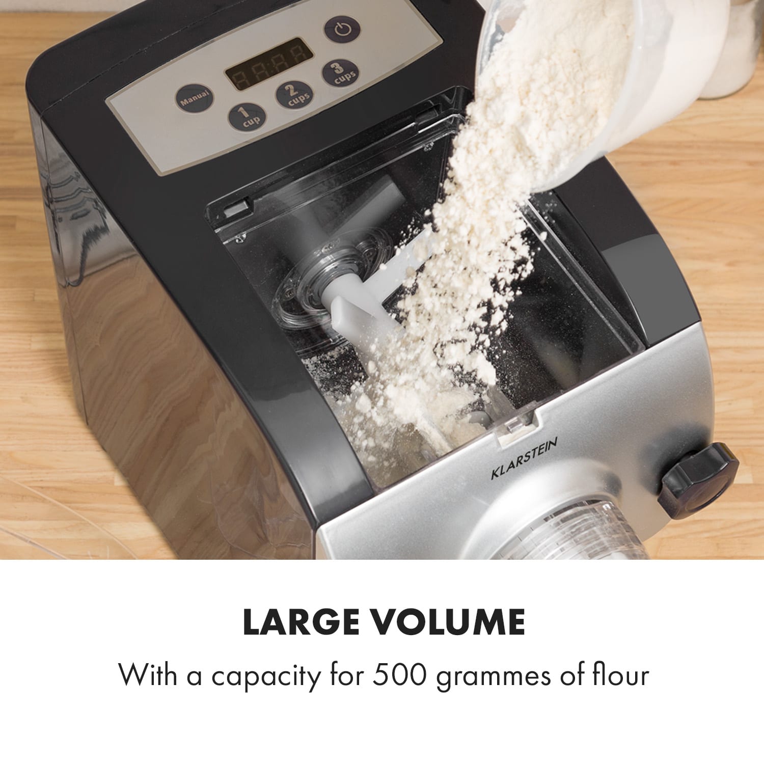 Vychutnajte si lahodný svet cestovín: so zariadením na výrobu cestovín Klarstein Pastamania sa nekladú medze rôznorodosti vyrobených cestovinových výtvorov.Motor zariadenia Pastamania má vysoký výkon 260 W a je mimoriadne tichý s prevádzkovým hlukom 60 dB. Vo vnútri šikovného zariadenia je možné vymiesiť až 500 g múky za 3 minúty a už po 10 minútach môžete hádzať do vriacej vody pripravené cestoviny. 7 nadstavcov formuje cesto a tvorí tie najkrajšie cestovinové výtvory, ktoré sú dokonca doplnené priloženou formou na ravioli. Zariadenie pracuje úplne automaticky až na pridanie 1, 2 alebo 3 možných odmeriek naplnených múkou a zodpovedajúceho množstva vody. Všetky nastavenia sa pritom pohodlne uskutočňujú stlačením 5 tlačidiel a dajú sa kontrolovať na prehľadnom LED displeji. Všetky zabudované plastové diely sú vhodné na spracovanie potravín a po použití sa dajú ľahko umyť a vyčistiť.Vďaka modernému dizajnu, jednoduchému ovládaniu a rôznorodosti cestovinových výtvorov je zariadenie na výrobu cestovín Klarstein Pastamania nevyhnutnosťou pre všetkých milovníkov cestovín.