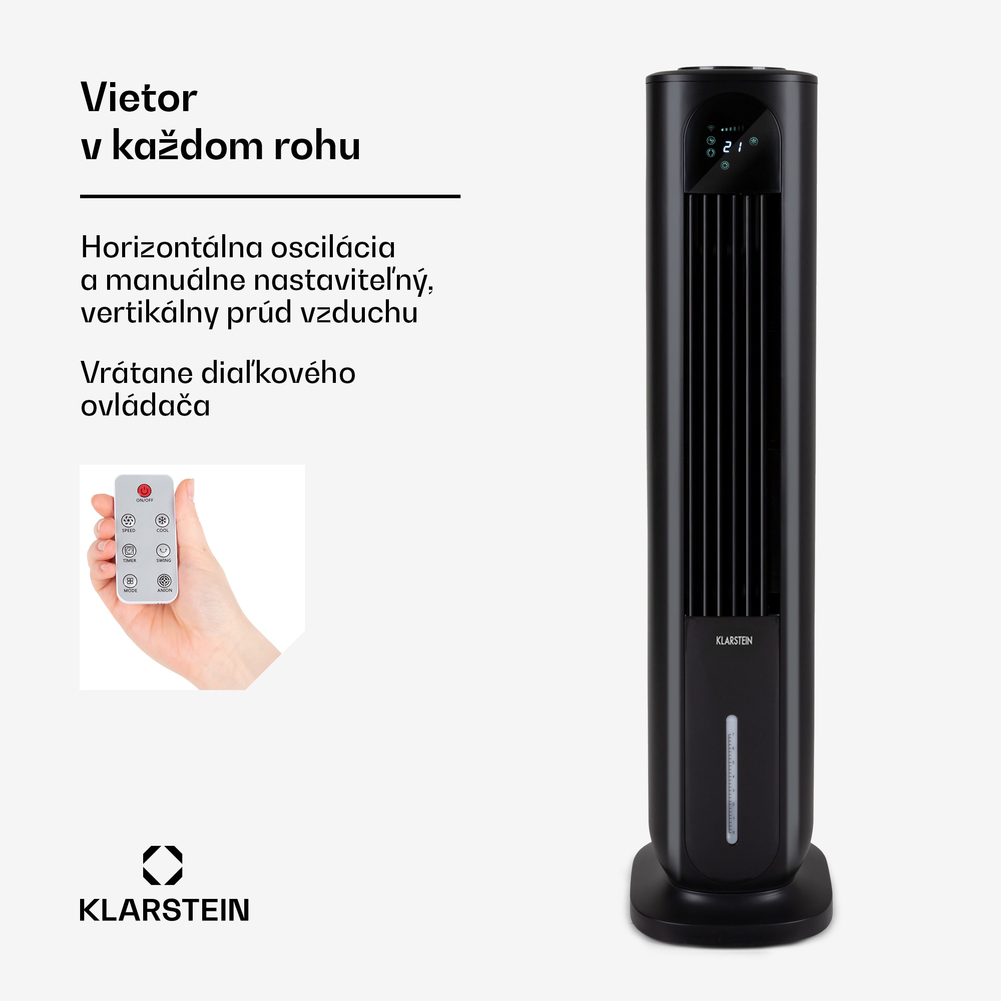 Maximálne smart osvieženie! Ochladzovač vzduchu 4-v-1 Klarstein Polar Towar Smart prináša priame ochladenie počas horúcich letných dní. Ako ventilátor, ochladzovač, zvlhčovač a čistička vzduchu v jednom, sa všade stará o osviežujúci prúd vzduchu a o chladnú hlavu. Obzvlášť smart, čo sa týka témy ako ostať cool. Pomocou WiFi pripojenia dávaš cez smartfón alebo iPhone úplne jednoducho príkazy ochladzovaču vzduchu Klarstein Polar Tower Smart a to úplne odvšadiaľ. Samozrejme môžeš aj cez ovládací panel alebo diaľkový ovládač úplne individuálne nastaviť príjemný prúd vzduchu. Štyri rýchlosti fúkania, zapínateľná horizontálna oscilácia a časovač nastaviteľný v hodinových krokoch až do 24 hodín, to všetko umožňuje precízne nastavenie na aktuálne požiadavky na osvieženie. Klarstein Polar Tower Smart dodatočne disponuje tromi prevádzkovými režimami. Okrem normálneho režimu, simuluje prírodný režim silnejší a slabší vietor. Nočný režim pracuje na podobnom princípe, ale postupne znižuje maximálnu rýchlosť vetra, až kým sa zariadenie vypne. Aj ako čistička vzduchu sa Klarstein Polar Tower Smart osvedčil. Zapínateľná funkcia ionizácie zo vzduchu odstraňuje čiastočky prachu a zápachov a dovolí ti voľne sa nadýchnuť.V kombinácii s funkciou ochladzovača sa efekt osvieženia ešte zosilní. Chladenie okolitého vzduchu prebieha pomocou prirodzeného princípu vyparovania vody: ochladzovač vzduchu 4-v-1 nasáva teplý vzduch zo zadnej strany prístroja a zvlhčí ho. Takto sa prirodzením vyparovaním vody ochladí vychádzajúci prúd vzduchu. To prináša priame ochladenie tela pri každej činnosti. Okrem toho je vzduch zvlhčovaný, čo prináša uvoľnenie počas horúcich dní alebo pri suchom vzduchu z vykurovania. Na dosiahnutie dlhej prevádzky, sa dá vodná nádrž naplniť až 7 litrami vody. Až päť vymeniteľných chladiacich akumulátorov na želanie znížia teplotu vody pre ešte výraznejšie osvieženie. Na jednoduché plnenie, čistenie a vyprázdňovanie sa dá vodná nádrž úplne vybrať. S celkovým príkonom 85 wattov je Polar Tower Smart práve v dlhodobej prevádzke ekologickou alternatívou ku klimatizácii.Osvieženie bez hraníc, vďaka zabudovaným kolieskam je ochladzovač vzduchu Klarstein Polar Tower Smart úplne prenosný a vykonáva svoju službu práve tam, kde je potrebný chladný vánok.