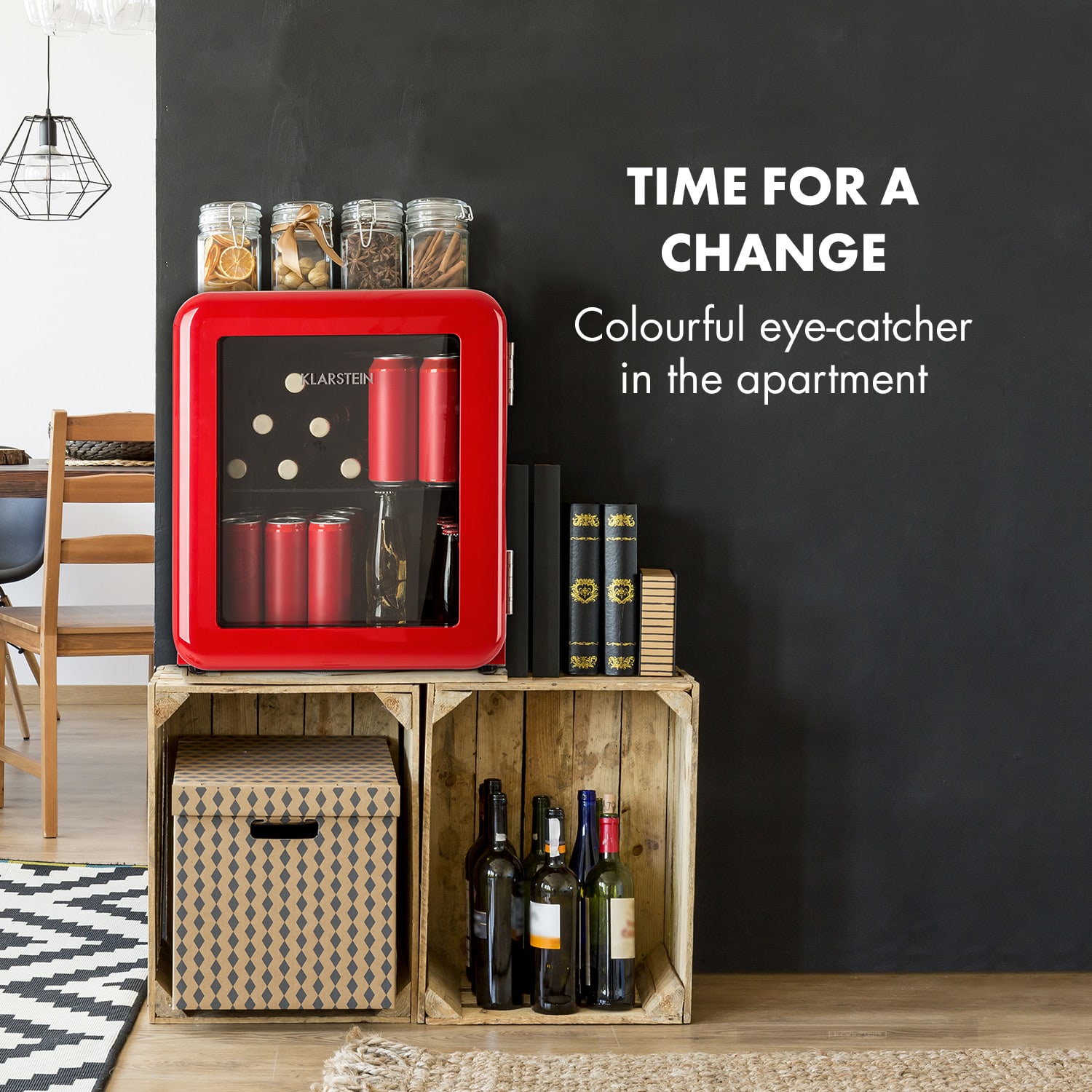 Zo štýlovej chladničky na nápoje Klarstein PopLife v retro vzhľade päťdesiatych rokov chutia čerstvo vychladené pochúťky obzvlášť výborne. Či už nápoje, alebo občerstvenie: štýlovo kompaktná chladnička PopLife má vo svojom 48-litrovom interiéri vždy nejakú drobnosť na zahryznutie. Vďaka svojej triede energetickej účinnosti E pracuje mimoriadne šetrne k životnému prostrediu. Pomocou veľkého regulátora na zadnej strane sa dá teplota nastaviť individuálne na hodnotu medzi 0 a 10 stupňami. Dvere s dvojitým sklom nielen dobre vyzerajú, ale tiež poskytujú rýchly prehľad o obsahu chladničky na nápoje. Interiér má štýlovú čiernu farbu, čo umocňuje luxusný efekt zariadenia. Ohnivá farba a zaoblené tvary vyžarujú nadčasový retro šarm a z chladničky robia v akejkoľvek miestnosti dekoratívny doplnok domácnosti. Kompaktná, praktická, s dokonalými tvarmi: retro chladnička PopLife od spoločnosti Klarstein. Táto chladnička na nápoje je ideálnym riešením pre každého, kto hľadá štýlový a funkčný doplnok do domácnosti.