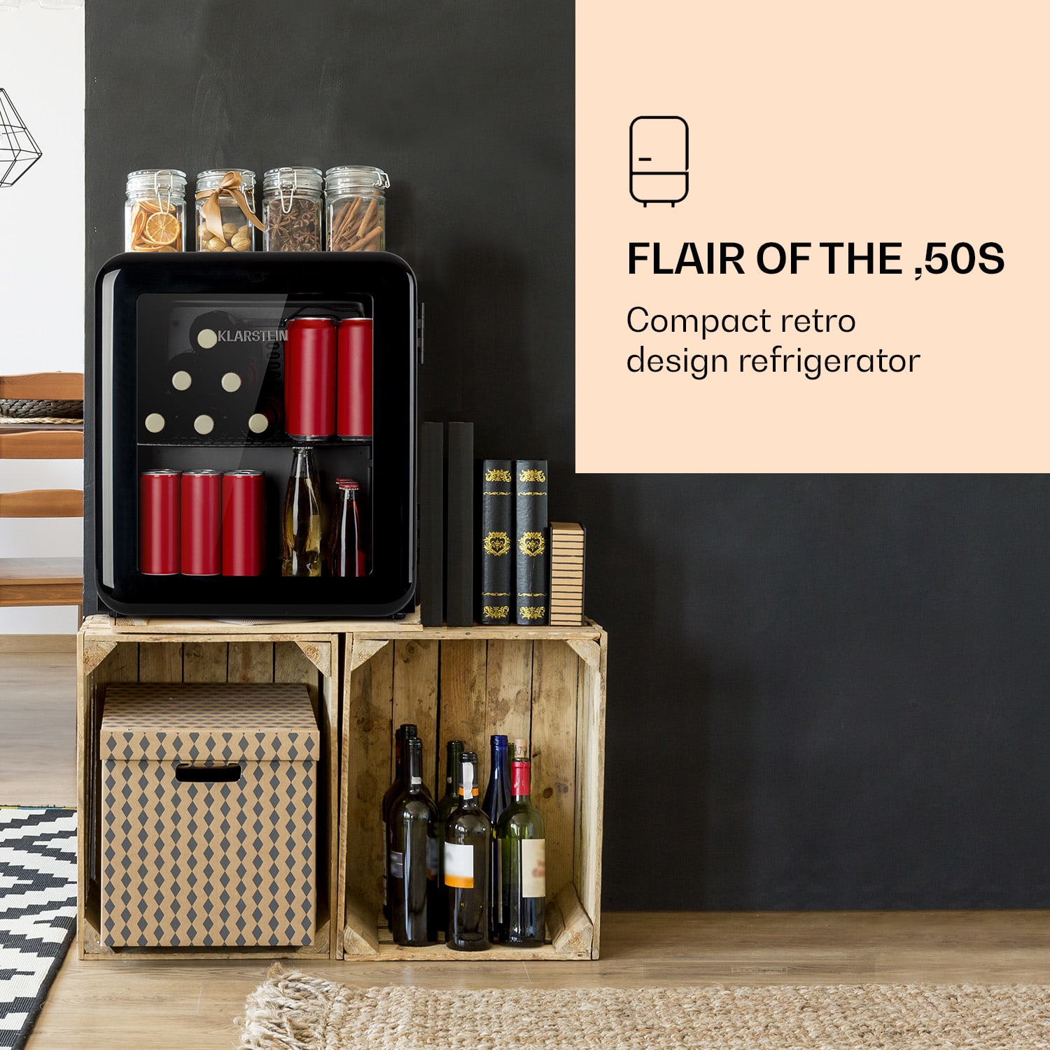 Čerstvo vychladené dobroty zo štýlovej chladničky na nápoje PopLife od Klarstein chutia obzvlášť dobre! Či už ide o nápoje alebo občerstvenie: štýlová chladnička PopLife má vždy vo svojom vnútri, s objemom 48 litrov, pripravenú nejakú maličkosť. Zároveň je ekologická a úsporná. Táto chladnička na nápoje je ideálna pre každú príležitosť. Kompaktná, praktická a pekná: retro chladnička PopLife od Klarstein.