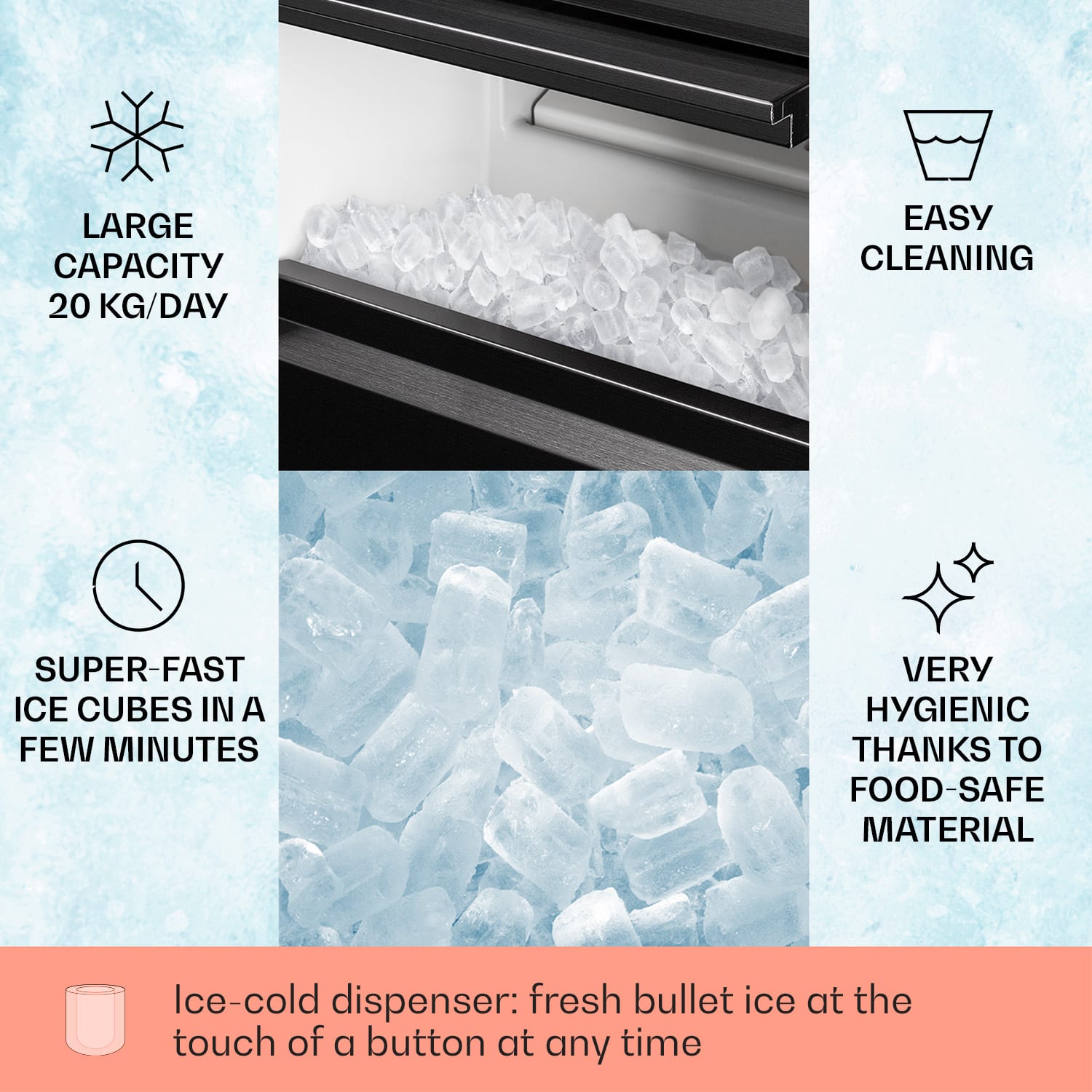 Ľadová sviežosť! S výrobníkom ľadu Klarstein Powericer XL budeš dobre pripravený v barovej prevádzke aj na podujatiach s potrebou veľkého množstva ľadu. Vďaka objemu výroby 20 kg kužeľovitého ľadu za deň nevzniknú problémové chvíle, a to bez hlučnosti. Vo veľkej zbernej nádobe je možné skladovať až 3,5 kg ľadu a v prípade potreby ho možno vybrať na chladenie nápojov alebo pultov s chladenými potravinami.Vďaka jednoduchému krytu z nehrdzavejúcej ocele sa výrobník ľadu Klarstein Powericer XL bez problémov začlení do prostredia barov aj kuchýň.