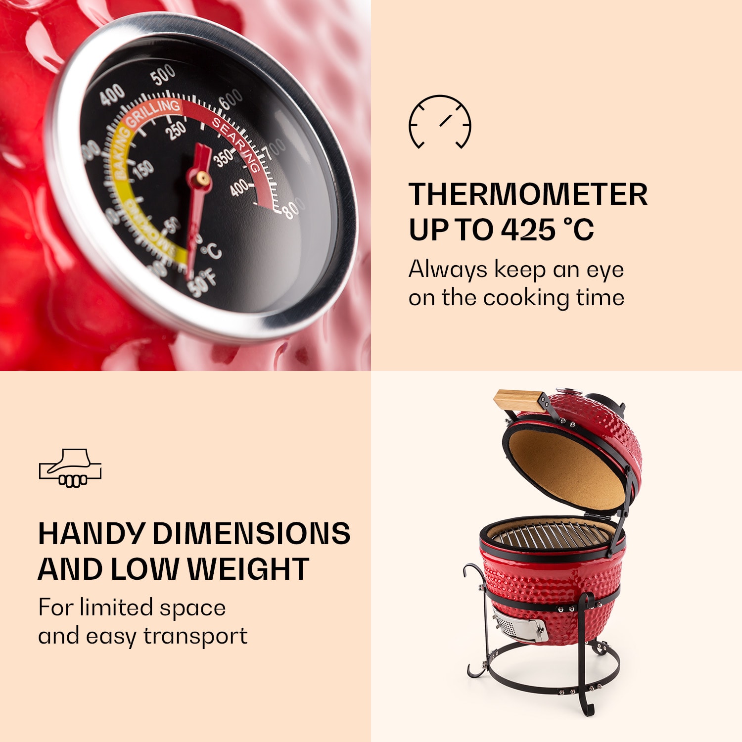 Objavte kamado, keramický barbecue zázrak z USA. Kamado grily, inšpirované japonskou rúrou na ryžu, nadchli v 60. rokoch gril majstrov na celkom svete. Klarstein prináša s kamado grilom Princesize výhody a tajomstvá oválneho keramického grilu k Vám domov. Keď ho raz vyskúšate, už sa ho nikdy nevzdáte! Pretože keramický gril je vybavený výhodami, s ktorými tradičné grily súperiť nedokážu. 2 cm hrubá keramická stena má mimoriadnu schopnosť udržiavania vysokej teploty. Prijíma teplo, rovnomerne ho rozdeľuje a odovzdáva ho po celom vnútri. Vďaka vzduchotesnému veku dosahuje keramický gril s extrémne malým množstvom paliva – až o 50% menej uhlia ako tradičné grily – teploty v rozmedzí od 50 °C do 425 °C. K tomu oválny tvar vytvára tepelný podtlak ako pri normálnej rúre, ktorý sa dá ovládať prostredníctvom posúvacieho vetráka na spodnej strane zariadenia. Veľmi jednoducho možno teda regulovať teplotu vo vnútri a používať zariadenie Princesize nielen ako klasický gril s roštom na grilovanie, ale aj na pomalé pečenie počas dlhých hodín (slowcooking) alebo na údenie. Farebný teplomer na veku zobrazuje vnútornú teplou a uľahčuje reguláciu teploty. Materiál a forma keramického grilu Princesize od spoločnosti Klarstein udržiavajú vlhkosť vo vnútri, takže grilované jedlo nevyschne a ostane vyslovene šťavnaté. Prekvapte Vašich blízkych dokonalými rebierkami alebo steakmi a bravčovým mäsom v novom horizonte grilovania. Samozrejme môžete pri odklopenom veku piecť na ploche 615 cm². Aj čistenie grilu je veľmi jednoduché. Gril sa jednoducho po použití rozohreje na 350 °C, čím sa vo vnútri vypália sadze, tuk i zvyšky jedál. Kamado záhradný gril Princesize od spoločnosti Klarstein je vhodný predovšetkým pre gril majstrov so stiesnenými priestorovými podmienkami alebo pre tých, ktorý svoj gril radi berú na výlety. Na menšie vzdialenosti sa ľahko prenesie a zmestí sa do kufra auta alebo do ručného vozíka. V cieli sa jednoducho rozloží stabilný stojan z ušľachtilej ocele a na neho sa umiestni kupola grilu. Opticky gril Princesize púta pozornosť na každej záhradnej párty: Glazúrovaná, červená keramika, a stojan z ušľachtilej ocele v liatinovom dizajne garantujú pohľady všetkých hostí nielen na jedlo z keramického grilu od spoločnosti Klarstein. Dostupné farby: červená glazúra, čierna glazúra (produkt 10029123)