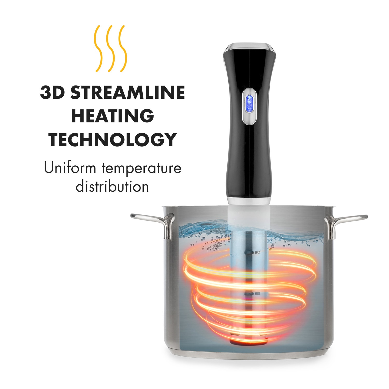 Uvedomelo žiť znamená uvedomelo variť i uvedomelo jesť. Klarstein Quickstick je precízne zariadenie navrhnuté podľa tejto filozofie.Pomocou špeciálneho procesu varenia, ktorý zachováva vitamíny a minerály, šetrne ohrieva až 20 litrov v teplotnom rozsahu od 50 do 95 °C. Vďaka výkonu 1300 W sa obsah ohrieva mimoriadne rýchlo a výkonné obehové čerpadlo zabezpečuje konštantnú teplotu vody. Vďaka tomu je ideálny na varenie pri nízkych teplotách, ohrievanie a udržiavanie tepla. Ovládanie pomocou dotykového displeja LCD je hračka. Zdravo a bezpečne: inteligentné automatické vypínanie zabraňuje pripáleniu a pretečeniu.