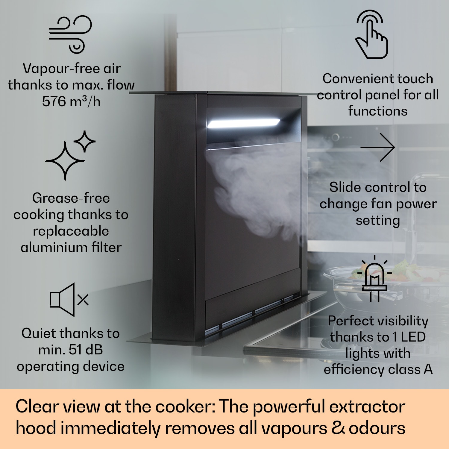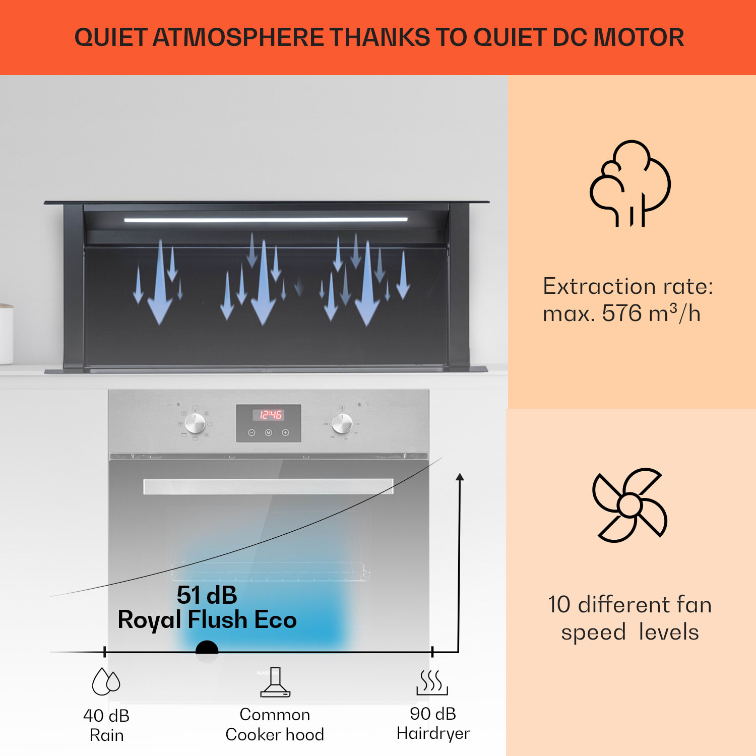 Tento výsuvný digestor je ako eso v rukáve: luxusný Downdraft digestor Royal Flush Eco od Klarstein neodsáva zhora, ale svoju prácu vykonáva priamo tam, kde sa para vytvára, vedľa varnej plochy. Vďaka tomu je mimoriadne účinný a spoľahlivo odstraňuje paru a pachy s prietokom odsávania max. 714 m³/h. Pôsobivé je, že po skončení práce sa jemne a neviditeľne zapustí späť do pracovnej dosky a pôsobí veľmi ušľachtilým dojmom a má obzvlášť elegantný dizajn vyrobený z nehrdzavejúcej ocele a sklokeramiky. A pre väčšiu udržateľnosť sa Royal Flush Eco dodáva k vám domov s obzvlášť malým množstvom plastových obalov.Výkonný, ušľachtilý a neviditeľný digestor: Elegantný Klarstein Royal Flush Eco, skutočný výsuvný digestor.