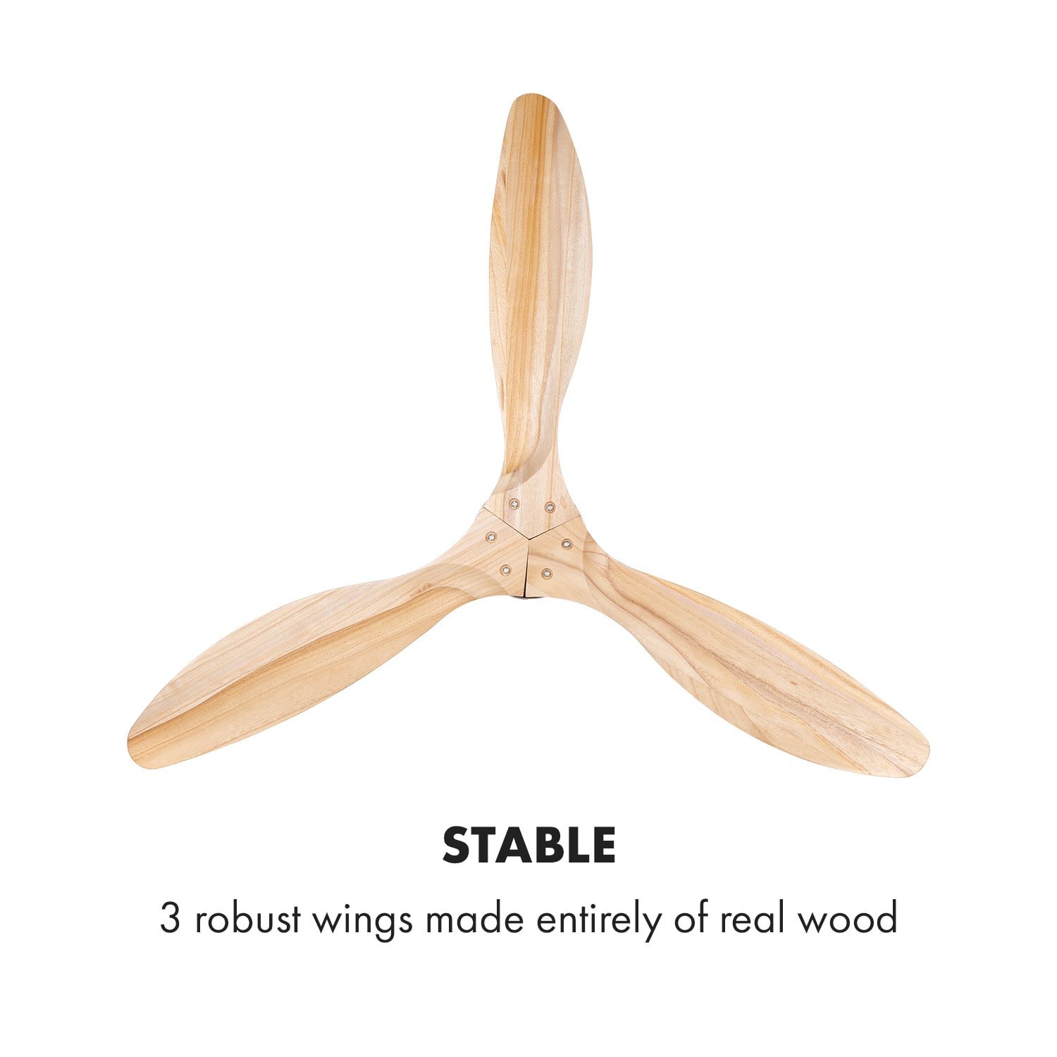 Extra podľa vášho vkusu: Stropný ventilátor Klarstein Santa Elena vám a vašim blízkym poskytne svieži vánok presne podľa potreby.Stropný ventilátor Klarstein Santa Elena s priemerom 52″ (132 cm) a 3 rýchlosťami – vysoká, stredná a nízka – spoľahlivo uvedie do pohybu množstvo lenivého vzduchu jediným stlačením tlačidla. Rozpohybuje až 9 060 m³ vzduchu za hodinu. Jeho tri robustné lopatky z pravého dreva nielenže vyzerajú mimoriadne elegantne, ale sú aj mimoriadne tiché s maximálnou prevádzkovou hlučnosťou iba 45 dB. Štvorstupňový časovač vypnutia s dĺžkou trvania až 8 hodín umožňuje nekomplikovanú prevádzku – napríklad ako ventilátor pri zaspávaní. Okrem toho možno všetky funkcie zariadenia Santa Elena ovládať priamo zdola pomocou diaľkového ovládača. Osviežujúco štýlový: Stropný ventilátor Klarstein Santa Elena zaujme svojimi početnými funkciami a pohodlným diaľkovým ovládaním.Upozorňujeme, že batérie potrebné pre diaľkové ovládanie nie sú súčasťou balenia.
