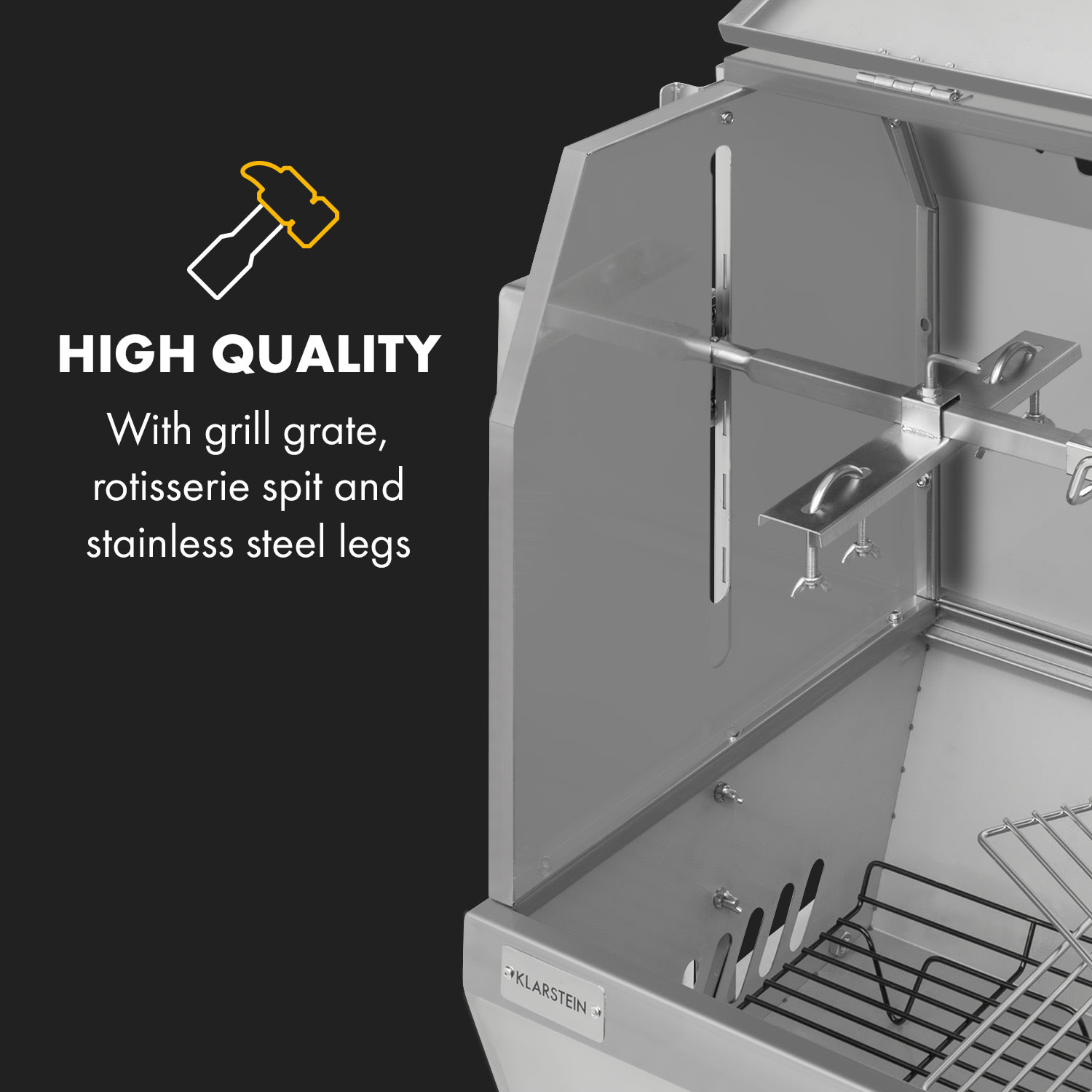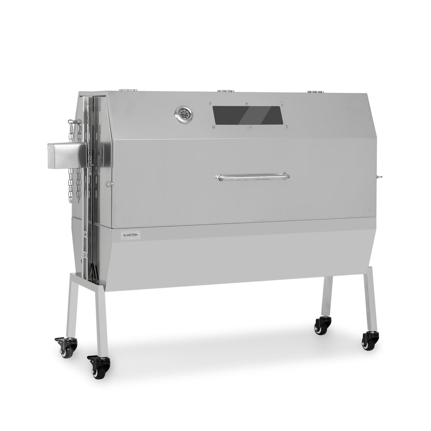 Záhradný gril na prasiatka Sauenland Pro XL od spoločnosti Klarstein zaujme vďaka uzavretému priestoru na varenie svojimi šťavnatými pochúťkami a mimoriadne jemným mäsom.S otočným grilom, grilovacím roštom a pevnými nohami z ušľachtilej ocele je gril na prasiatka Klarstein Sauenland Pro XL nielen veľmi kvalitný, ale tiež sa ľahko čistí vďaka hladkým povrchom. Vďaka dobrej tepelnej izolácii umožňuje uzatvárateľný priestor na varenie dlhý čas varenia pri nízkych teplotách, a preto sa hodí na prípravu jemných a šťavnatých prasiatok, pečených kurčiat a pečienok, ale tiež špecialít pomalého varenia ako „pulled pork“. Vďaka štyrom kolieskam s dvomi integrovanými brzdami sa gril na drevené uhlie aj napriek hmotnosti a vysokej stabilite veľmi ľahko prepravuje, napríklad z garáže do záhrady alebo z miestnosti na náradie na terasu.Špíz grilu na prasiatka z ušľachtilej ocele je poháňaný dodávaným motorom: vďaka konštantnej rotácii zabezpečuje rovnomerný proces varenia a dokonalý pôžitok zo šťavnatého mäsa. Do grilovacej vaničky sa zmestí dostatok uhlia na dlhodobé poskytovanie potrebného tepla. S teplomerom integrovaným vo varnom priestore a okienkom sa dá neustále sledovať teplota a dianie v grile. Vďaka štyrom grilovacím roštom je okrem toho k dispozícii aj veľká grilovacia plocha, čo robí z grilu ideálneho partnera na tradičné BBQ podujatia. Nový dizajn nôh tiež poskytuje grilu ešte lepšie postavenie v rozličných terénoch.Či už ide o rodinné oslavy, párty, alebo firemné výročia: s rotačným grilom Sauenland Pro XL od spoločnosti Klarstein sa podaria rustikálne pečené prasatá, chutné pečené kurčatá a špeciality ako „pulled pork“ naozaj vo veľkom štýle!Upozornenie: gril na prasiatka je dodávaný ako montážna sada.