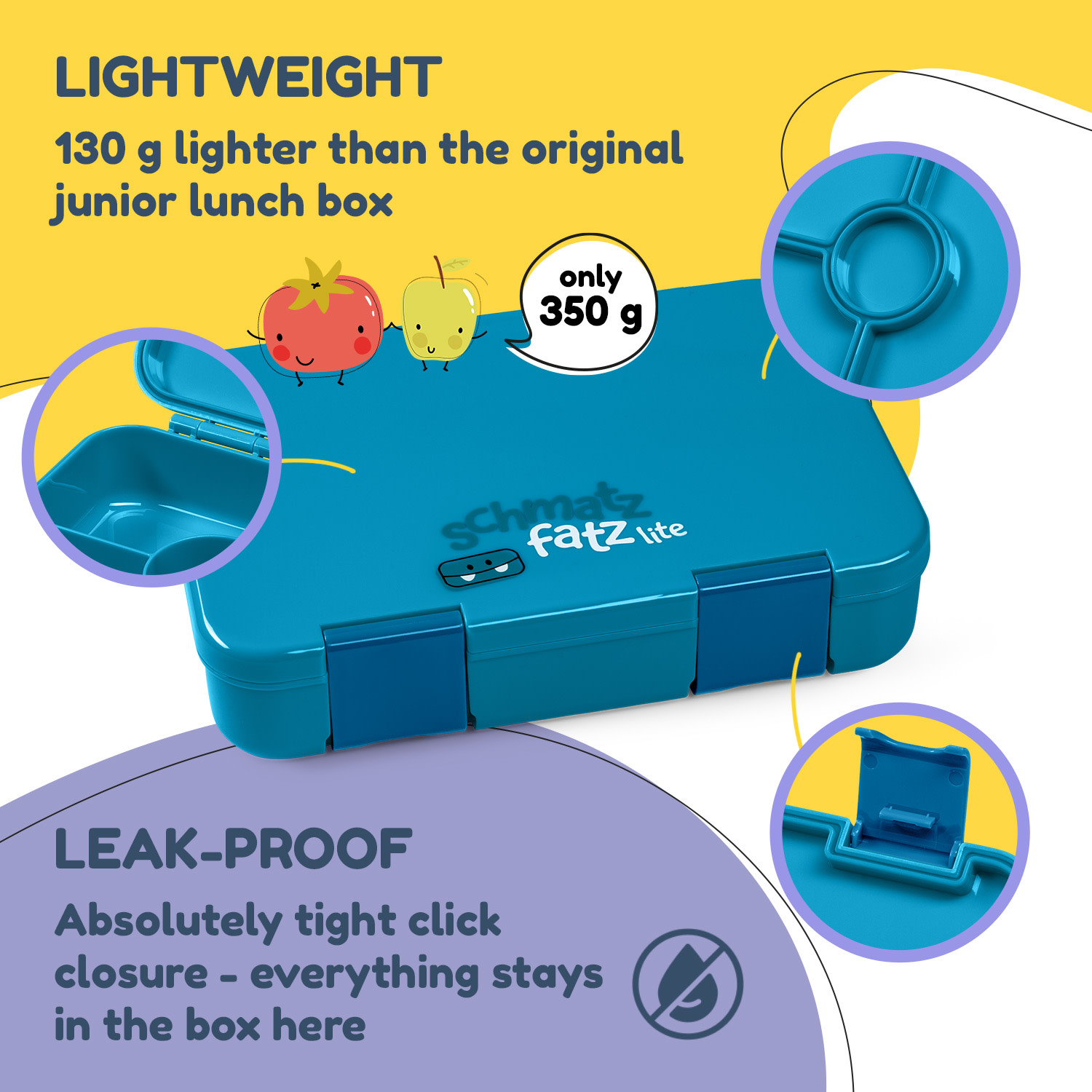 Do škôlky alebo do školy: v obedovej dóze Lite od schmatzfatz by Klarstein zostane každá desiata chrumkavá a čerstvá! Pomocou praktických oddeľovacích vložiek môžete všetky jedla skladovať oddelene. Nič sa nemieša: ovocie chutí ako ovocie, saláma chutí ako saláma a syr chutí ako syr. Malé priehradky sa postarajú o dokonalú arómu. Svojim drobcom môžeš pripraviť chutné ovocie a zeleninu. Stačí ich nakrájať na drobné chuťovky a roztriediť ich do malých priehradiek. Pre zdravý prísun vitamínov každý deň, na výletoch alebo pri malých záchvatoch hladu na detskom ihrisku. A to najlepšie: dóza na desiatu Lite robí česť svojmu menu. Celá je vyrobená z Tritanu a silikónu a váži o tretinu menej ako bežné detské dózy. Všetky časti dózy sú vyrobené z plastu bez obsahu BPA, a preto sú bez chuti či zápachu a zároveň sú úplne zdravotne neškodné.Desiatová dóza Lite od schmatzfatz by Klarstein má samostatný vnútorný uzáver. Bezpečne a vzduchotesne uzatvára jednotlivé priehradky boxu. Vďaka jednotlivo utesneným priehradkám je tento desiatový box veľmi vhodný na husté tekuté potraviny. Môžete teda osladiť svojim deťom deň s jablkovým pyré, krupicou alebo jogurtom. Alebo im jednoducho zabaľte müsli! Vďaka bezpečným chlopniam v prednej časti zostane všetko v krabici – kým to nezjete.Praktická a rozmanitá v každodennom živote detí, pohodlná večer: vďaka premyslenému vkladaciemu systému s odnímateľnými priehradkami sa dá táto dóza optimálne vyčistiť. Zdravá hygiena je zaručená, pretože vnútorné priehradky možno ľahko vložiť do umývačky riadu. Keďže vonkajší box neprichádza do kontaktu s potravinami, možno ho jednoducho utrieť vlhkou handričkou. Vďaka ideálnemu tesneniu môžeš dózu s priehradkami vopred naplniť chutným občerstvením už večer. Mrkva, jogurt, plátky jabĺk, saláma, syr a mnoho iného: každé chutne pripravené jedlo si nájde svoje miesto v dóze na desiatu Lite od spoločnosti schmatzfatz by Klarstein. Olovrant bude tak dlho čerstvý a chutný a zachová sa si svoju chuť.