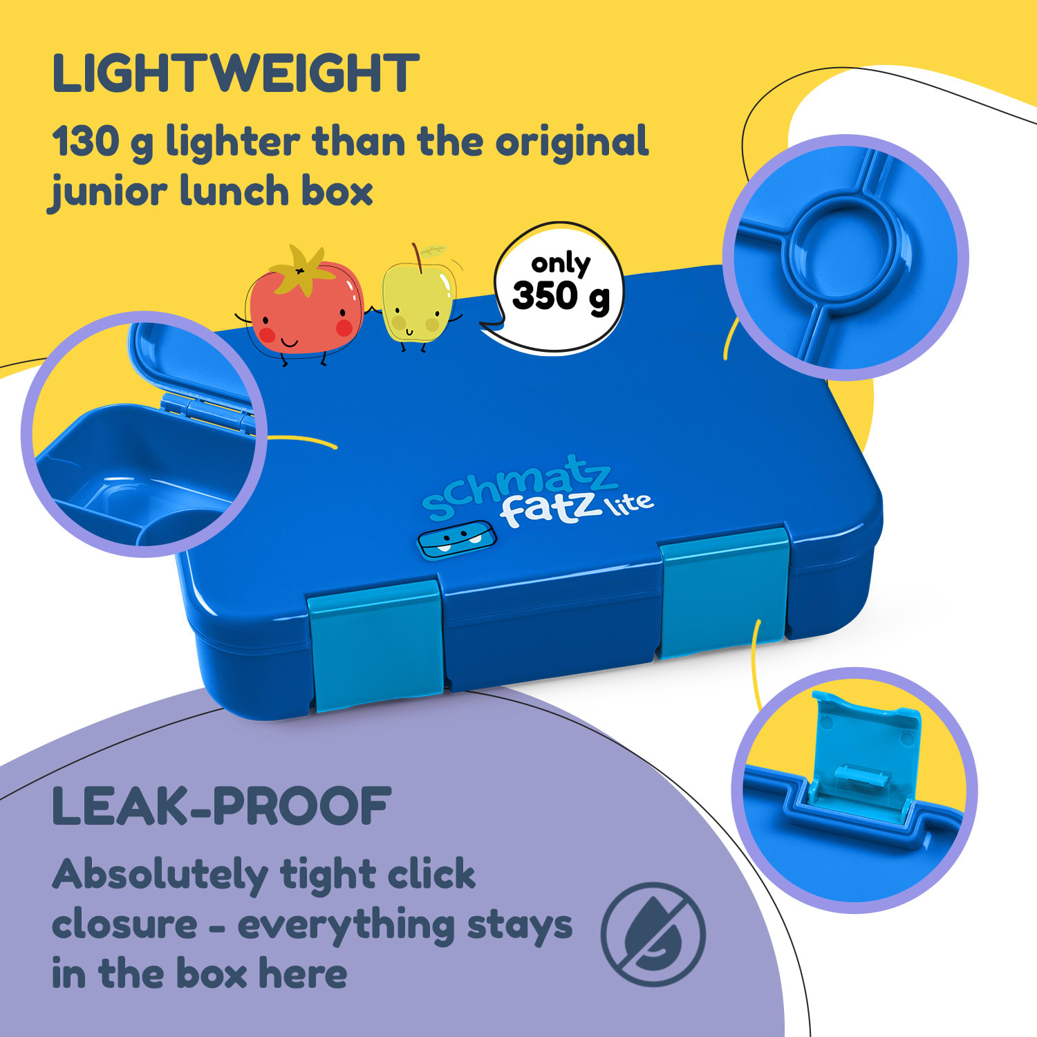 Či už vaše dieťa vyráža do škôlky, školy alebo na výlet, desiatový box Schmatzfatz Lite sa postará o to, aby každé občerstvenie zostalo čerstvé, chutné a prehľadne usporiadané počas celého dňa. Vďaka viacerým oddeleným priehradkám môžete jedlo jednoducho roztriediť – ovocie zostane svieže, syr si zachová svoju chuť a pečivo sa nepremočí. Vnútorný uzáver a vzduchotesné tesnenie zabezpečia, že ani hustejšie potraviny ako jogurt či jablkové pyré sa nevylejú. Box je vyrobený z ľahkého a odolného Tritanu bez BPA, čo zaručuje bezpečné a zdravotne nezávadné používanie. V porovnaní s bežnými desiatovými boxmi váži o tretinu menej, takže nezaťaží školský batoh ani tých najmenších. Údržba je rýchla a jednoduchá – vnútro boxu môžete vyčistiť ručne, vonkajší obal stačí utrieť vlhkou handričkou. Vďaka kvalitnému spracovaniu box vydrží aj pri každodennom používaní.