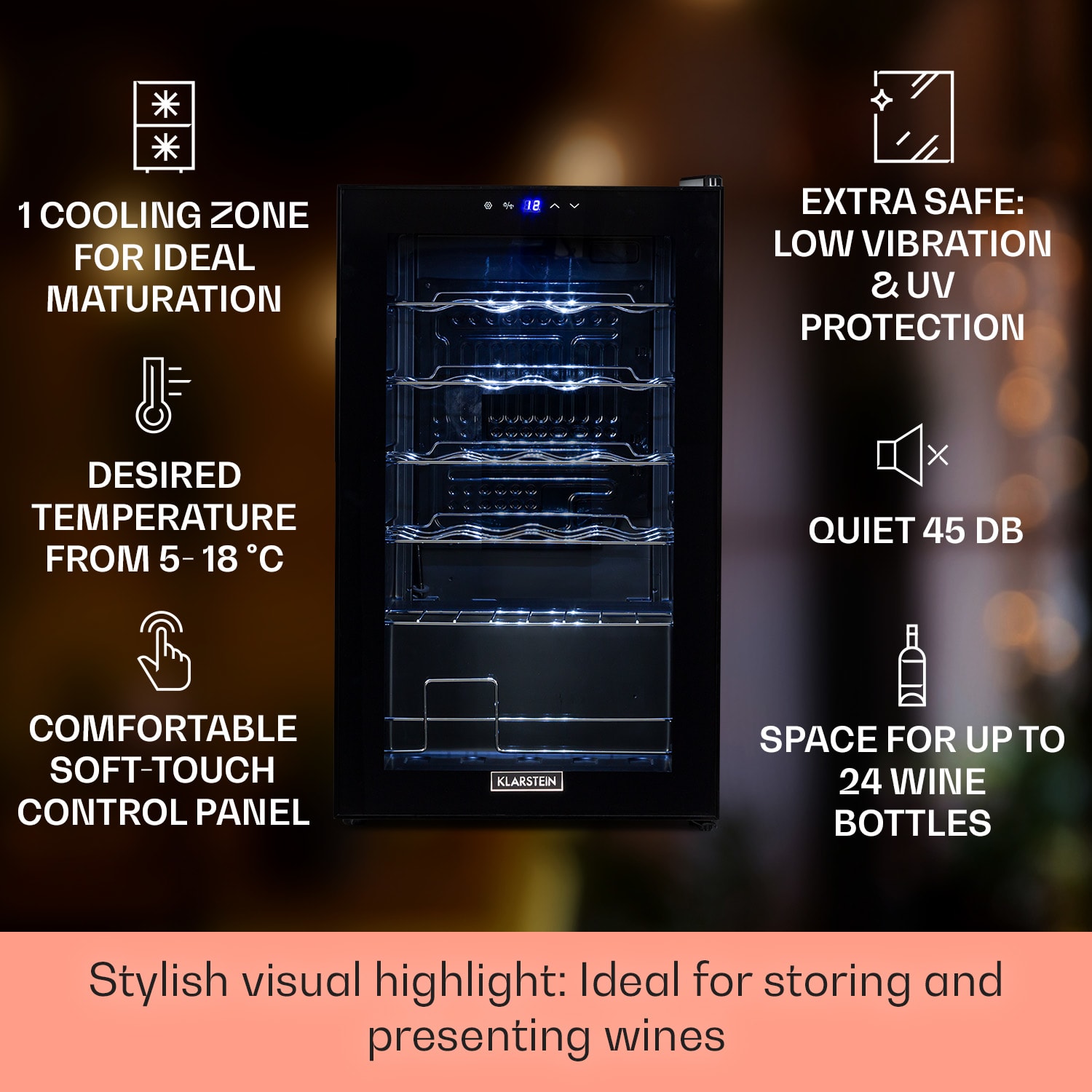 Z lásky k vínu: Vinotéka Klarstein Shiraz 24 Uno sa postará o ten najlepší pôžitok z vína tým, že fľašiam vína poskytne tú správnu teplotu na pitie. Táto vinotéka zároveň vyniká svojím štíhlym dizajnom a skvele sa hodí aj do malých priestorov. Môžete v nej optimálne skladovať až 24 fliaš vína a chladiť ich na teplotu od 5 do 18 °C. Predné dvere z bezpečnostného skla umožňujú nádhernú prezentáciu ušľachtilých fliaš.