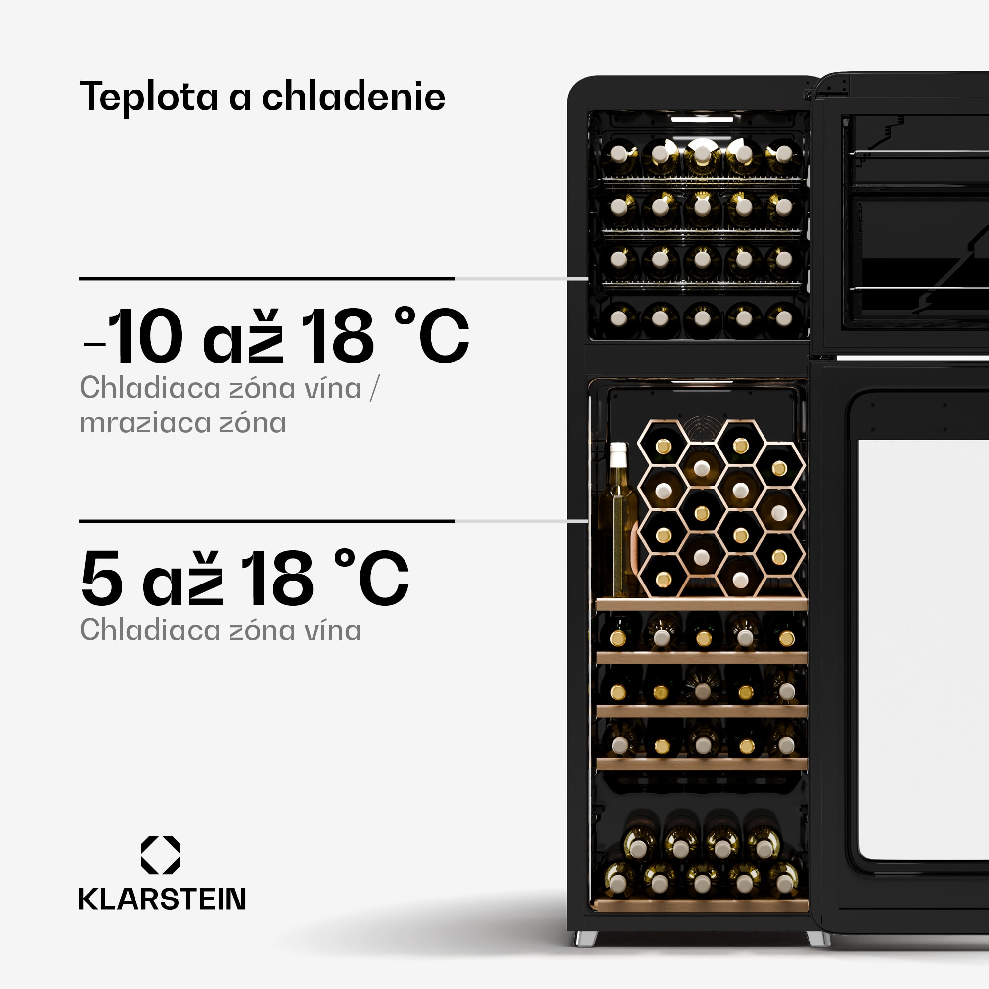 Vinotéka a mraznička Klarstein Shirley spája štýlový vintage dizajn a vysokú funkčnosť vo voľne stojacom zariadení 2 v 1, ktoré poteší milovníkov vína. Vďaka dvom oddeleným chladiacim zónam ponúka optimálne skladovanie červených aj bielych vín, ako aj mrazených nápojov alebo príslušenstva k vínu, napríklad kociek ľadu. Flexibilná, voľne stojaca konštrukcia umožňuje jednoduché umiestnenie bez potreby zložitej inštalácie – ideálne do každej miestnosti, či už do kuchyne, obývačky alebo domáceho baru.Dizajnovo orientované zariadenie zaujme kvalitným retro vzhľadom a bez problémov zapadne do akéhokoľvek prostredia a zároveň vylepší miestnosť. Priestranný interiér chladničky na víno Klarstein Shirley ponúka priestor až pre 60 fliaš vína, ktoré možno skladovať pri ideálnych teplotných podmienkach pre dlhodobé zachovanie kvality. Dvojzónová technológia zabezpečuje skladovanie červených aj bielych vín pri ich optimálnych teplotách. Mraziaci priestor zároveň ponúka možnosť pohodlného chladenia alebo mrazenia nápojov či príslušenstva k vínu.Za osobitnú pozornosť stoja hybridné police, ktoré spájajú stabilitu a estetiku. Kombinácia robustnej kovovej mriežky a štýlovej drevenej prednej časti dodáva chladničke na víno elegantný vzhľad a gumové nárazníky zabezpečujú skladovanie fliaš bez vibrácií. Integrované LED osvetlenie šikovne prezentuje vašu zbierku vín a robí z chladničky na víno s mrazničkou Klarstein Shirley pútavý prvok v každej miestnosti.Doprajte si chladničku na víno s mrazničkou Klarstein Shirley a vychutnajte si svoju zbierku vín a chladené nápoje v prvotriednom, štýlovom zariadení!