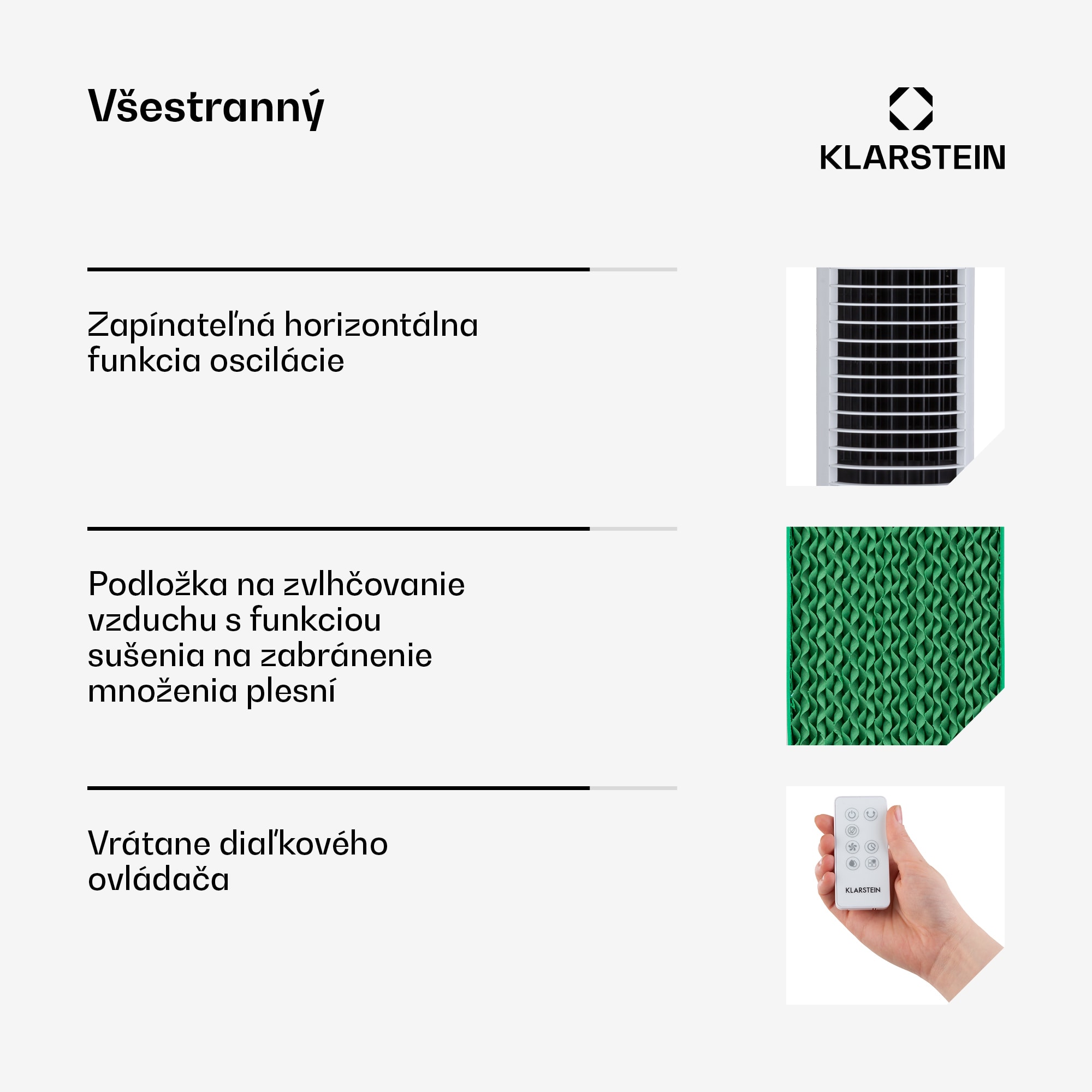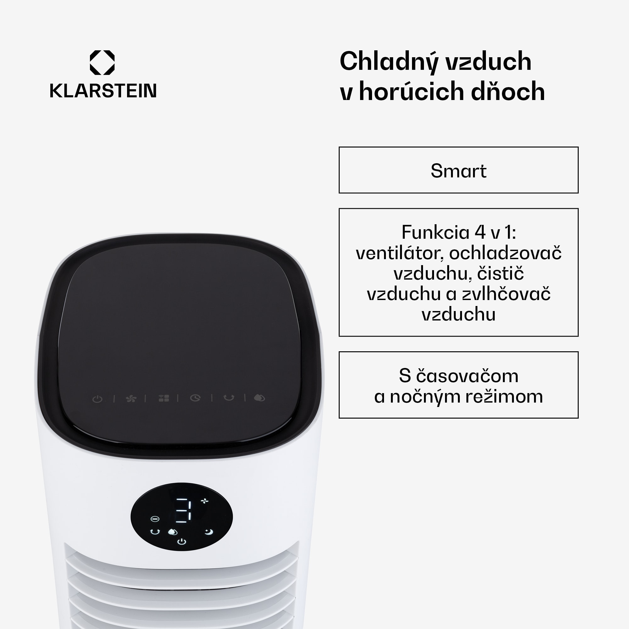 4 v 1 ochladzovač vzduchu Klarstein Skytower Grand Smart s integrovanou WLAN funkciou a ovládaním prostredníctvom aplikácie poskytuje cielené osvieženie ako ventilátor, ochladzovač vzduchu, čistič vzduchu a zvlhčovač vzduchu.Vďaka vysokému prietoku vzduchu 480 m³/h rozhýbe zariadenie Klarstein Skytower Grand Smart ako ventilátor letný vzduch a vytvára príjemný vánok v troch rýchlostiach. Okrem toho si môžeš zvoliť prírodný režim, režim spánku alebo normálny režim V kombinácii s funkciou ochladzovača vzduchu je prúd vzduchu navyše príjemne vychladený a poskytuje osvieženie. Voda sa vtedy odparuje z 8-litrovej nádrže cez podložku na zvlhčovanie vzduchu. Tým odvádza teplo z prúdiaceho vzduchu prirodzeným a mimoriadne energeticky úsporným spôsobom – prúd vzduchu sa stáva príjemne chladným vánkom a precízne osviežuje, či už pri stole, na gauči alebo v posteli. V prípade potreby znižujú teplotu pre ešte väčšie ochladenie dva chladiace akumulátory do vodnej nádrže.Vďaka integrovanej funkcii WLAN sa dá zariadenie Klarstein Skytower Grand Smart ovládať pohodlne cez smartfón pomocou aplikácie Klarstein. Jednoducho si stiahni aplikáciu, vytvor si účet a nakonfiguruj ochladzovač vzduchu v sieti WLAN – teraz môžeš všetky funkcie nastaviť prostredníctvom smartfónu. Ochladzovač vzduchu je okrem toho vítaným pomocníkom nielen v lete: ako zvlhčovač vzduchu skoncuje v zime so suchým vzduchom pri vykurovaní. Ak sa má osviežiť viac ako jedna osoba, môžeš aktivovať horizontálnu automatickú osciláciu zariadenia, ktorá uvoľňuje prúdenie vzduchu rovnomerne do okolia cez 60 cm dlhý otvor.O čistý vzduch sa postará ionizátor, ktorý neúnavne odstraňuje zo vzduchu častice prachu a zápachu, aby bolo dýchanie dvojnásobne oslobodzujúce. Podložka na zvlhčovanie vzduchu sa po použití vysuší vďaka funkcii sušenia, aby sa zabránilo tvorbe plesní a nepríjemného zápachu. Stlačením tlačidla vysokej rýchlosti na 3 sekundy sa dosiahne najvyšší stupeň vetra po dobu 20 minút, potom sa zariadenie automaticky vypne. Vďaka praktickým podlahovým kolieskam je možné ochladzovač vzduchu Klarstein Skytower Grand Smart vziať kamkoľvek so sebou a je okamžite pripravený na použitie. Ovláda sa pomocou smartfónu, pomocou dotykového ovládacieho panela na hornej strane zariadenia alebo pomocou diaľkového ovládača.Inteligentný, výkonný, všestranný a mobilný: ochladzovač vzduchu Klarstein Skytower Grand Smart je osviežujúcou odpoveďou na všetky horúce dni v roku.