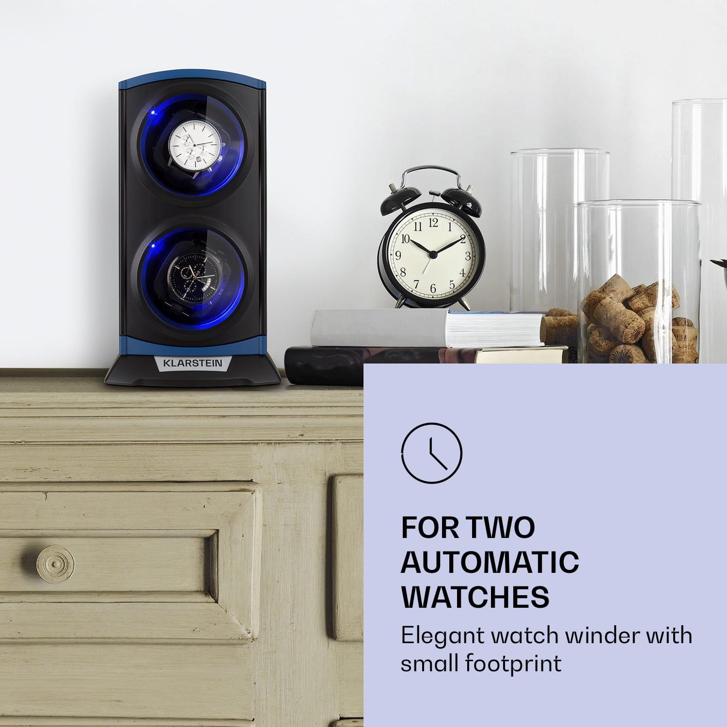 Presnosť nie je náhodná! Naťahovací stojan na hodinky Klarstein St. Gallen Premium bol v elegantnom dizajne starostlivo vytvorený podľa špeciálnych požiadaviek na starostlivosť o hodinky s automatickým naťahovaním. Ten kto vlastní naťahovacie hodinky, by mal brať na vedomie ich správne uskladnenie. Obzvlášť, ak ide hneď o viacero hodnotných kúskov. Naťahovací stojan na hodinky Klarstein St. Gallen Premium Vám pomôže nielen so zachovaním mechaniky hodiniek, ale tiež s ich atraktívnou prezentáciou. Automatické hodinky sa upevnia na dvoch otočných platniach, čím získavajú potrebnú rotáciu, aby sa ich hodinové strojčeky udržali v nepretržitom pohybe, aj keď ich práve nenosíte. Hodinky sú tak zároveň aj štýlovo prezentované. Držiaky na hodinky sú vybavené naťahovacou podložkou, čo umožňuje pevné pripevnenie všetkých hodiniek s remienkami s dĺžkou 17 až 20 cm a šírkou až do 2,5 cm. Štyri voliteľné rýchlosti otáčania rozhýbu otočnú platňu na 650, 900, 1200 alebo 1500 otáčok za deň. Samostatne môžete nastaviť požadovaný smer otáčania v smere pohybu hodinových ručičiek, proti smeru pohybu hodinových ručičiek alebo aj v obojsmernom chode. Vďaka tomu máte more možností na dokonalé prispôsobenie naťahovacieho stojana požiadavkám Vašich automatických hodiniek. K dokonalému skladovaniu hodiniek však nepatrí len technický aspekt: hodinky s automatickým naťahovaním chcú byť a mali by byť videné! Elegantný dizajn naťahovacieho stojana na hodinky Klarstein St. Gallen Premium na to nezabúda. Jeho kryt z odolného plastu s luxusnými lesklými prednými dvierkami ponúka najlepší možný výhľad na hodinky vďaka dvom okienkám z akrylového skla. LED osvetlenie dáva hodinkám elegantný nádych a prezentuje ich v tom správnom svetle. Nenechávajte prezentáciu svojich hodiniek a starostlivosť o ne na náhodu: v naťahovacom stojane na hodinky Klarstein St. Gallen Premium budú Vaše hodinky bezpečne a reprezentatívne uskladnené.